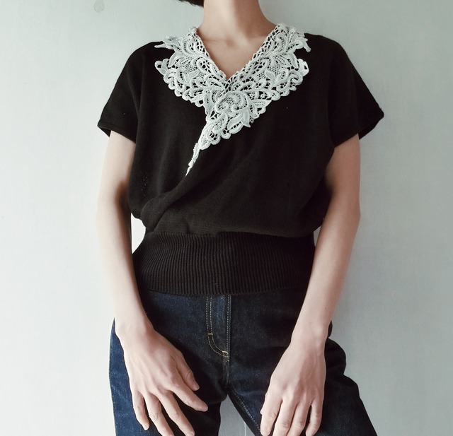 レース襟が可愛いサマーセーター。 レースの襟にはパールビーズがついています。 着画モデルは156cm,Sサイズです。 Size ? 実寸 すべて平置きで(cm) 着丈53 裄丈32 身幅49 Material レーヨン55% 綿45% Color 黒、白 Condition 古着ですので使用感はありますがダメージがみられることなく綺麗な状態です。古着になれていない方はご遠慮くださいませ。 裏地/透け感 なし/少しあり 伸縮性 少しあり 【備考】 ※お買い求めの際は「特定商取引法に基づく表記」を必ずご確認ください。 弊店古着を扱っております。商品チェックはご紹介前に十分に確認しておりますが、見落としたダメージなどある場合がございます。 used商品は見る方によって状態の価値が異なりますので、ご理解の上よくご検討ください。 画像の色はブラウザや設定などにより、実物の色と若干異なる場合がございます。 店頭でも販売しておりますので、売り切れの場合はご了承くださいませ。 商品の状態等、その他ご不明な点等ございましたらお気軽にお問い合わせくださいませ。