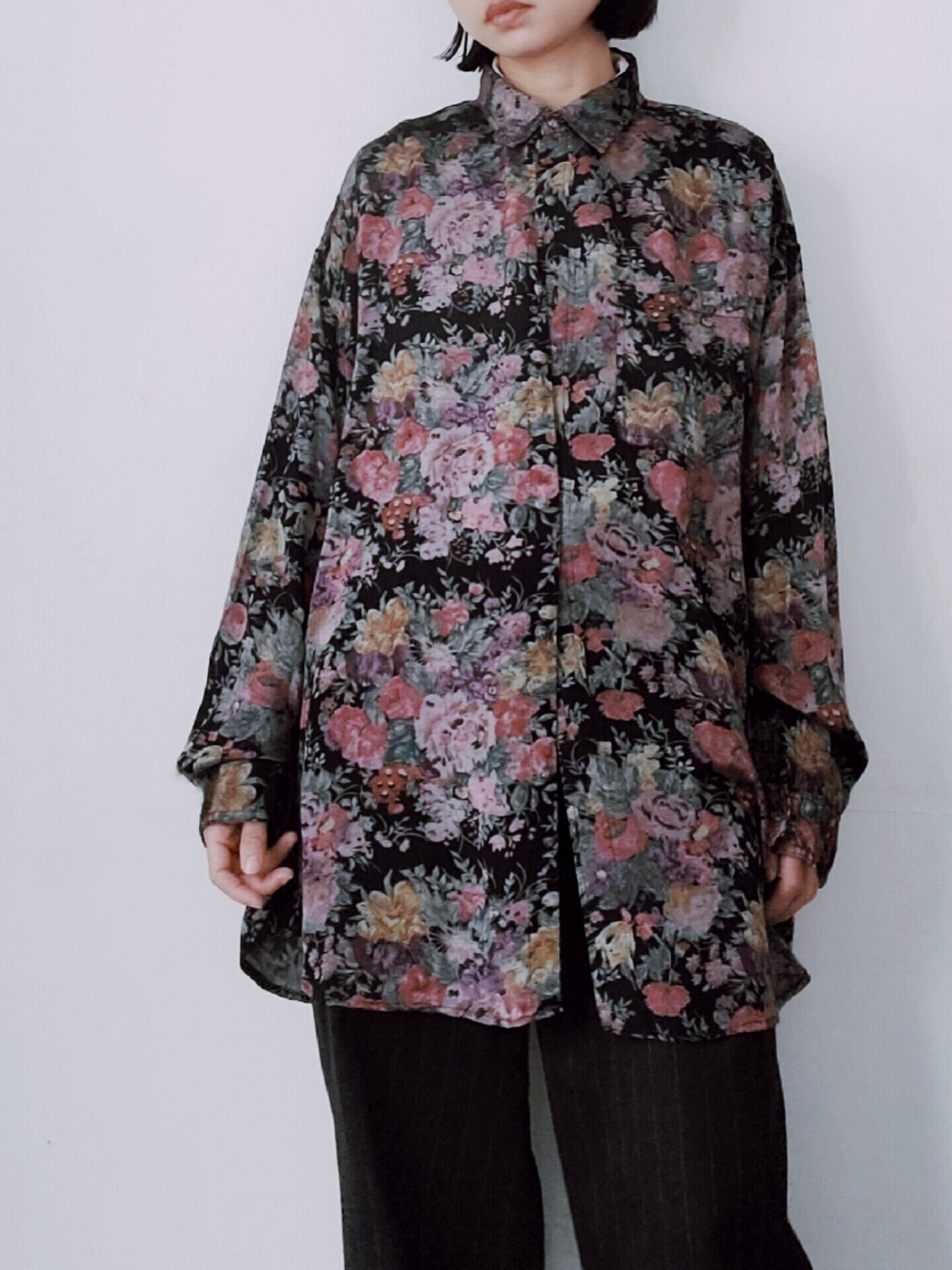 ほんのり光沢のある素材の花柄シャツ。レトロな配色と滑らかな肌触りが魅力。ゆったりシルエットで軽やかに纏えます。