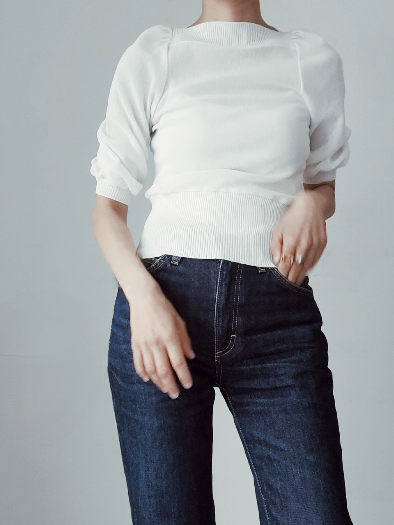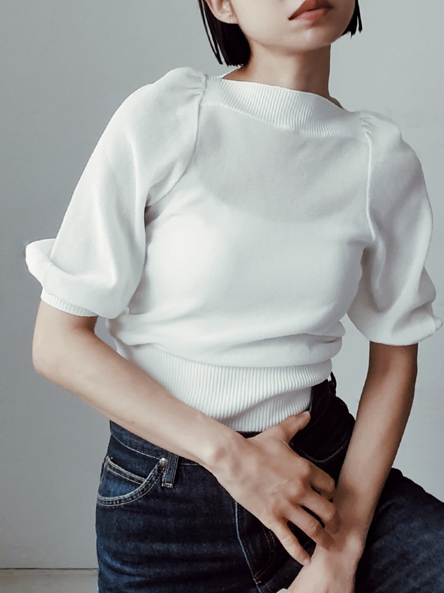 直線的なネックラインが首元をすっきりと見せ、ウエストのリブが身体のラインをやさしく引き立てます。ほんのり甘さを含みながらも洗練された佇まいに。単色でありながら、シルエットやディテールでしっかりと個性を感じさせるアイテムです。