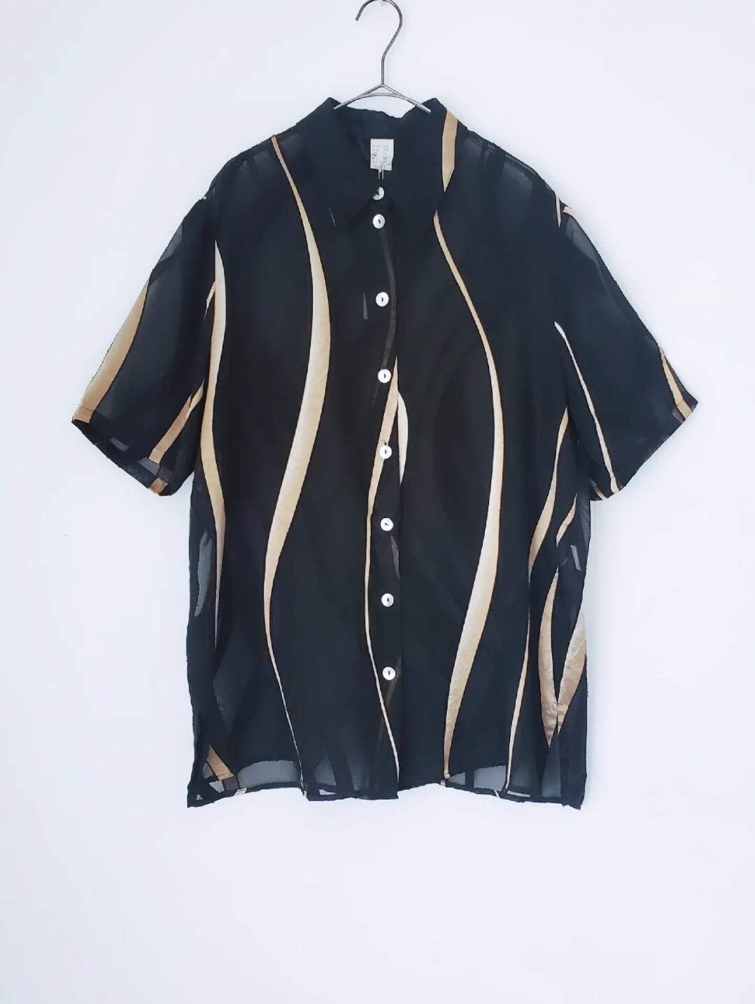 黒地に美しいゴールドの模様が施されたドイツのヴィンテージシアーシャツ。大きめのシルエットが特徴で軽やかな着心地を実現しています。シェルボタンがアクセントとなり、シンプルながら洗練された印象を与える一枚です。