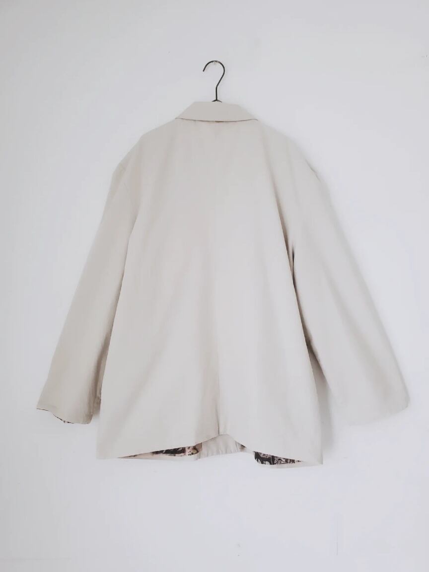 フィンランド製のライトジャケット。軽やかなコットン生地でさらりと羽織れる一枚です。ウエストマークでメリハリをつけても、オーバーサイズのシルエットをそのままラフRに着るのも◎裏地も遊び心ある仕上がりなので、袖をロールアップしてライナーを見せるスタイルもおすすめです。