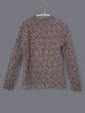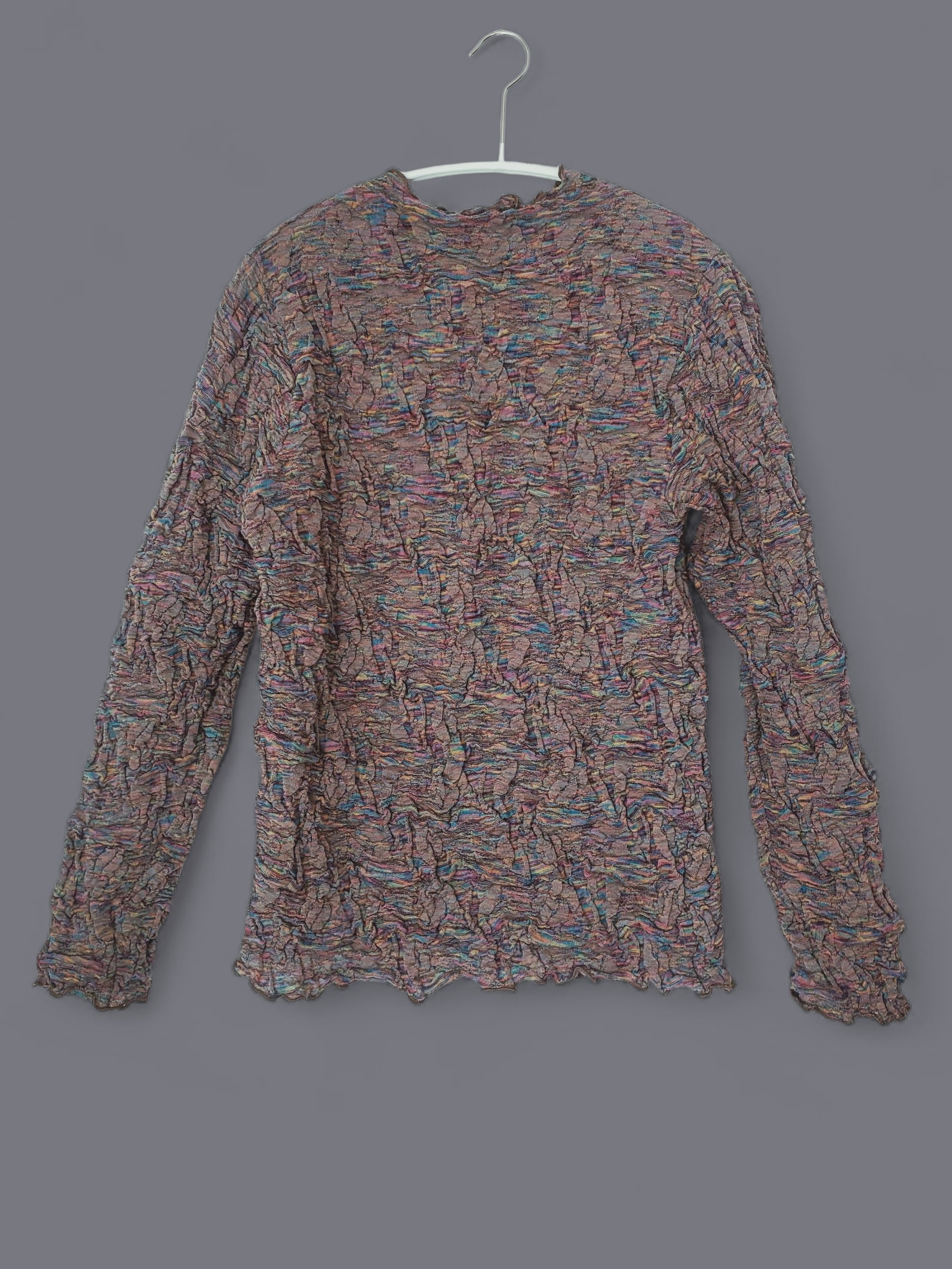 国内古着のマルチカラーの長袖トップス。伸縮性のあるカットソーで、体に沿うようなシルエットが魅力です。落ち着いたカーキをベースにしたカラフルなデザインは、どんなスタイルにも取り入れやすく、1枚でもレイヤードでも楽しむことができるアイテムです。