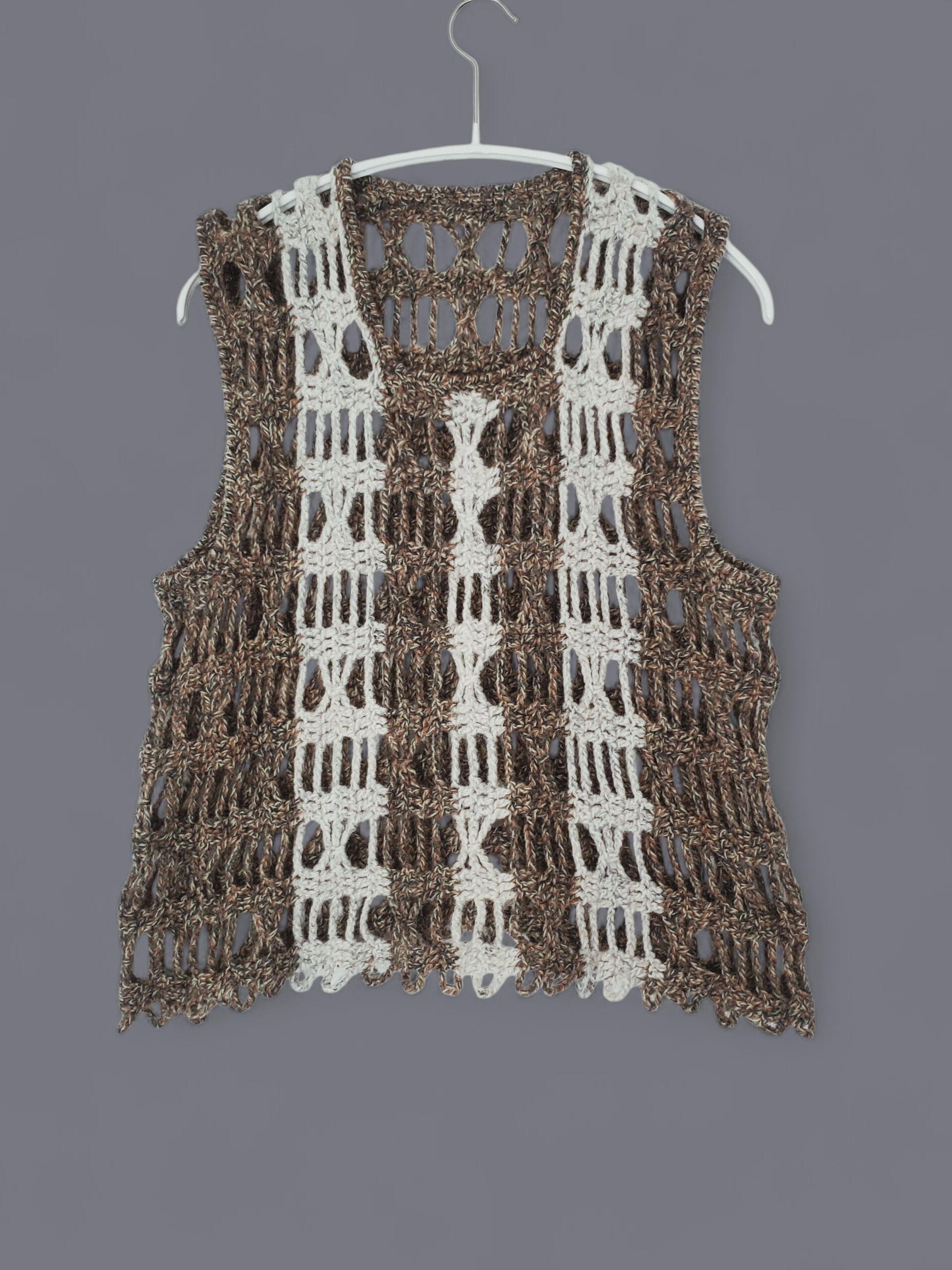 大きな編み目が特徴的なプルオーバーざっくりベスト。カーキと白の二色展開で、それぞれの糸に混じり合う色合いが絶妙なアクセントを加えています。秋冬のレイヤードスタイルにおすすめです。