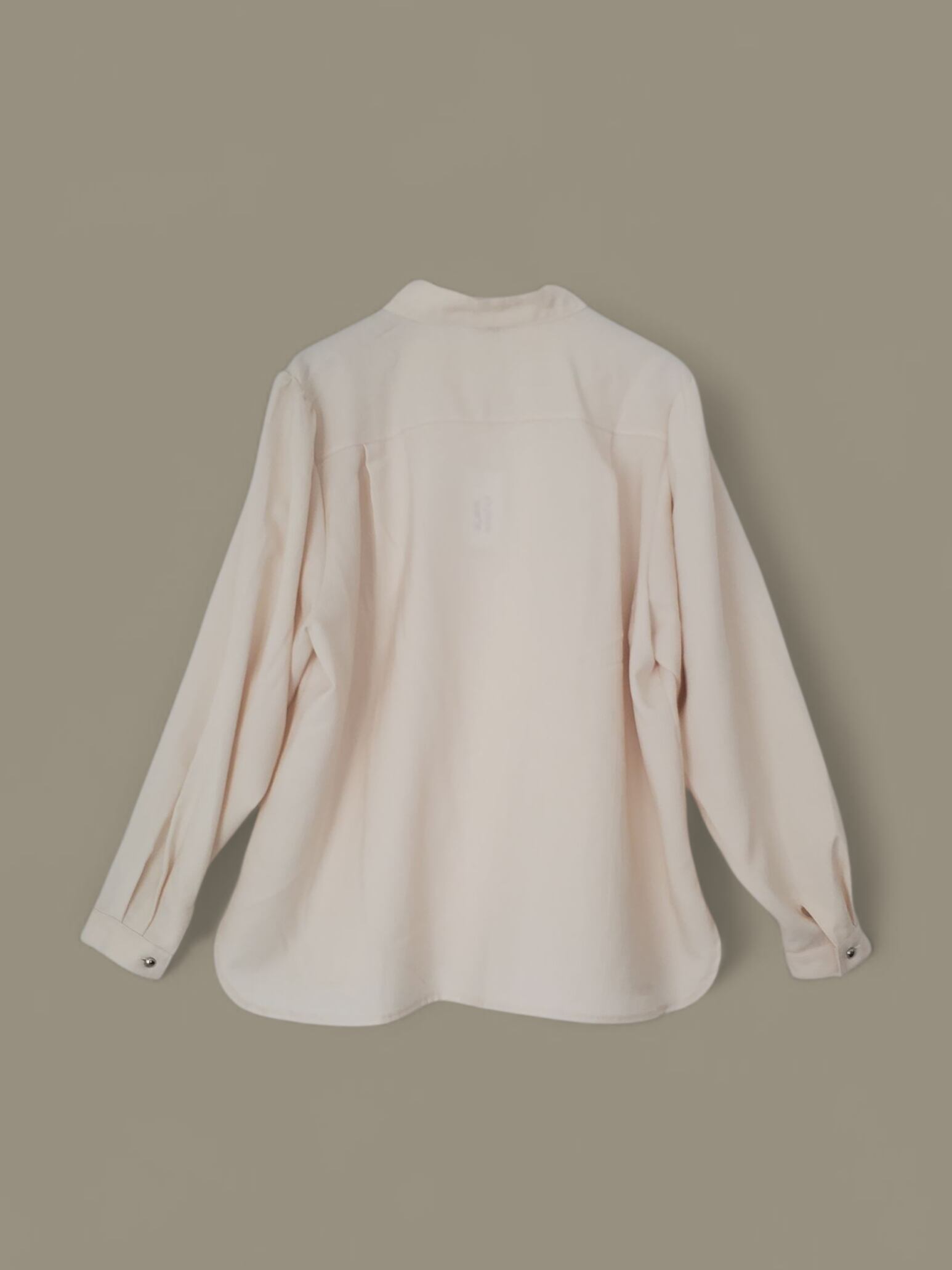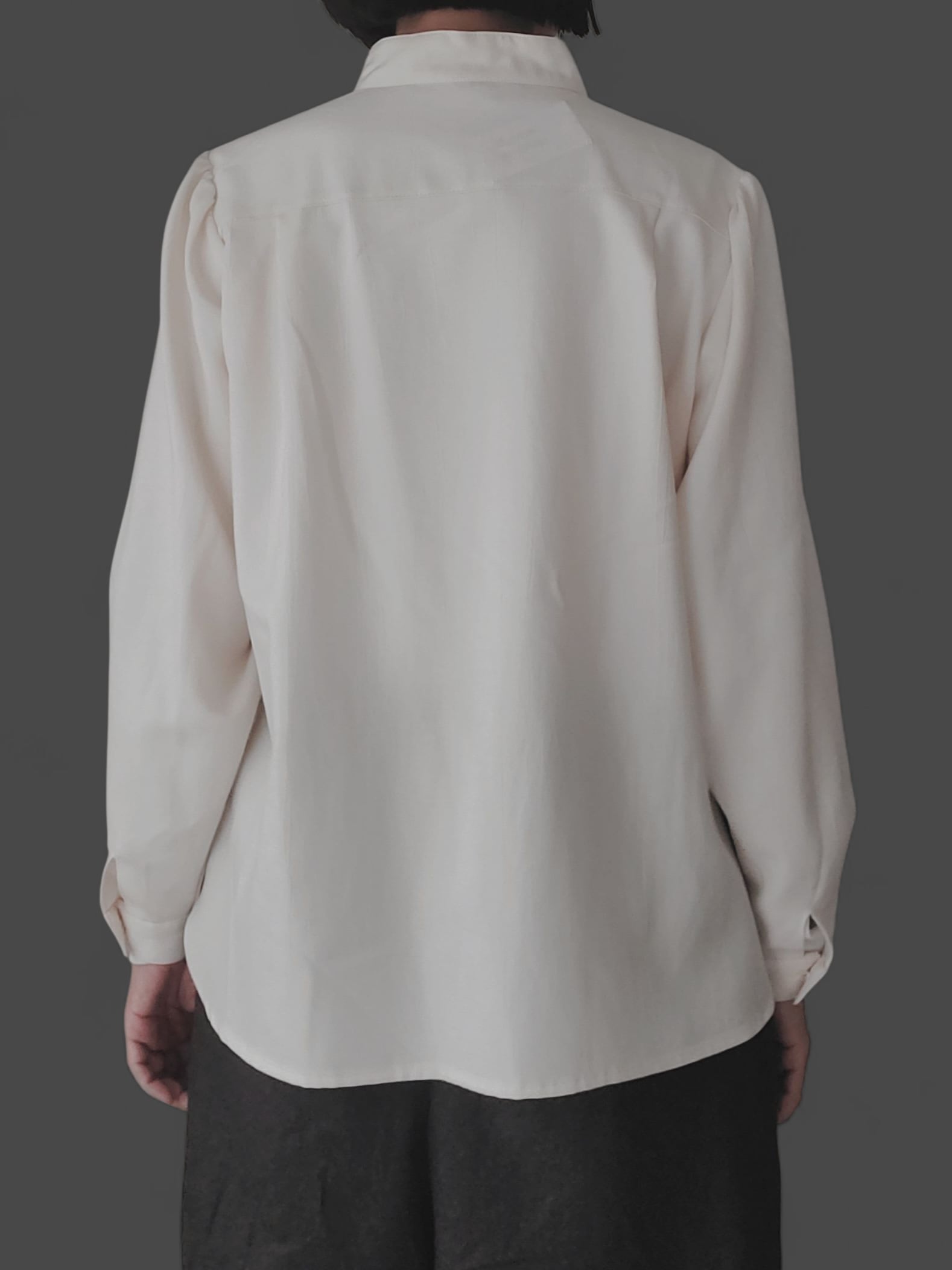 スタンドカラーのアイボリーブラウス。シンプルながらも、シルバーのボタンがアクセントを加えモードな印象を与えます。日本製の古着ですっきりとしたシルエットは、様々なスタイルに合わせやすく幅広く活躍するアイテムです。