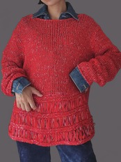 赤を基調にピンクやパープルが混ざり合う美しい配色のニット。軽やかなコットンのような素材感で、暑さが残るこの季節にぴったりな一枚です。裾は特別な織り方が施されており、デザイン性が高く、肩の力が抜けるようなゆったりとしたシルエットが魅力です。