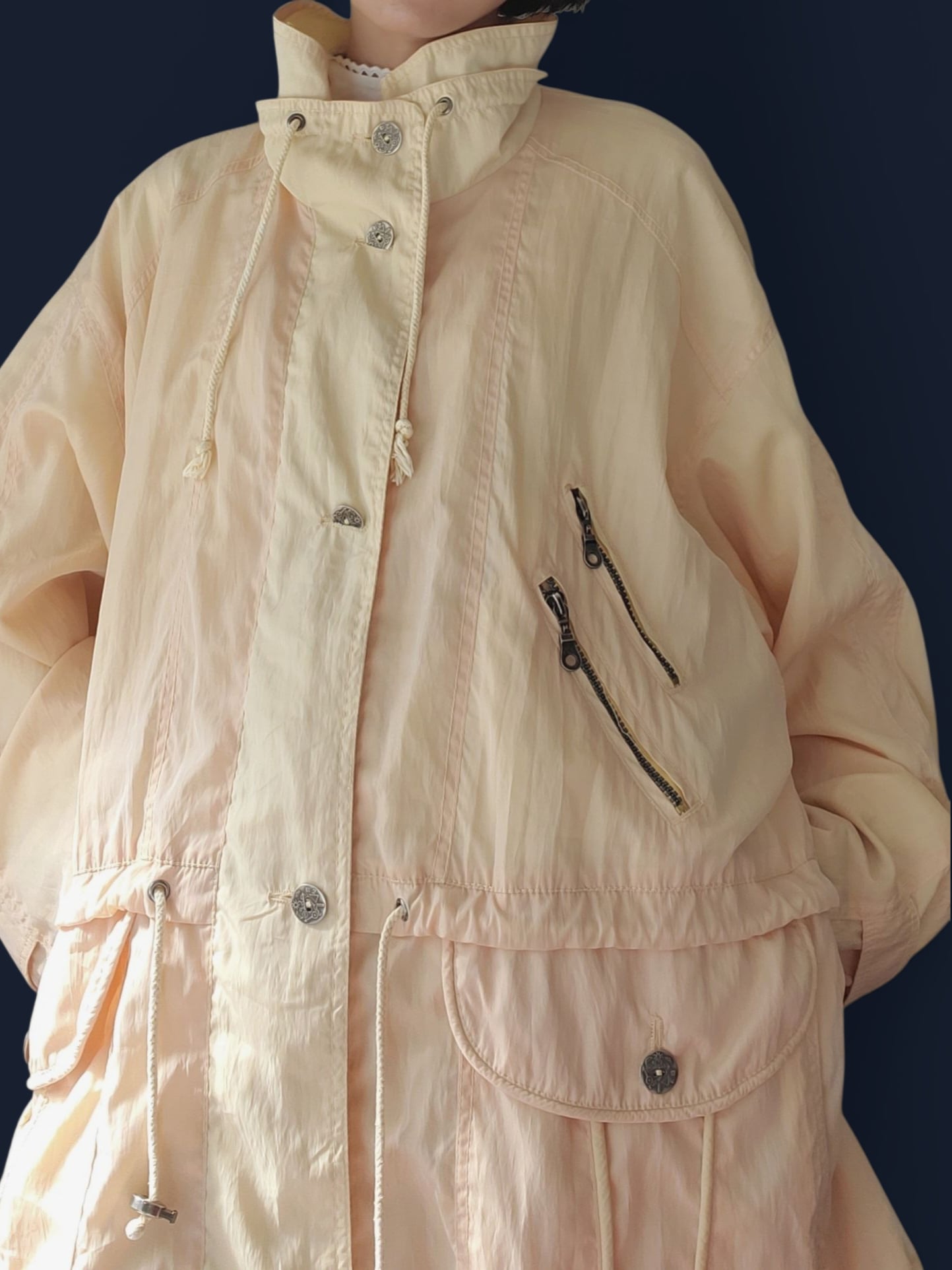 スポーティーなデザインが目を引くナイロン製のライトコート。ユーロサイズ46と大きめなので、オーバーサイズがお好みの方におすすめです。