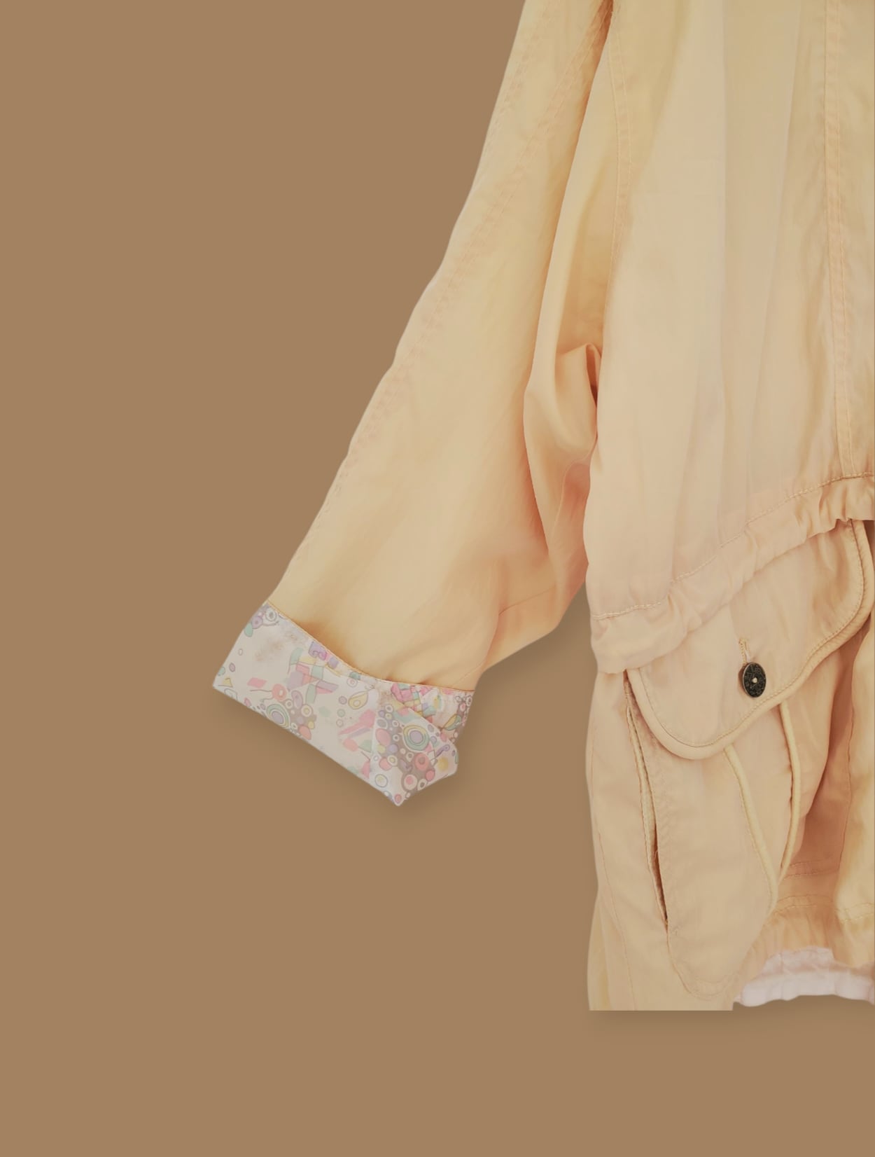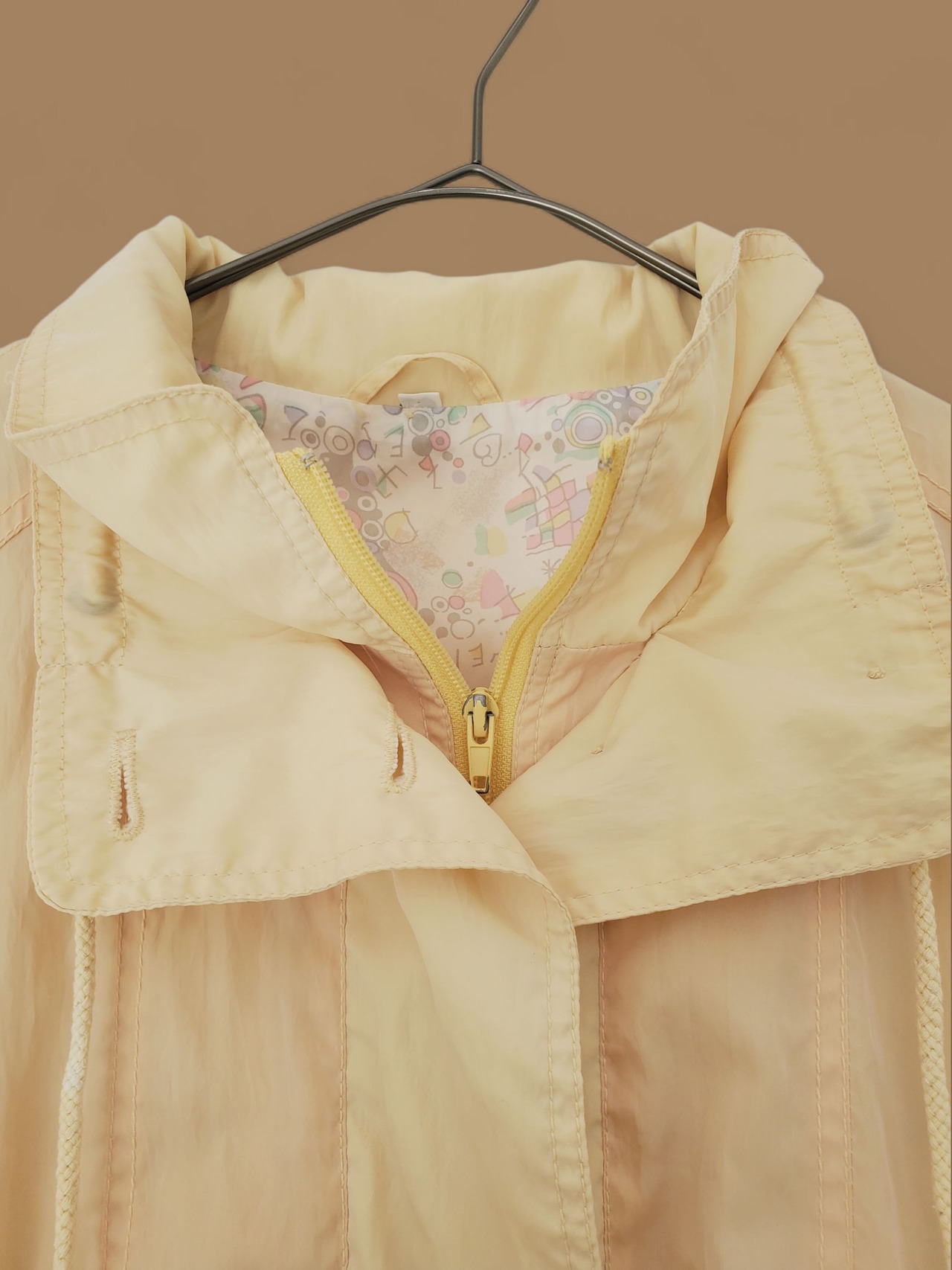 黄色と薄黄色の控えめなツートーンカラーが◎ドローストリング付きなので、ウエストの調整も簡単。可愛い裏地が施されており、袖を折り返すスタイルでも魅力が際立ちます。
