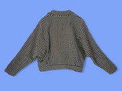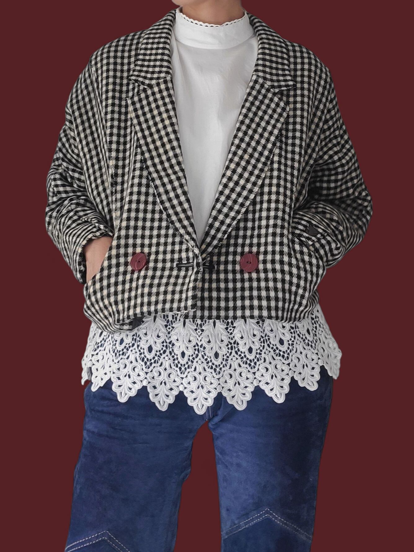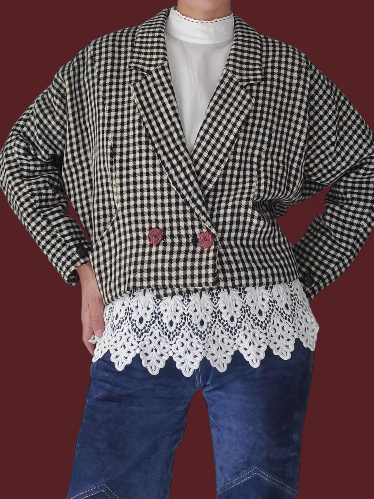 国内ヴィンテージのクロップドチェックジャケット。ダブルブレスト仕様で、ドルマンスリーブのボリューム感が魅力的です。モノトーンのチェック柄とデザインがどこか懐かしさがあり、キュートな魅力のあるアイテムです。