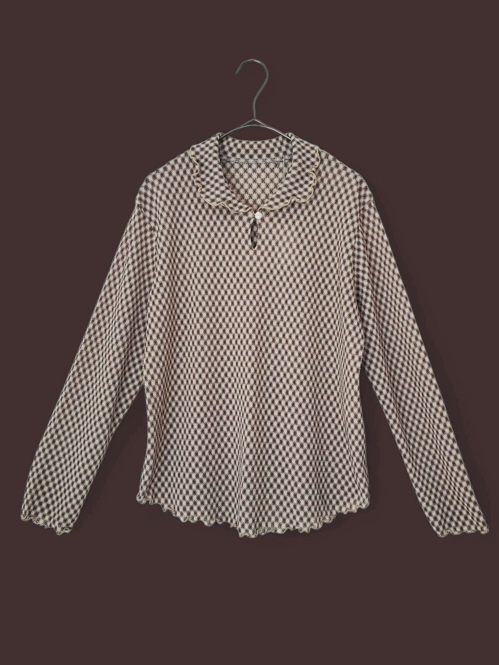 柔らかなベージュと茶色の色合いが特徴的なカットソー。メロウヘムが施されており、さりげないかわいさを引き立てます。シンプルながらもレイヤードコーデにぴったりで、さまざまなスタイルに合わせやすいアイテムです。