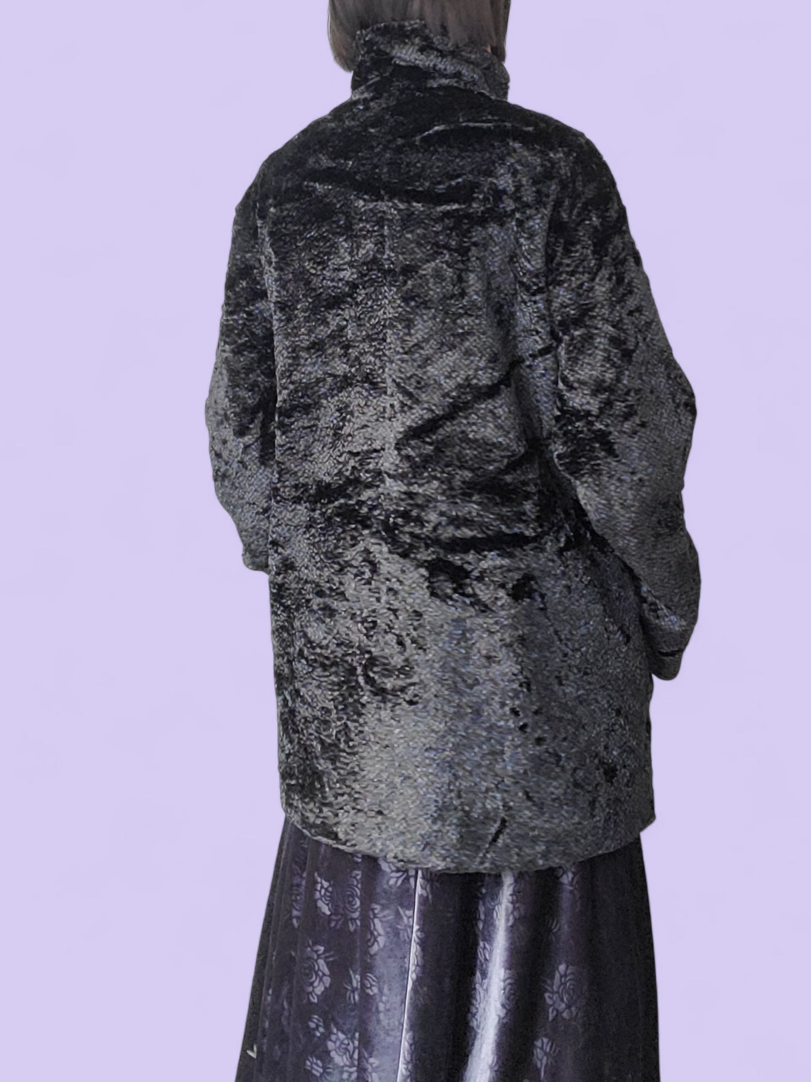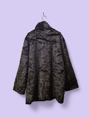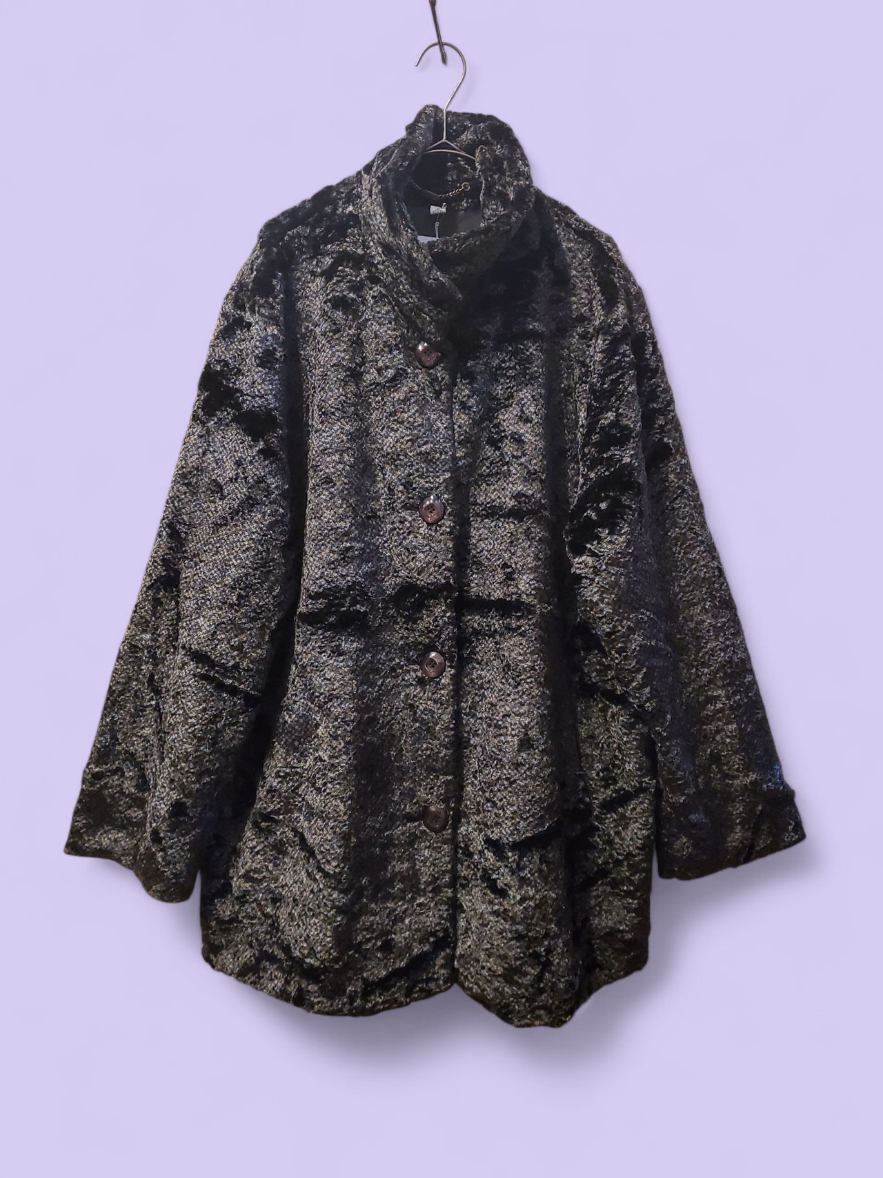 ドイツより入荷したAラインのベロアコート。艶感のある黒をベースに、ブルーやブラウンが混ざった生地が魅力的です。大きなボタンがアクセントとなり、上品で可愛いらしさのある一着です。