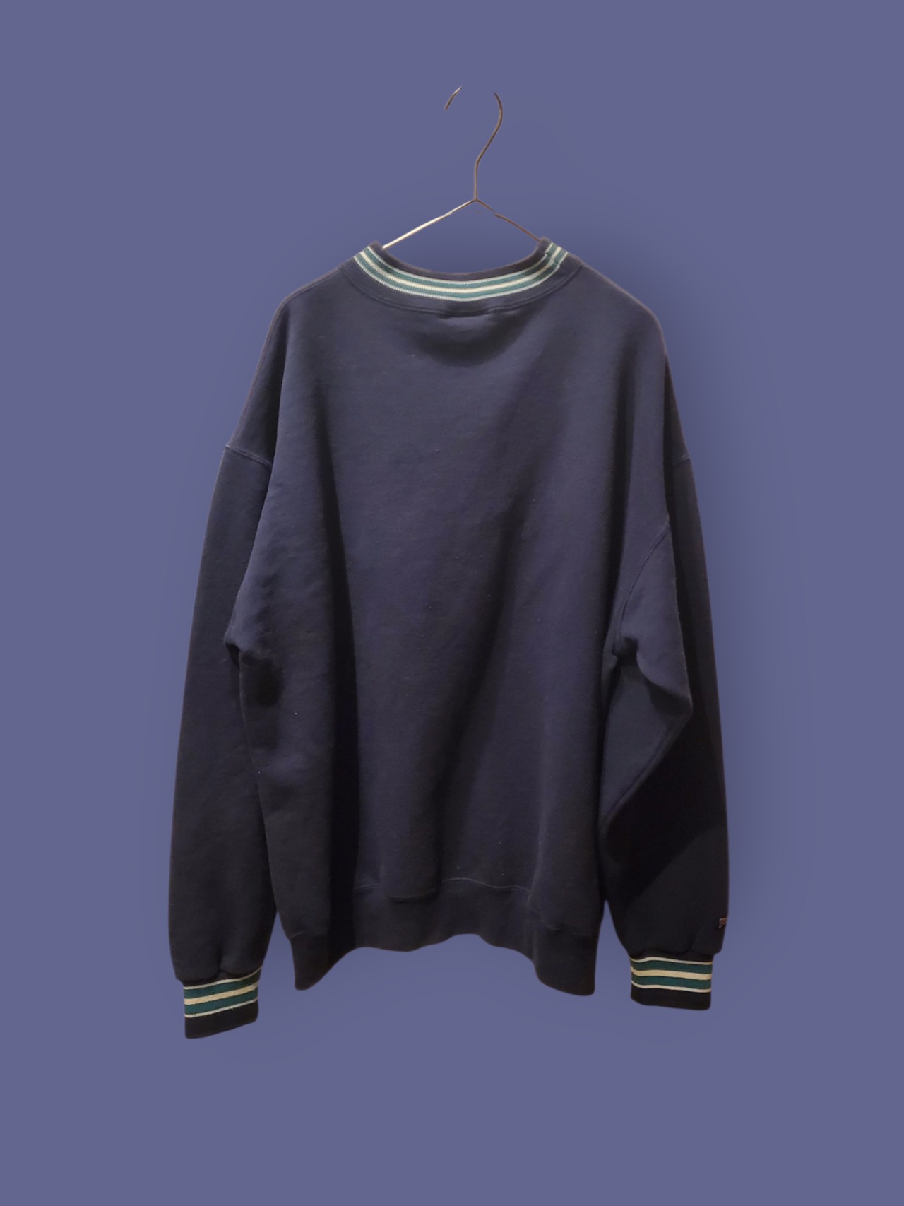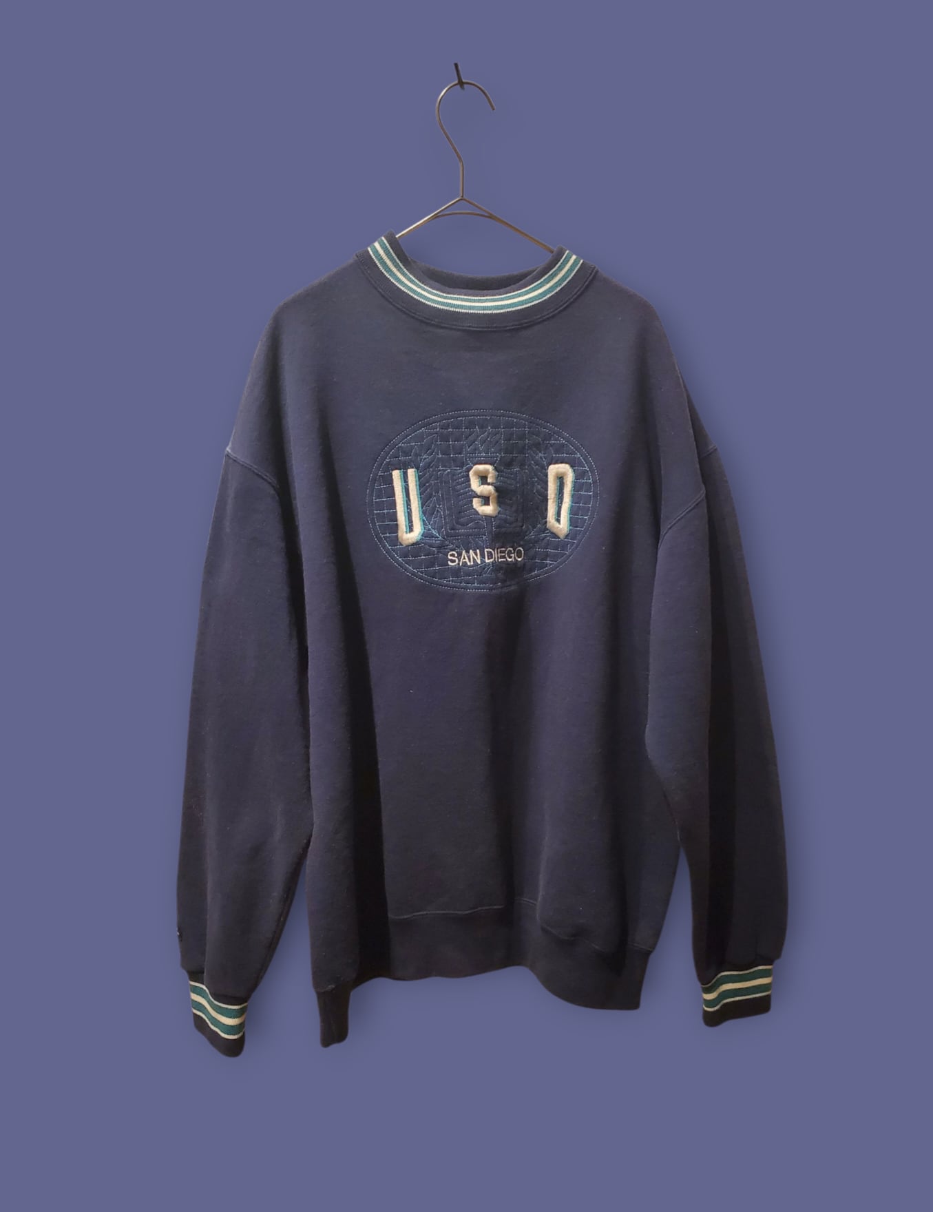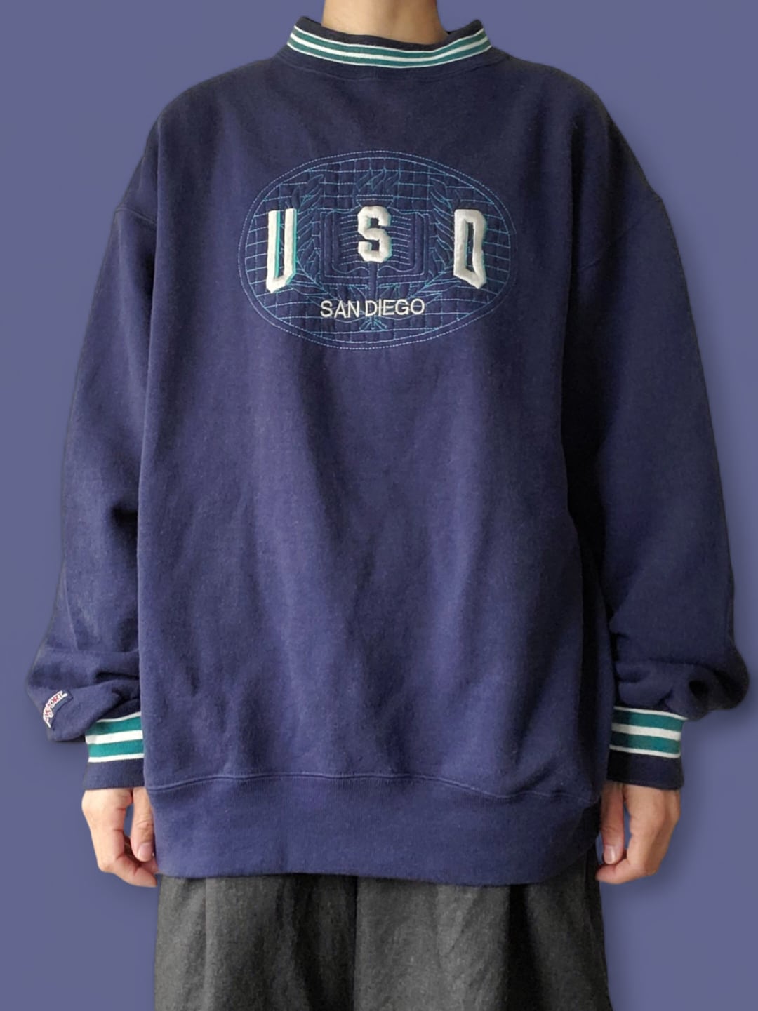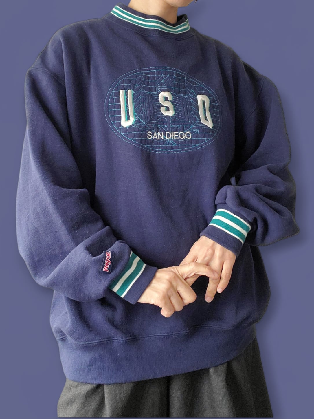 USA made ”USD””カレッジスエットシャツ。手首と首回りにはアクセントとなるラインが施されています。しっかりとした生地は着心地も抜群で、よれた感じもなくコンディション良。