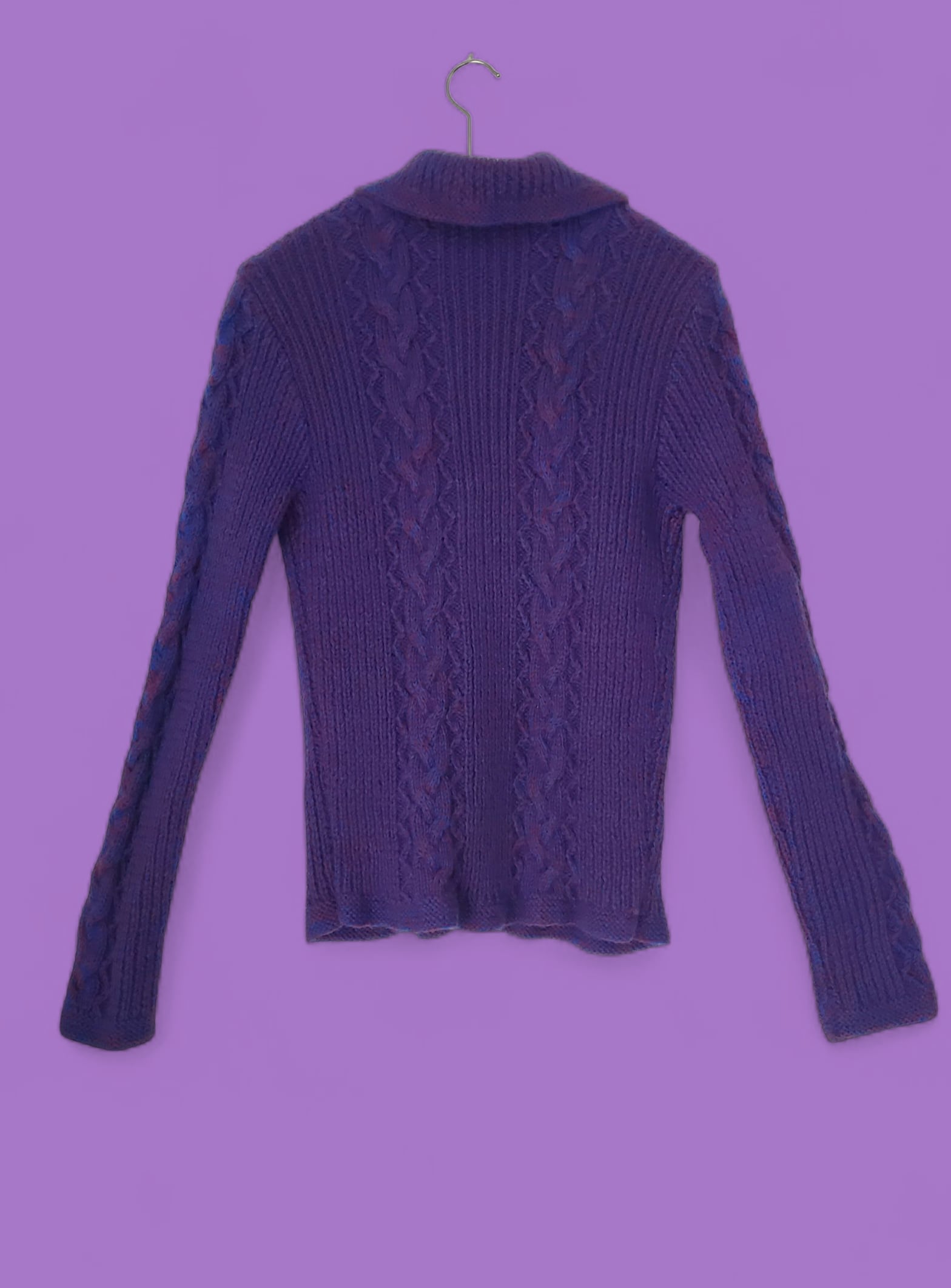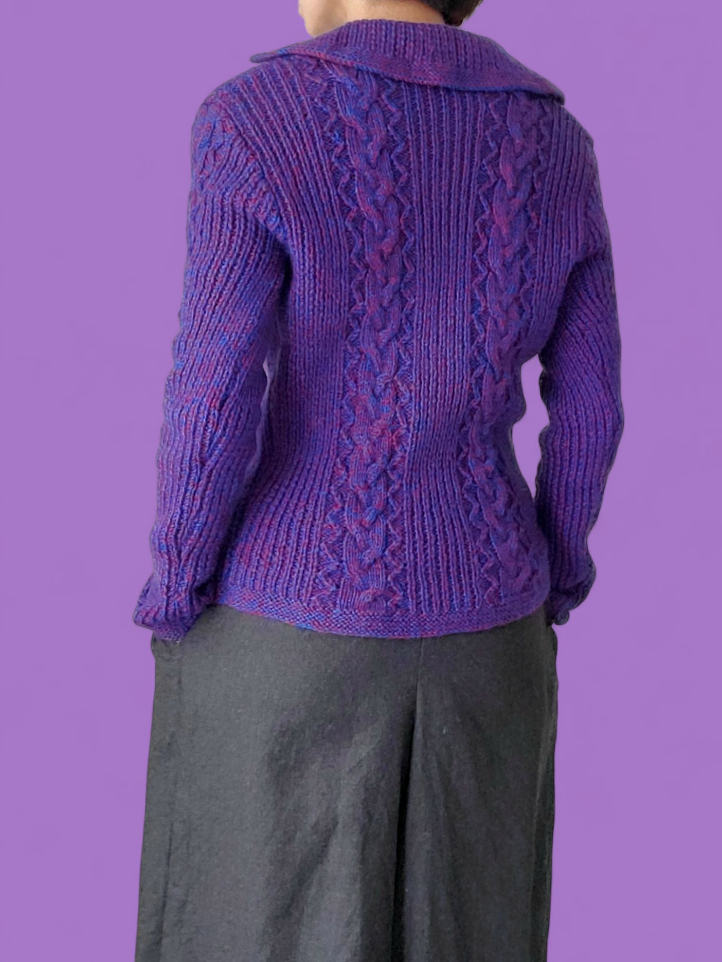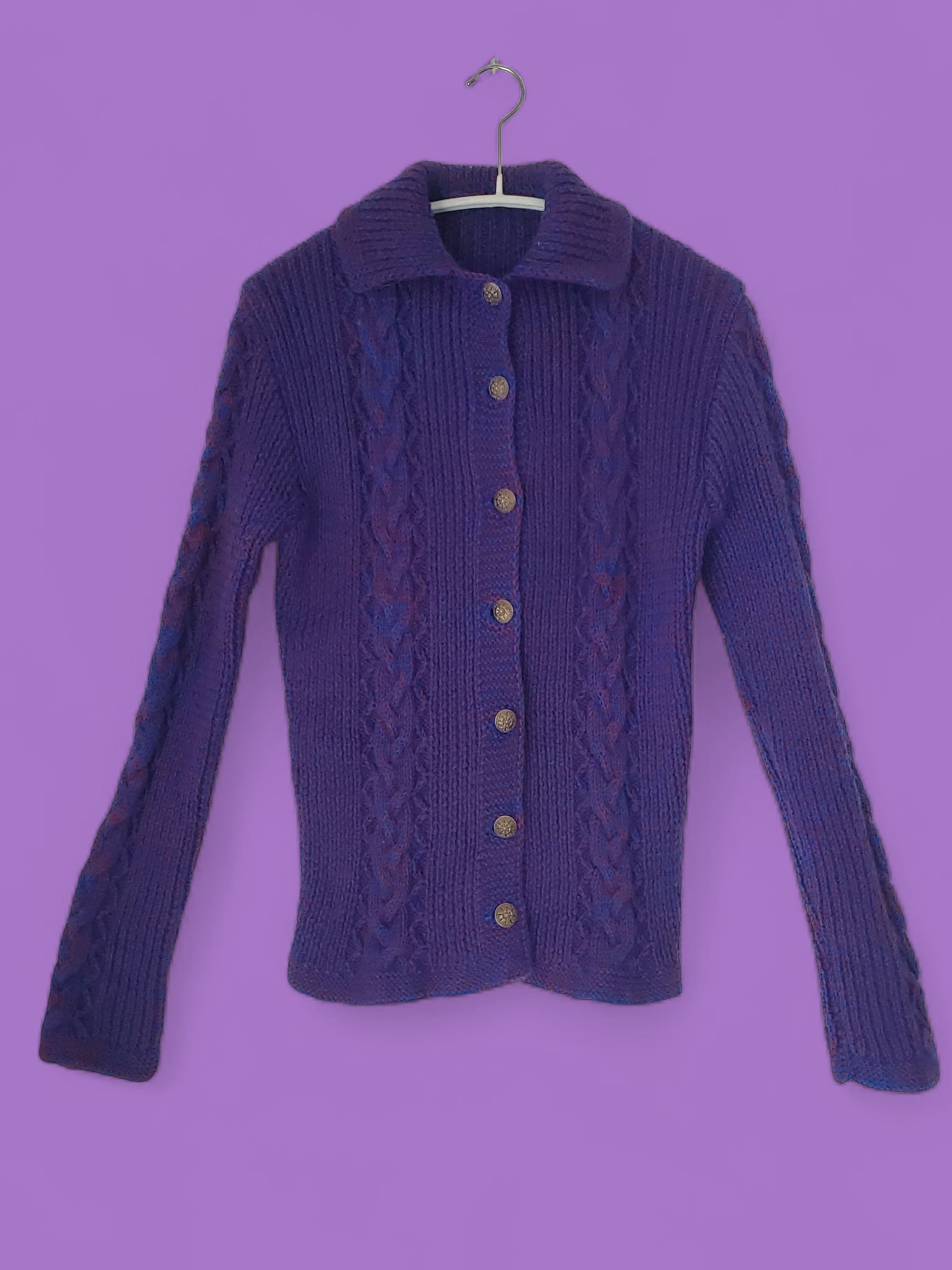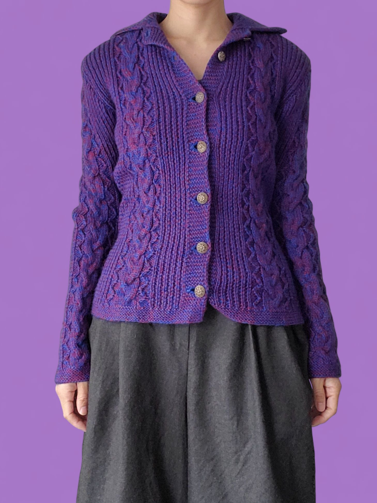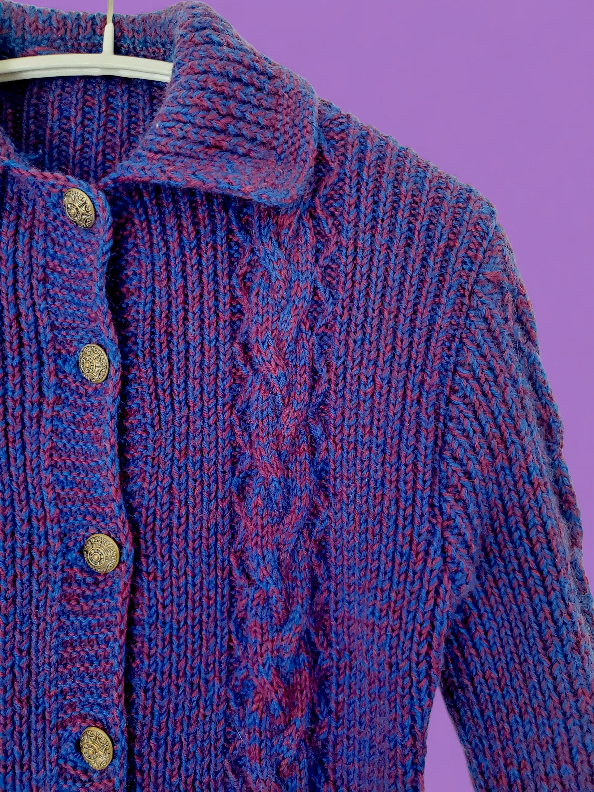 深みのあるレッドとブルーの糸をミックスした手編みのカーディガン。フロントと袖にあしらったケーブル編みがクラシックな雰囲気を添え、シルバーボタンがアクセントに。すっきりとしたシルエットで、羽織るだけで温かみのあるスタイルが完成します。