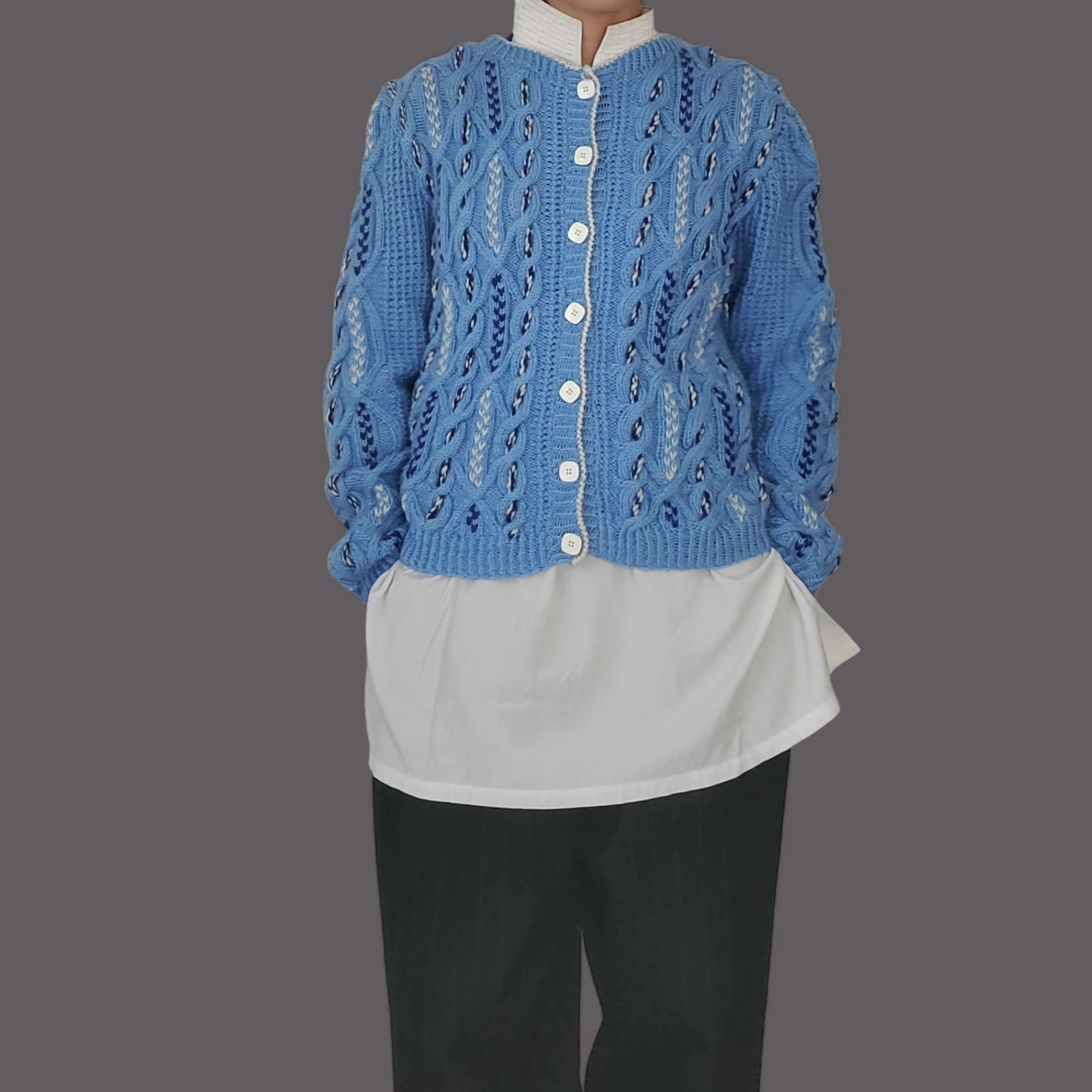 鮮やかなライトブルーにネイビーとホワイトの糸を組み合わせたヨーロッパヴィンテージハンドニットカーディガン。全体に施された抜け感のある編み模様が軽やかな印象を与え、スクエアな白ボタンのアクセントが爽やかさを引き立てます。一枚で華やぐアイテムです。