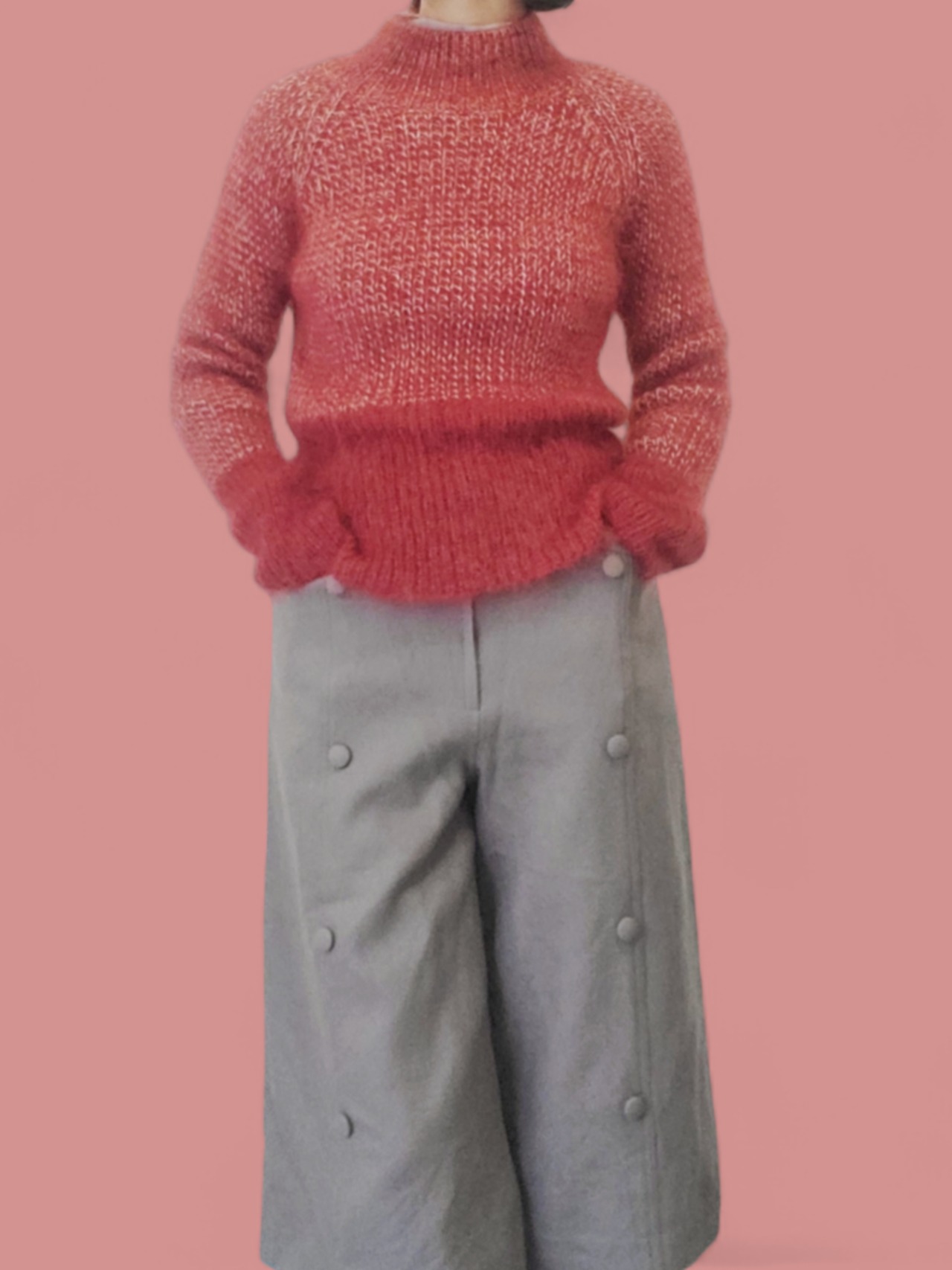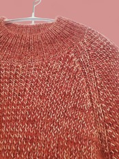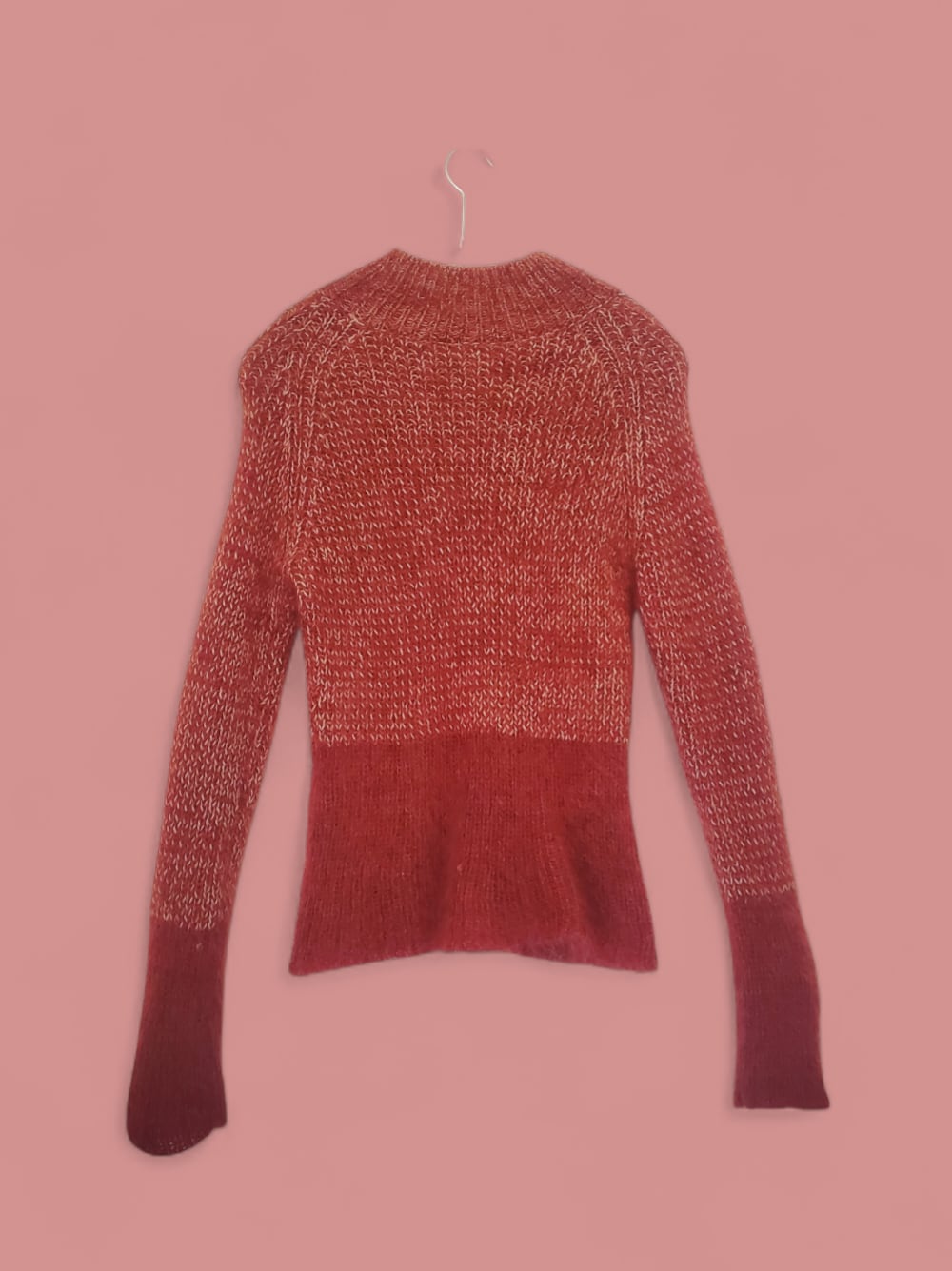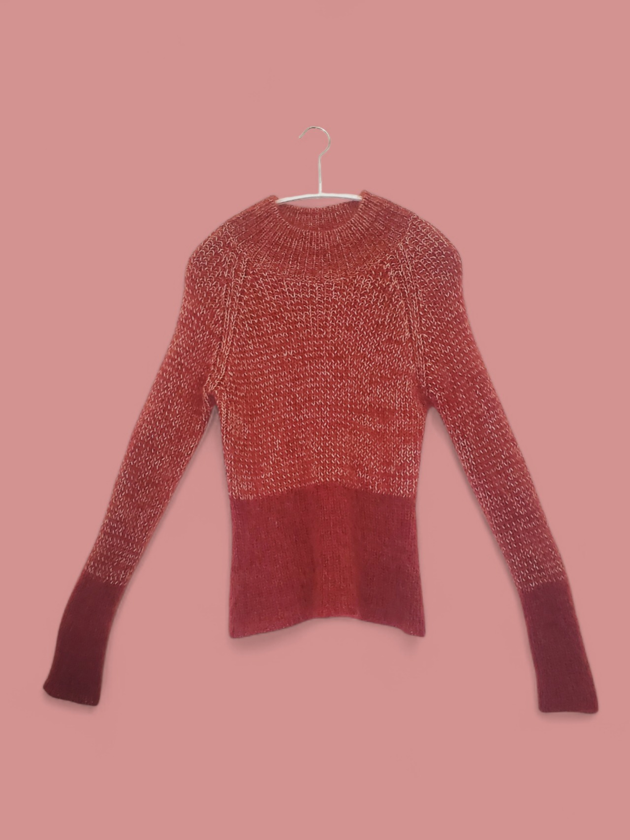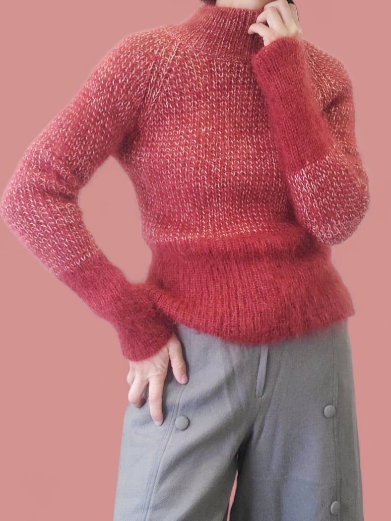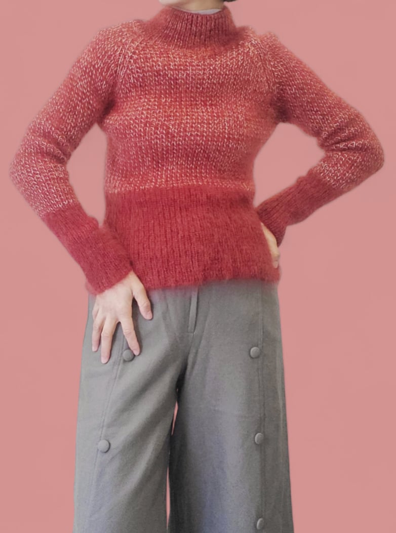 落ち着いた赤と白の毛糸で編み上げた、モックネックのモヘアニット。軽やかで柔らかく、ふわりと身体を包み込むような着心地が魅力です。