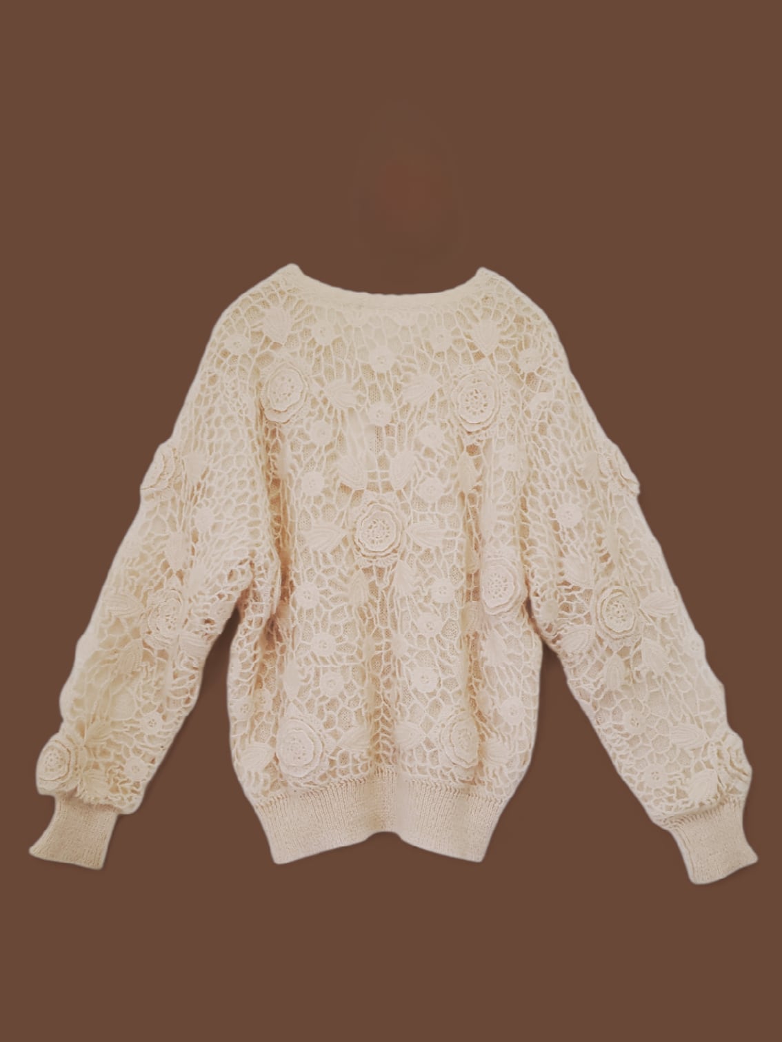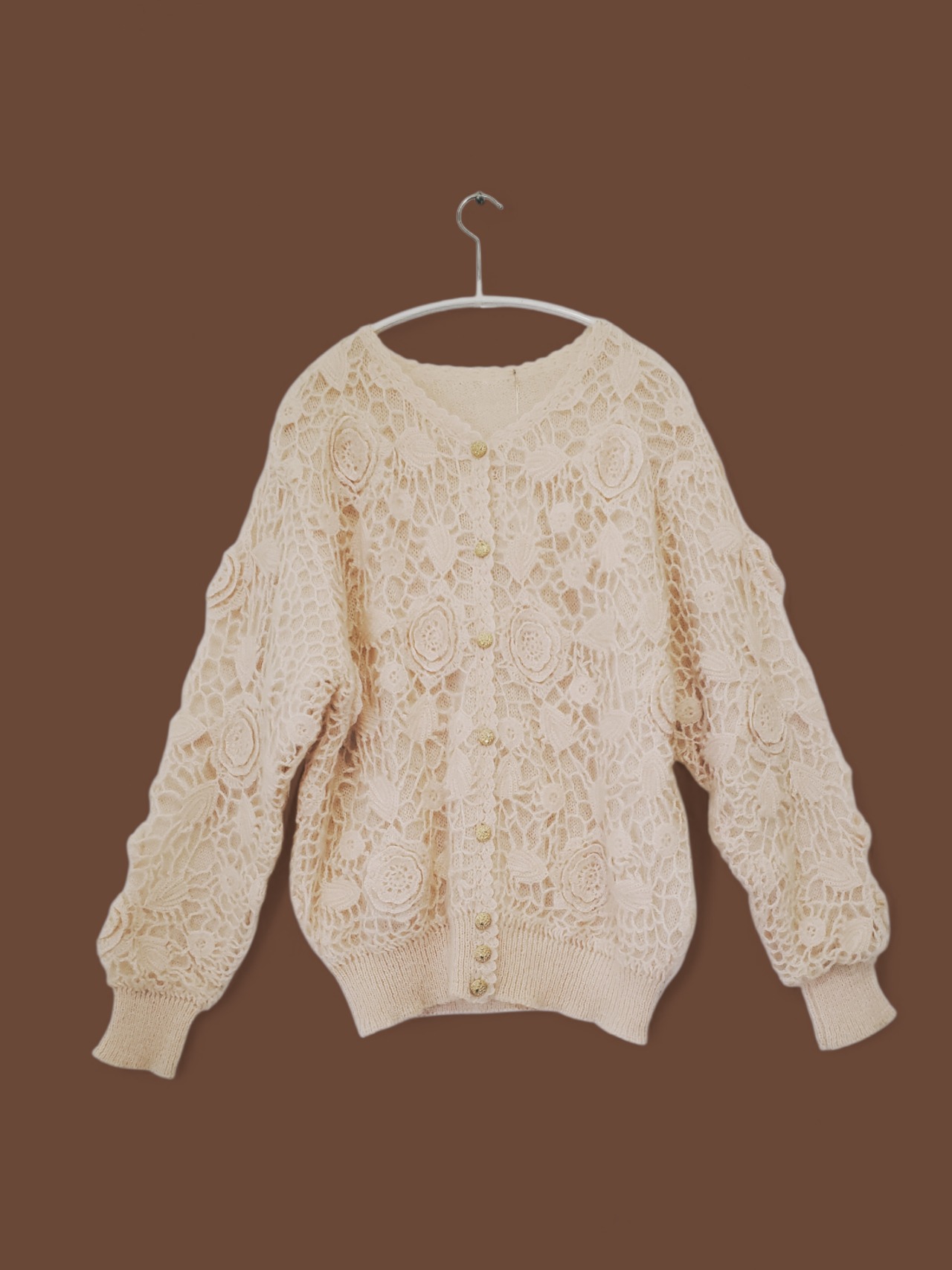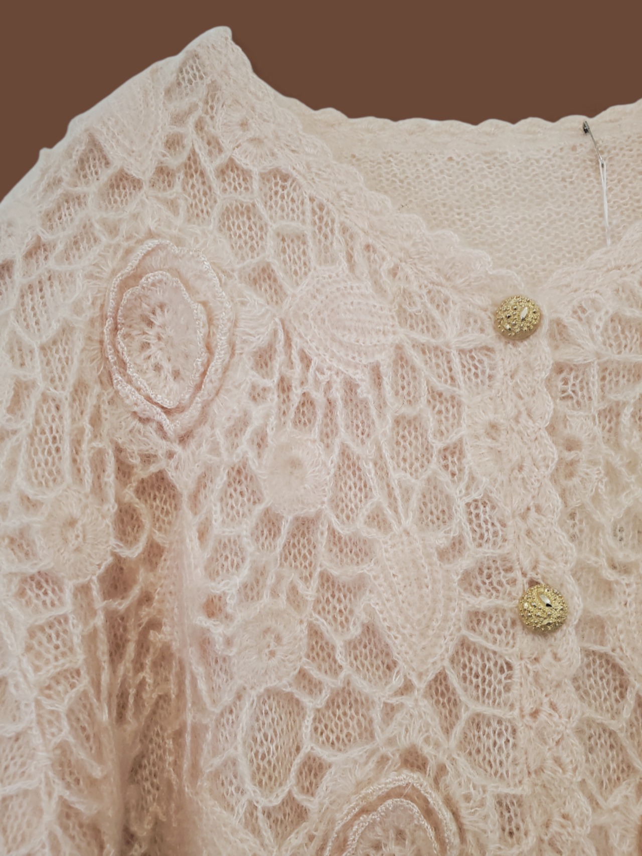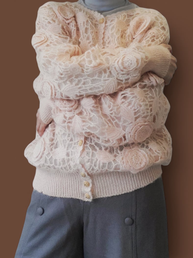 表面にはかぎ編みのフラワーレースを施し、ふんわりとした風合いが女性らしさを引き立てます。淡いベビーピンクの色味がやさしく、程よいボリューム感とゴールドボタンが上品な印象に。コーデの主役になる一枚です。