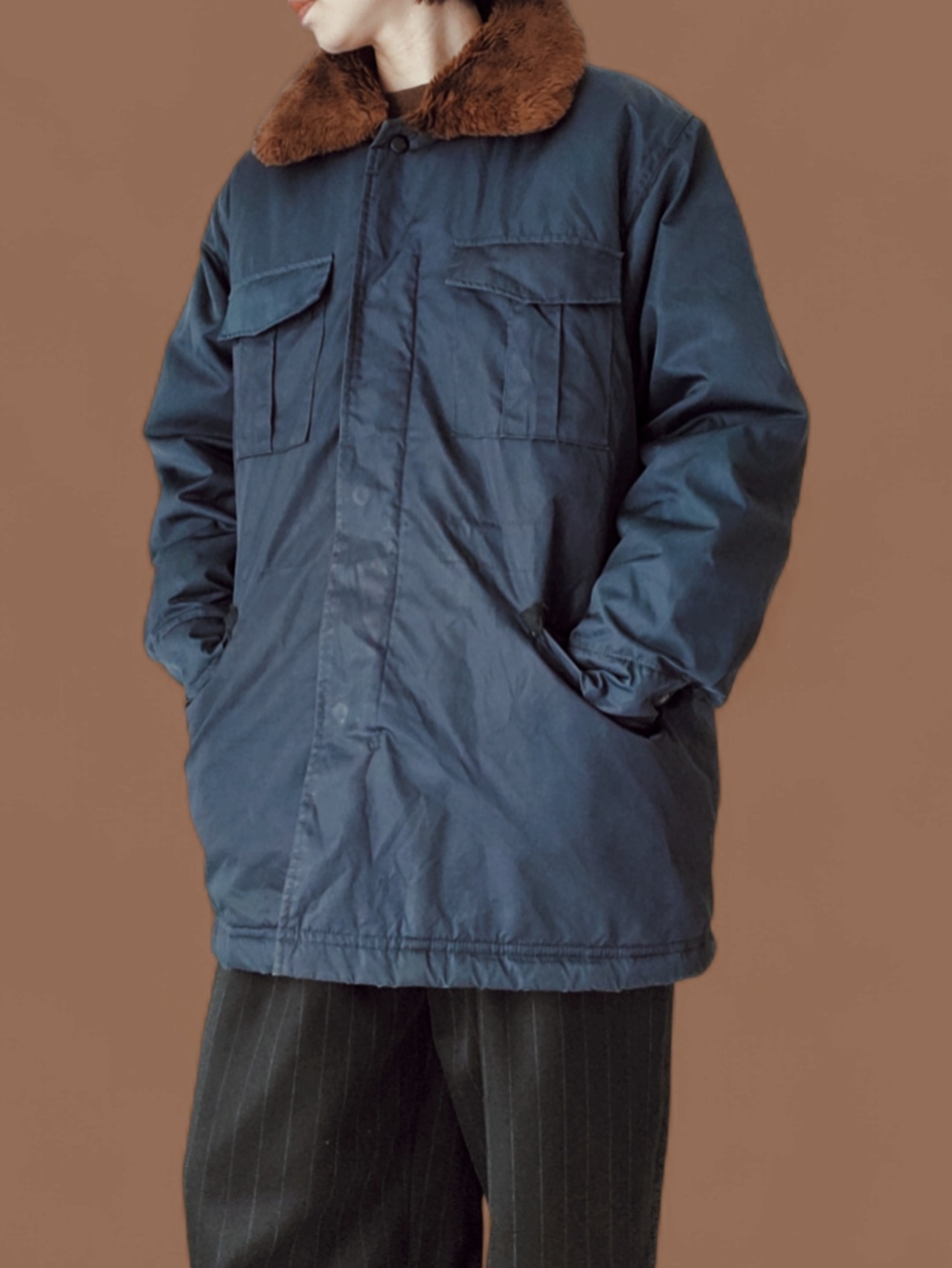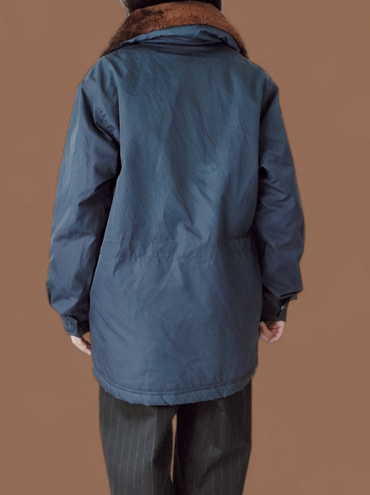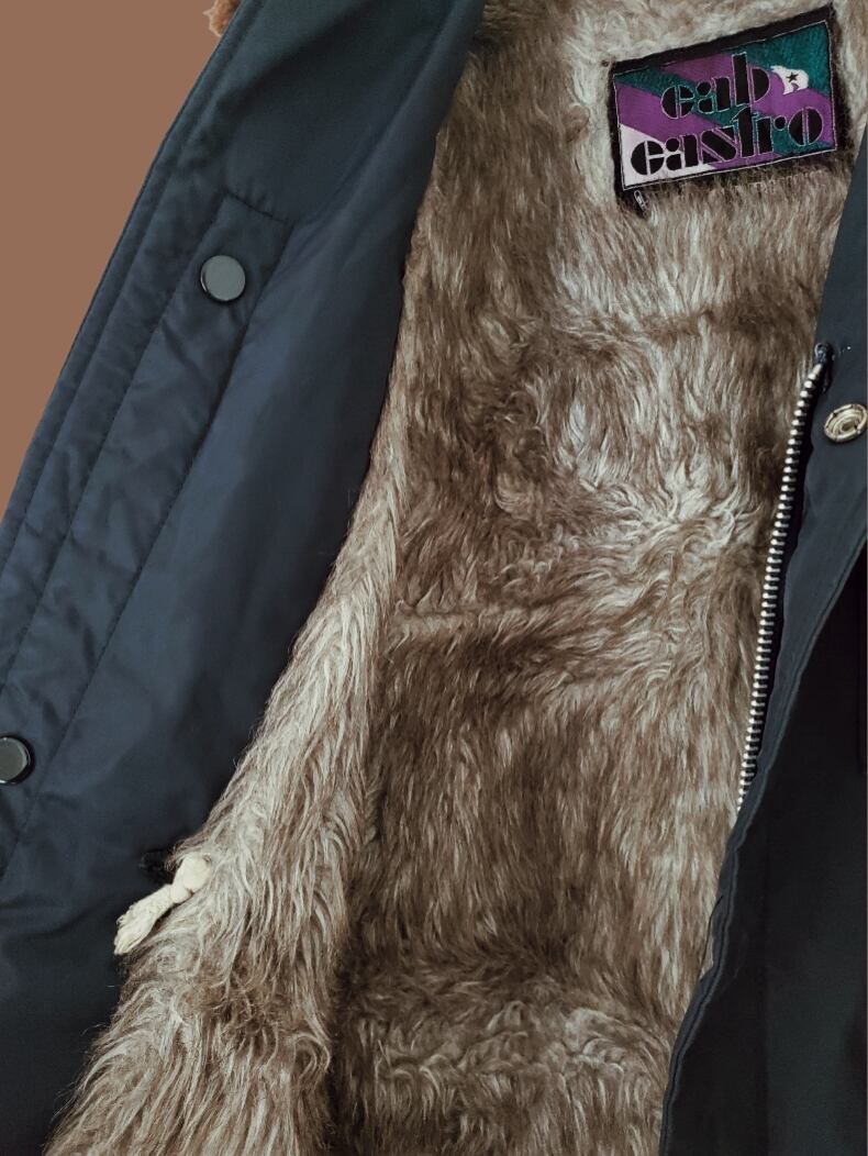 ヴィンテージ”CAB CLOTHING/CASTRO”ファーライナー付きジャケット。ナイロンのネイビーのボディに厚手のフェイクファー裏地とブラウンカラーのファー襟がついて、防寒性に優れた冬ドカジャン。サイズLですが大きい印象はなく、157cmでもちょうど良いサイズ感です。