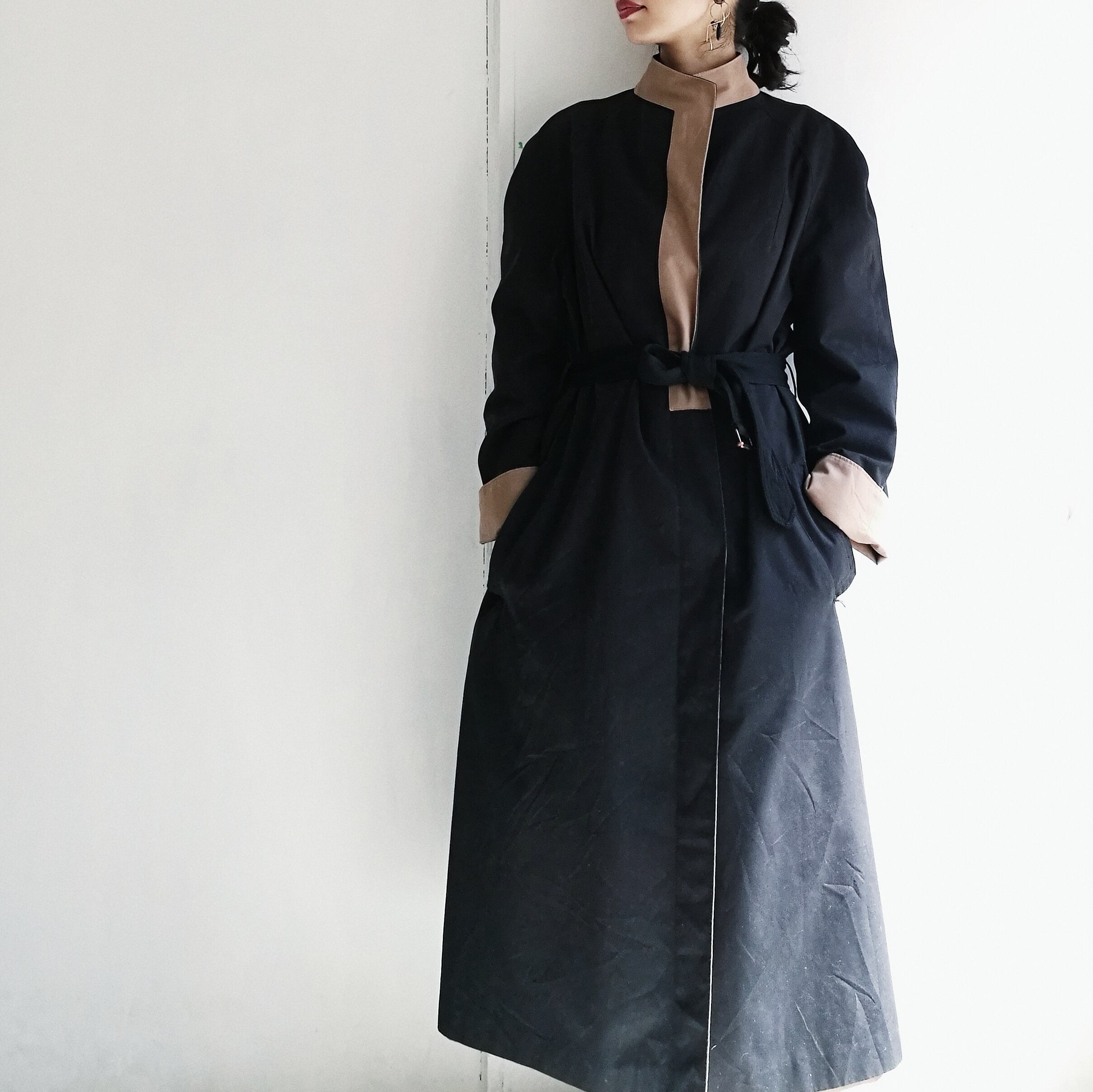 スタンドカラーのリバーシブルトレンチがアメリカから届きました。ボタンなしで黒ベルトが一本ついています。トレンチコートなので多少の重さはありますが着ていて気にならない程度です。襟を立てるとカンフーっぽくなるのも魅力的です。