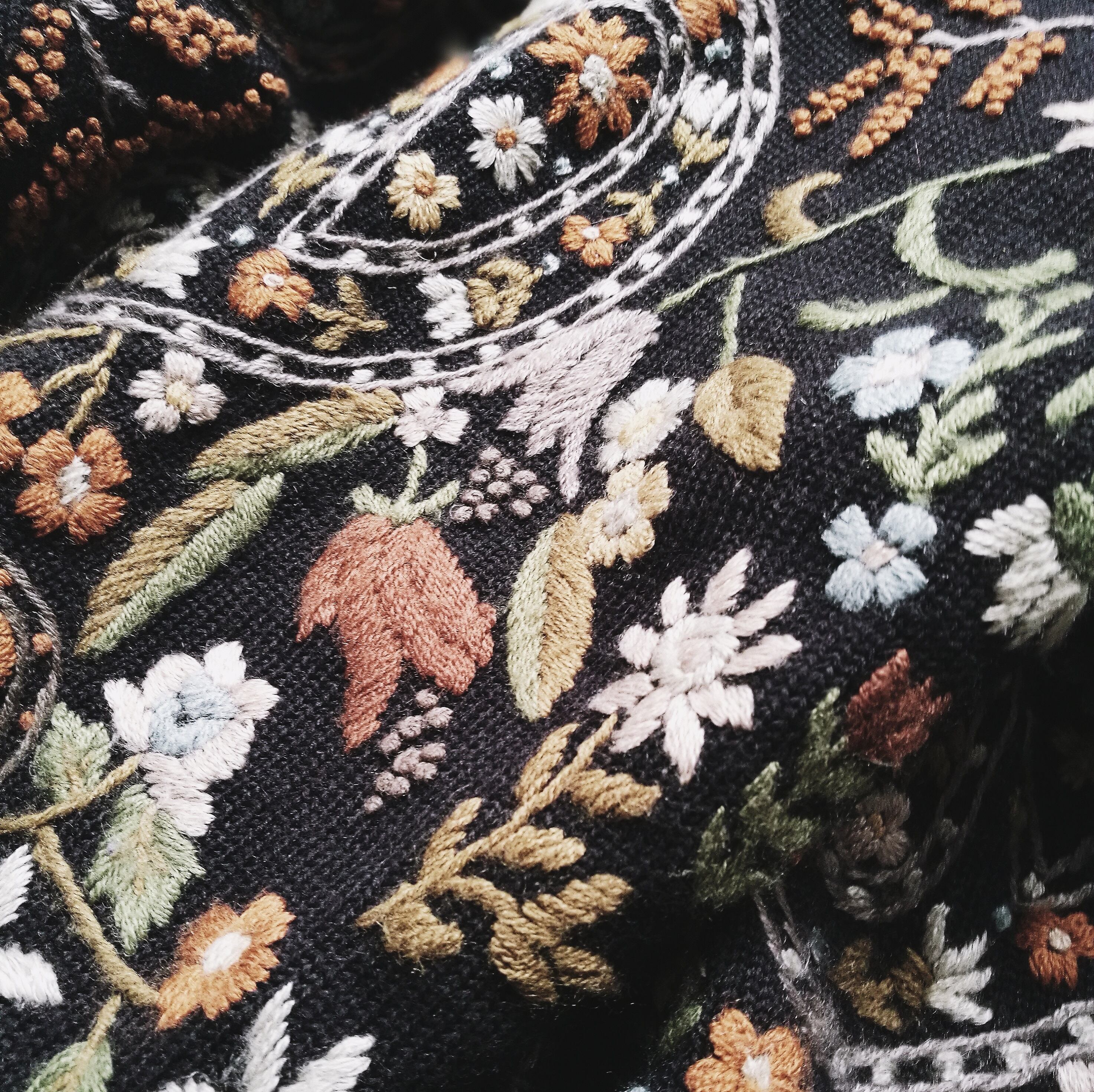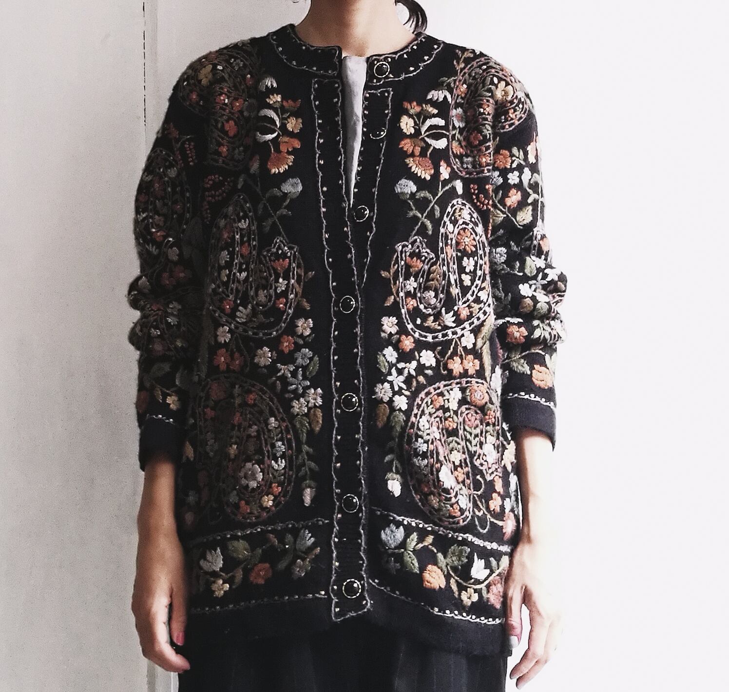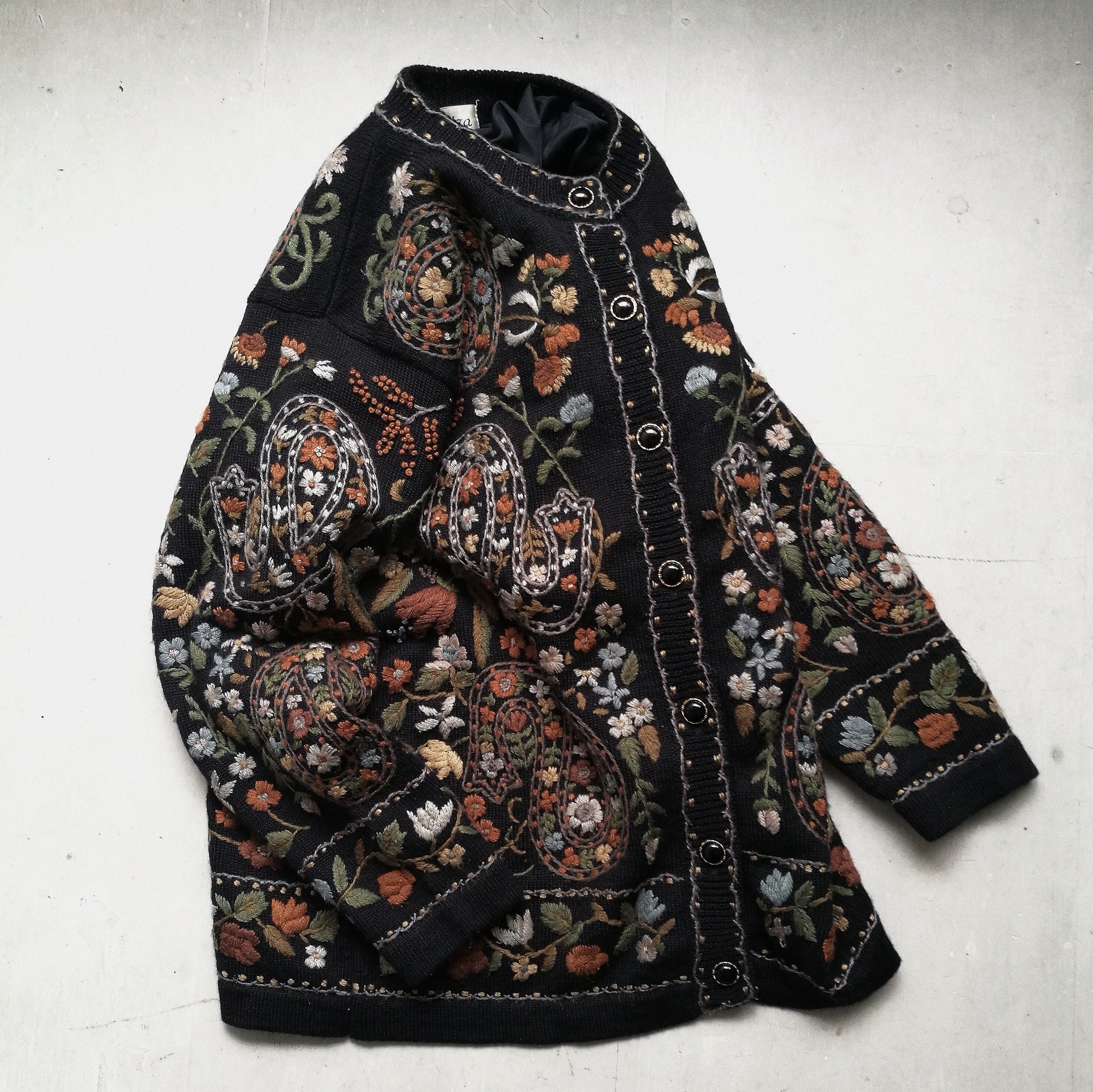 黒いニット地に色とりどりの刺繍のお花がぎゅっと描かれた人気の刺繍ニットです。裏地もついているのでアウターとしても暖かく着られます。