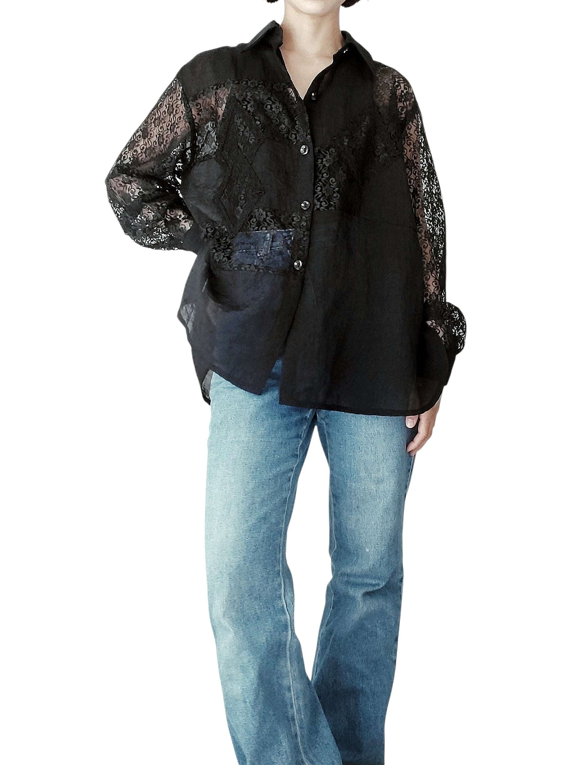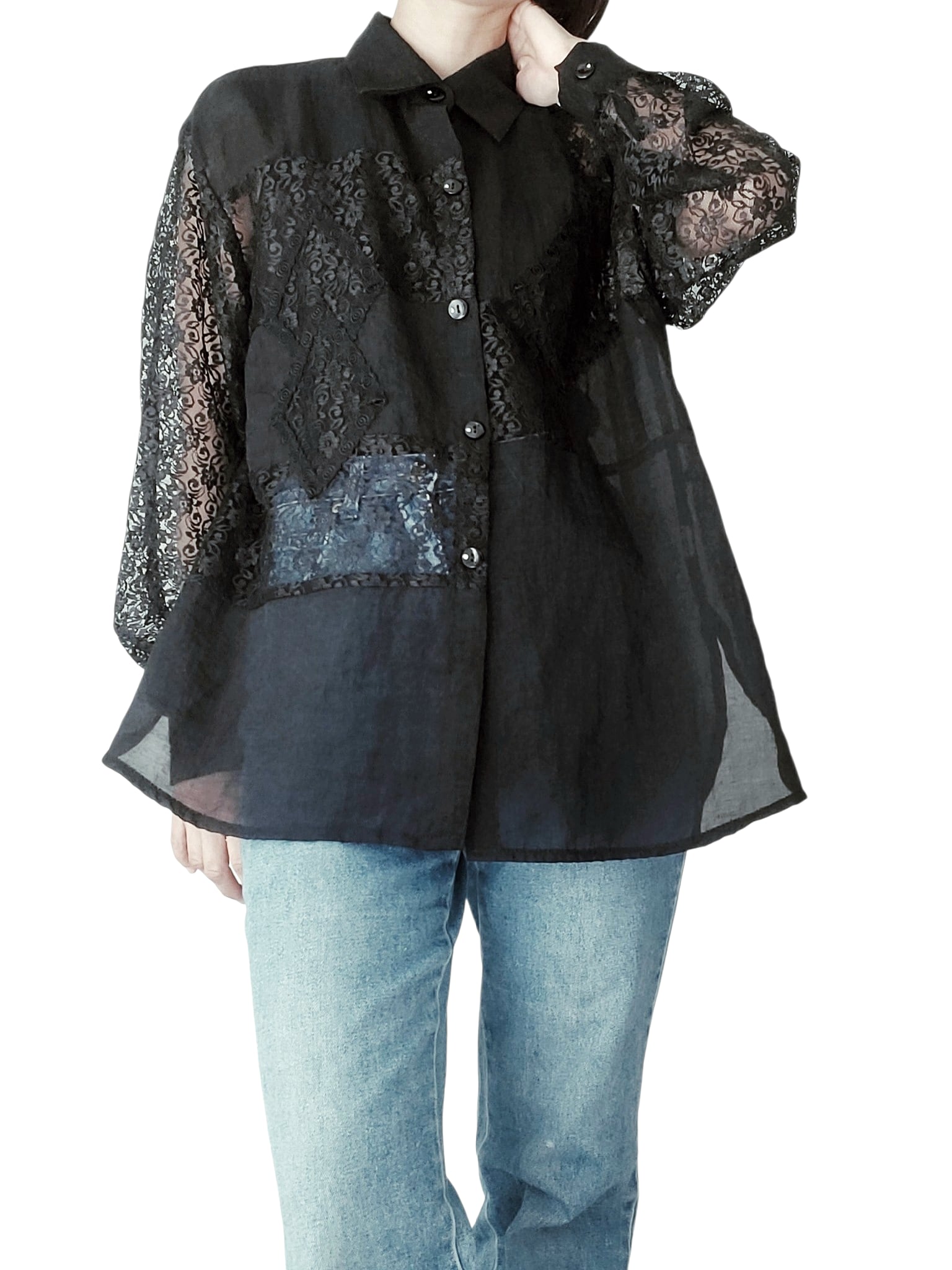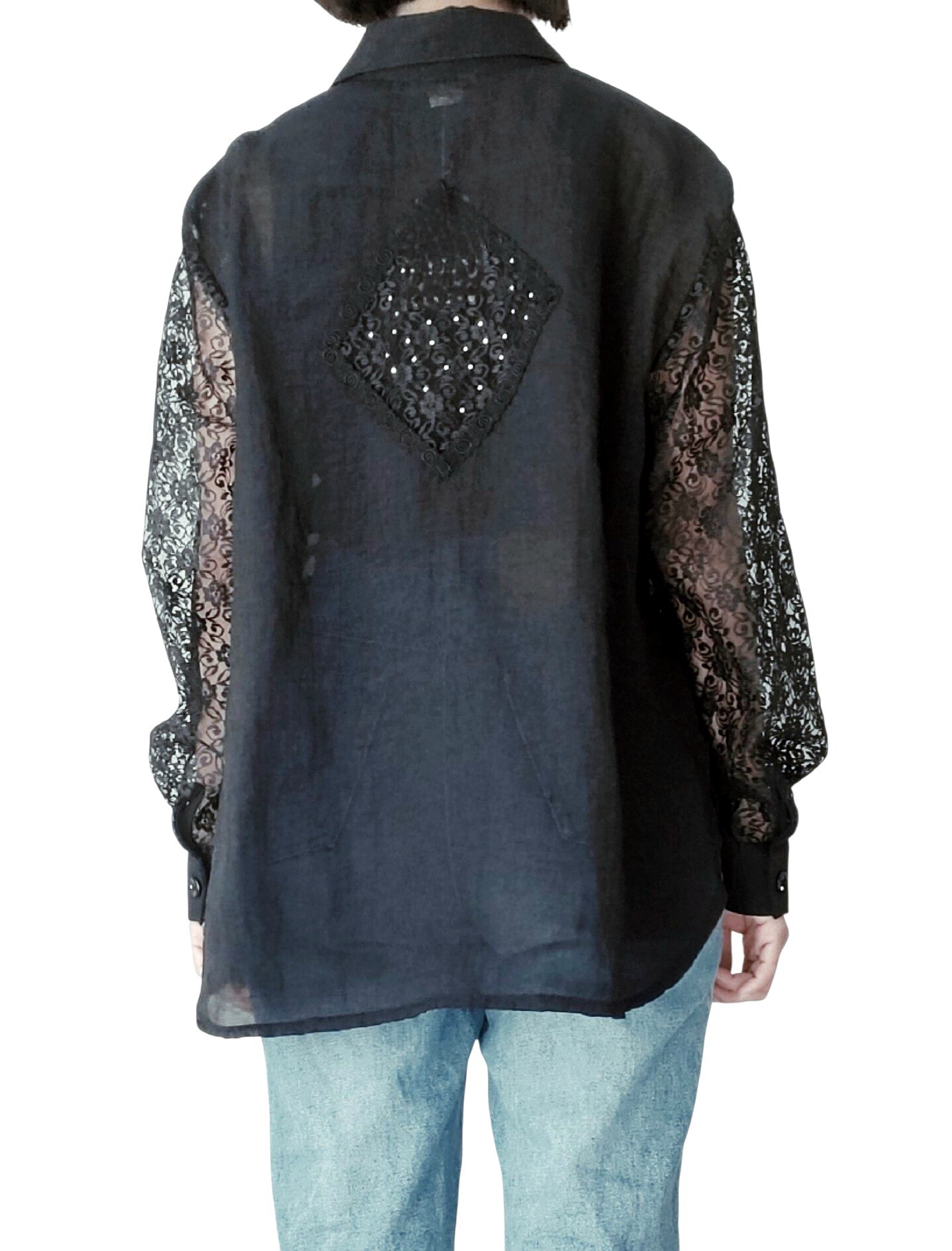 エレガントな雰囲気を醸し出すパッチワークレースシャツ。艶のあるブラックのポリエステル生地と、繊細なブラックレースのパッチワークが実に美しい一着です。ボタンと背面にはラインストーンがあしらわれアクセントを加えています。袖部分はレース仕様で軽やかさを演出し、背中は菱形に配置されたレースがセクシーさを引き立てます。少し張り感のある生地感が、シルエットにスタイリッシュさを与えています。