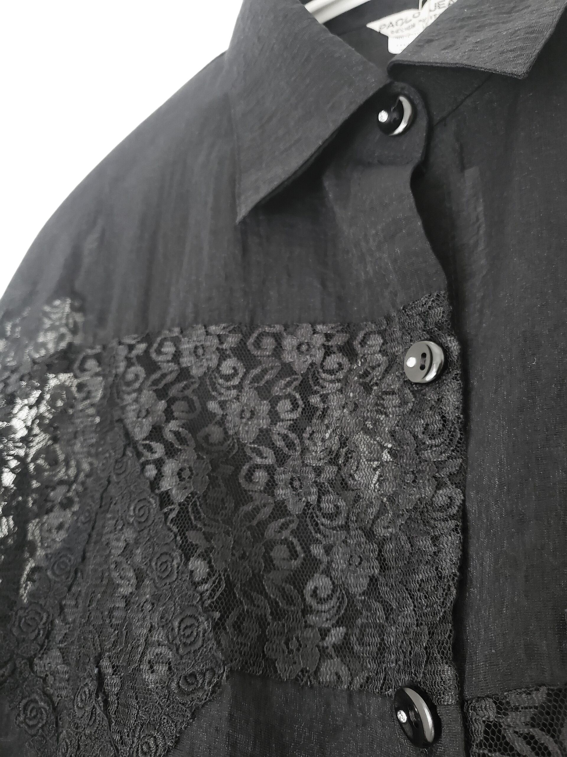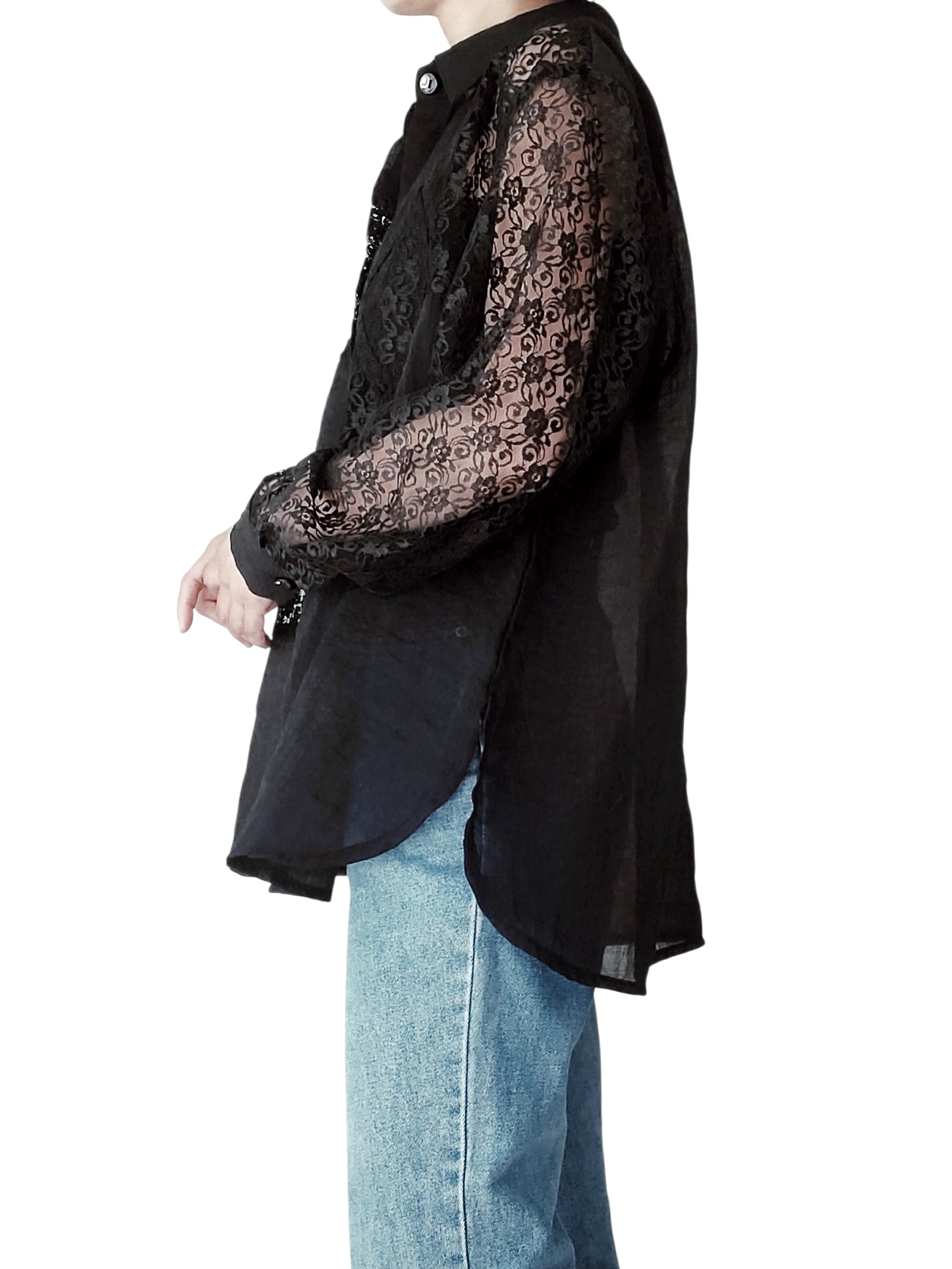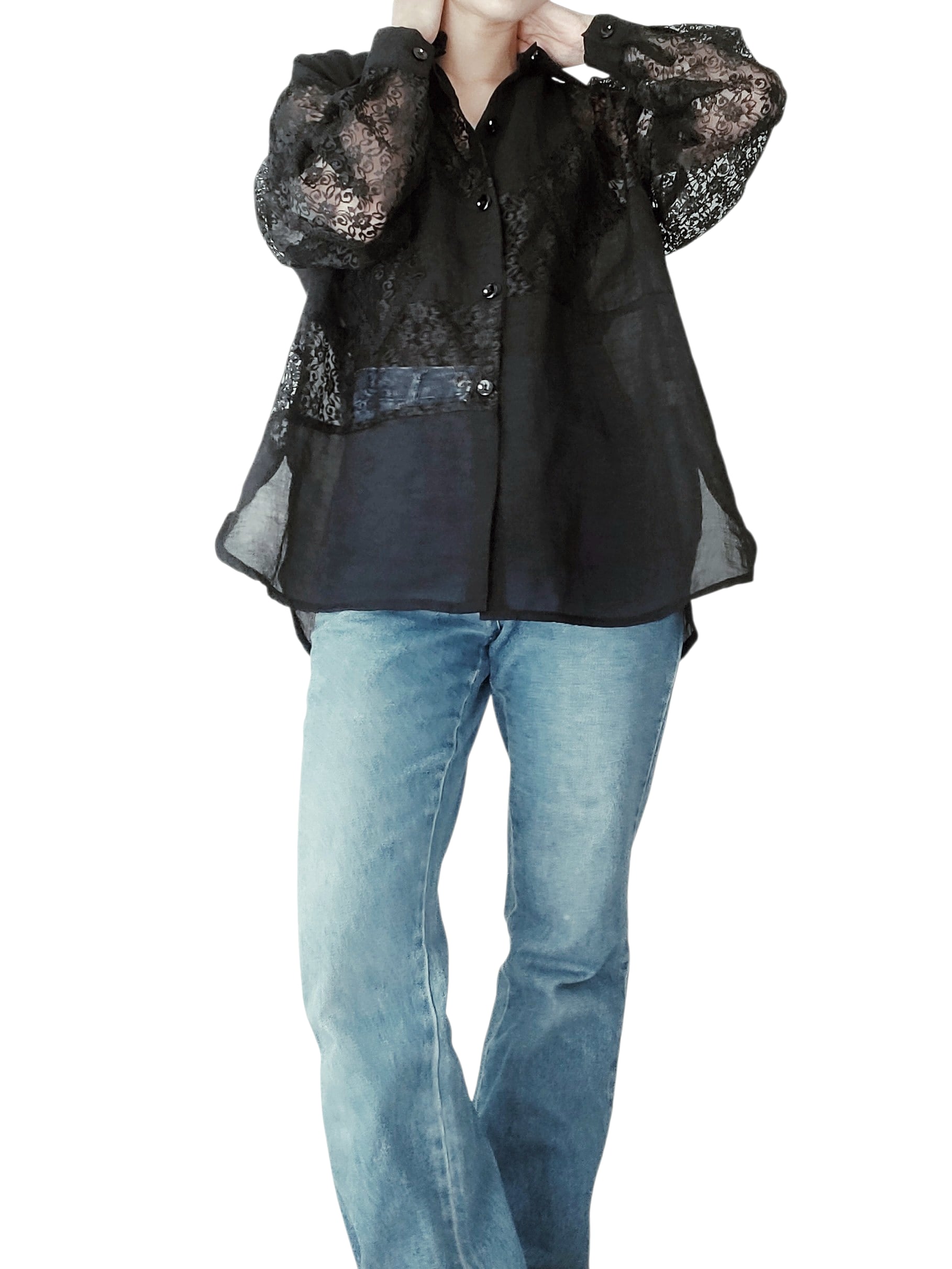 エレガントな雰囲気を醸し出すパッチワークレースシャツ。艶のあるブラックのポリエステル生地と、繊細なブラックレースのパッチワークが実に美しい一着です。ボタンと背面にはラインストーンがあしらわれアクセントを加えています。袖部分はレース仕様で軽やかさを演出し、背中は菱形に配置されたレースがセクシーさを引き立てます。少し張り感のある生地感が、シルエットにスタイリッシュさを与えています。