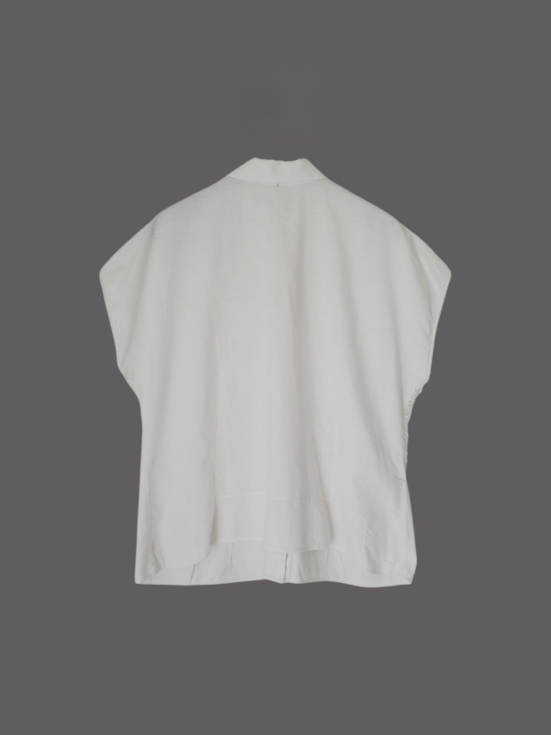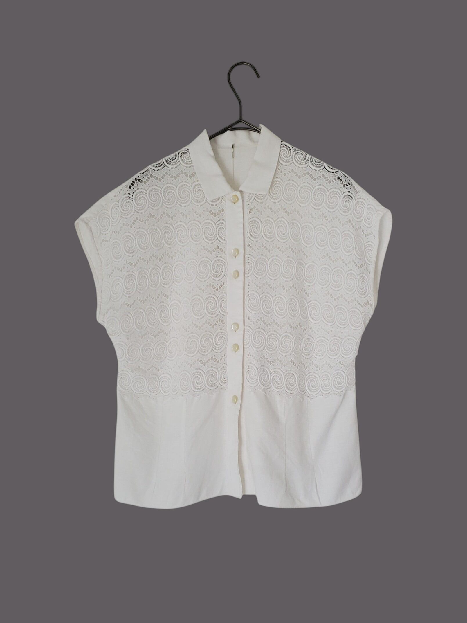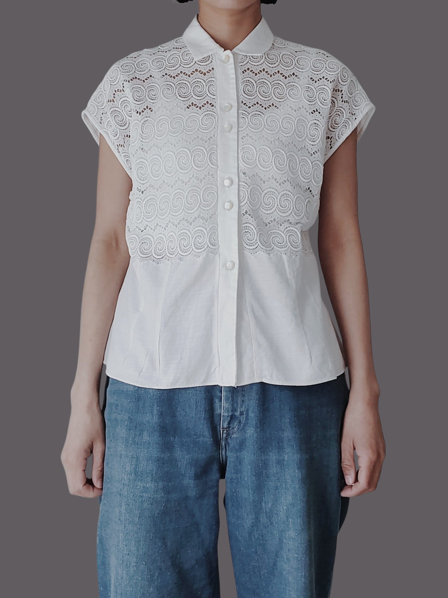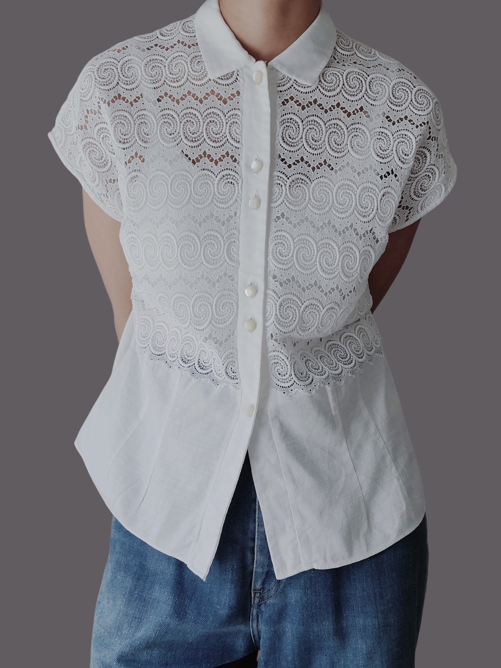 繊細な渦を描くエンブロイダリーレースを贅沢に配した、フレンチスリーブシャツ。コンパクトな襟が顔まわりをすっきりと引き締め、裾に施されたタックがさりげない立体感を生み出します。甘さを含みながらも、どこか凛とした佇まい。透けのコントラストがホワイトに奥行きを添え、日常から少しモードな装いまで、幅広く馴染む一着です。