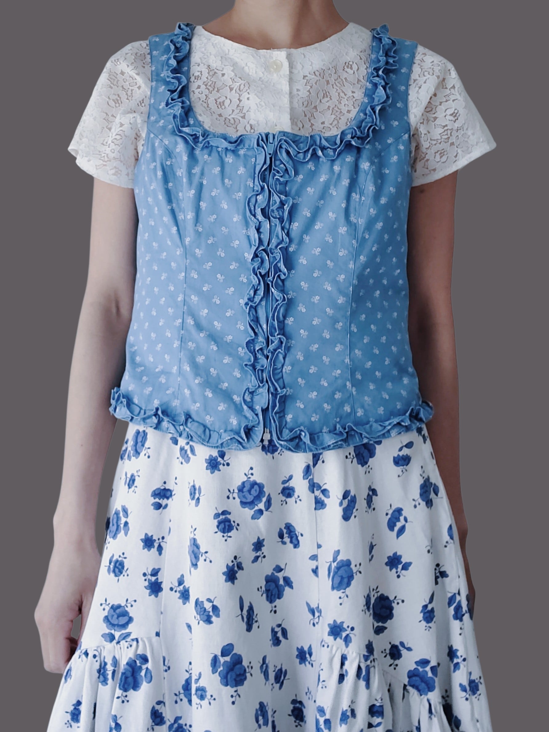 澄んだスカイブルーに可憐な小花柄を散りばめた生地は、夏の光に美しく映えます。