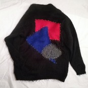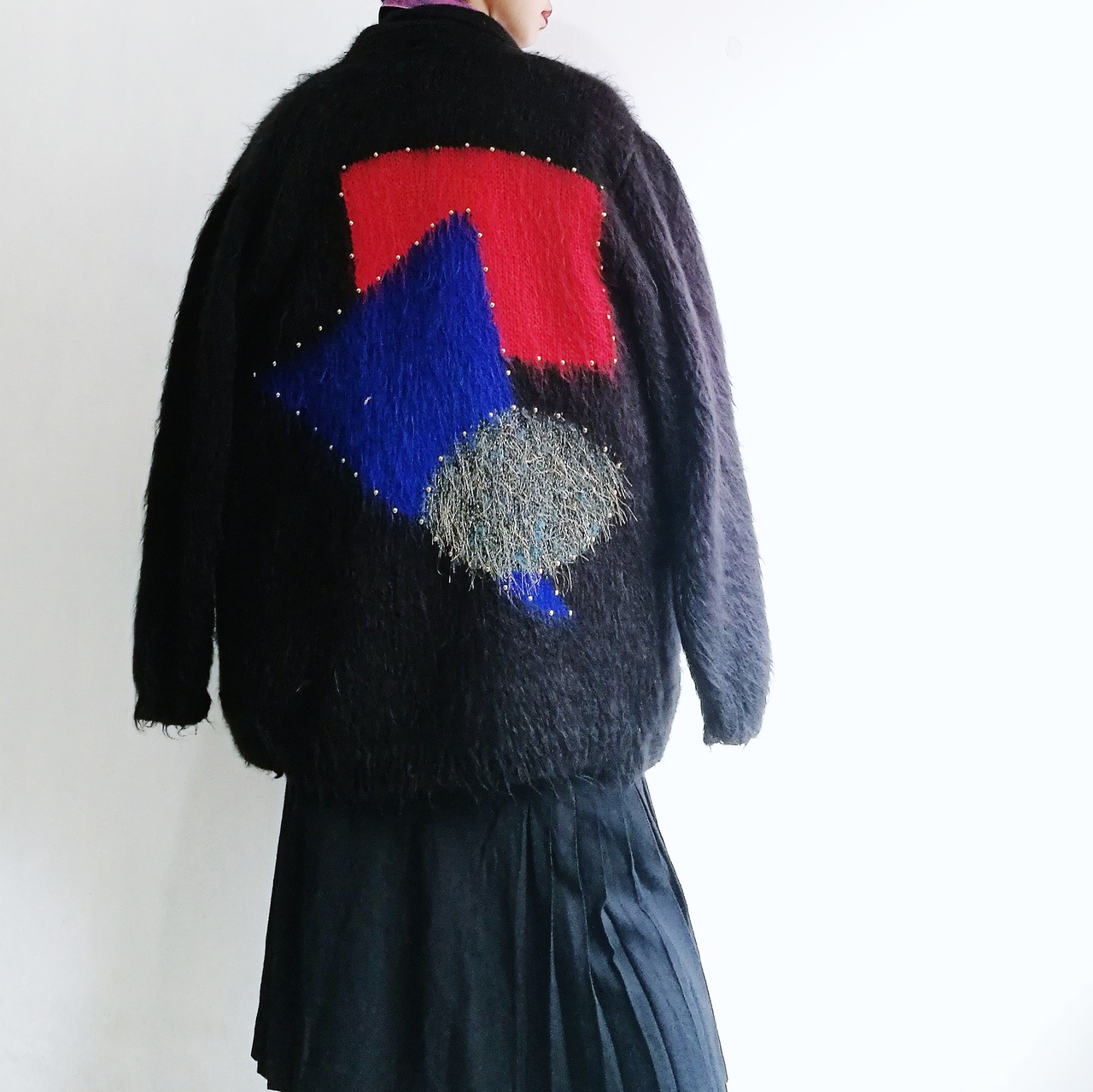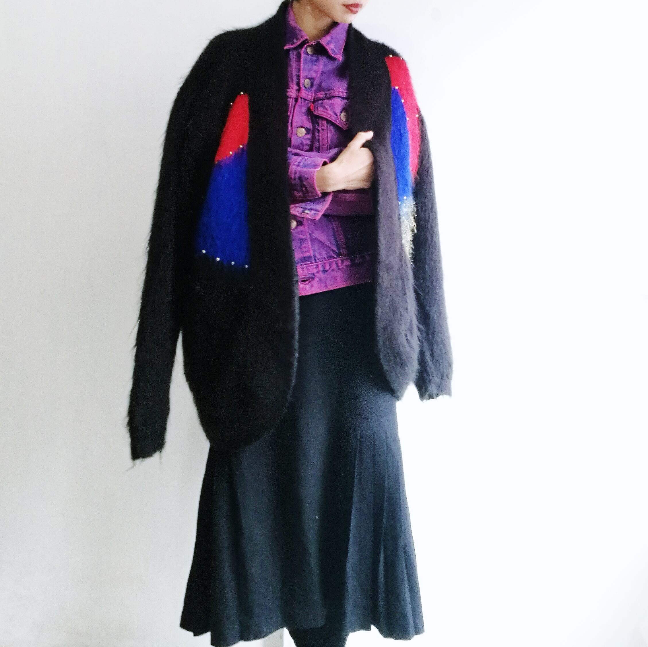 フランスから入ってきた80'sモードなヴィンテージデザインニットカーディガン。フロントボタンはなく羽織りですが、ベルトでウエストマークしたりピンで留めたり遊び方は様々です。ゴールドのスタッズがパンキッシュでバックデザインも最高にかっこいいです。着画のようにGジャンや軽めのジャケットの上から羽織っても良いです。