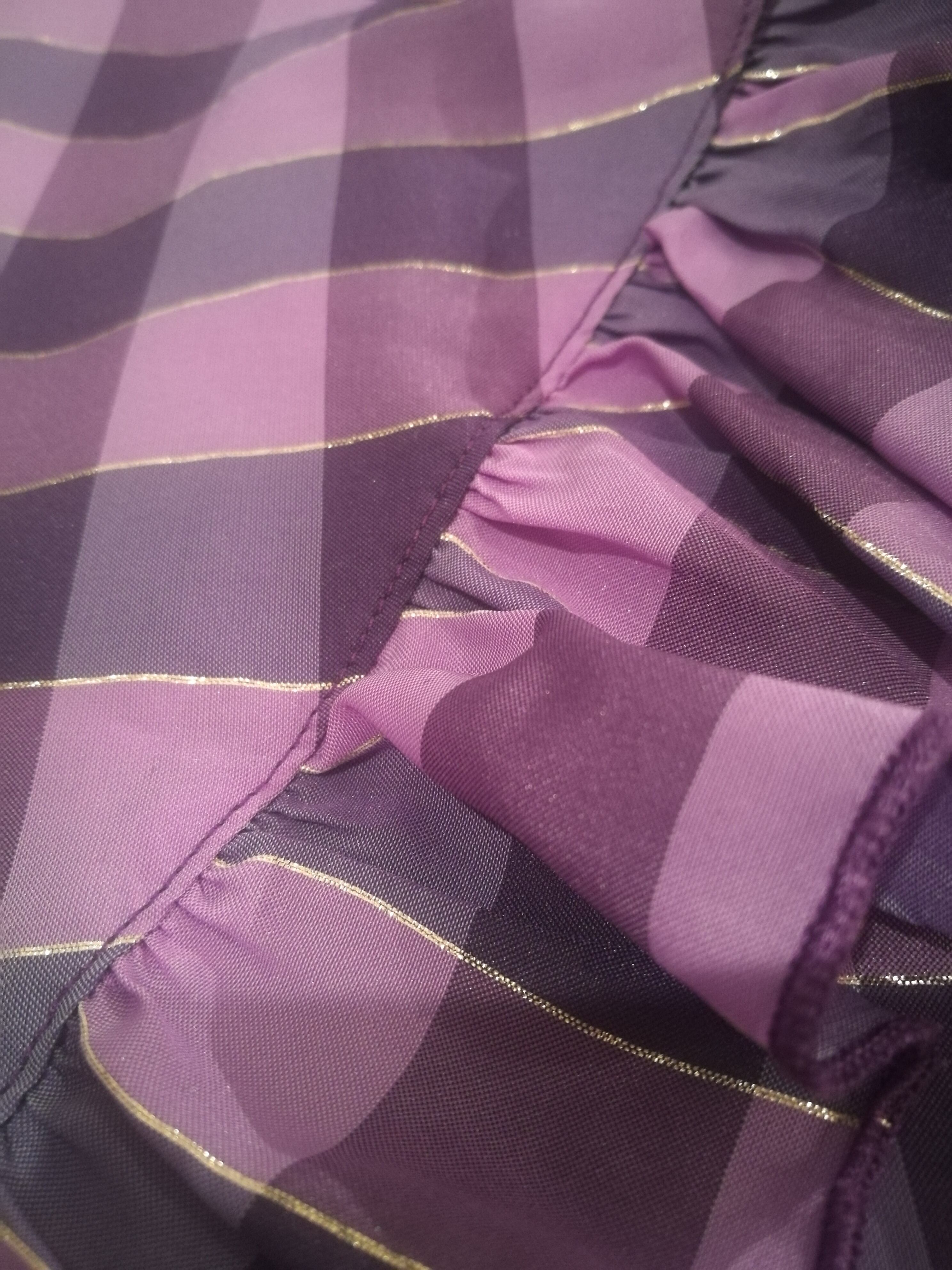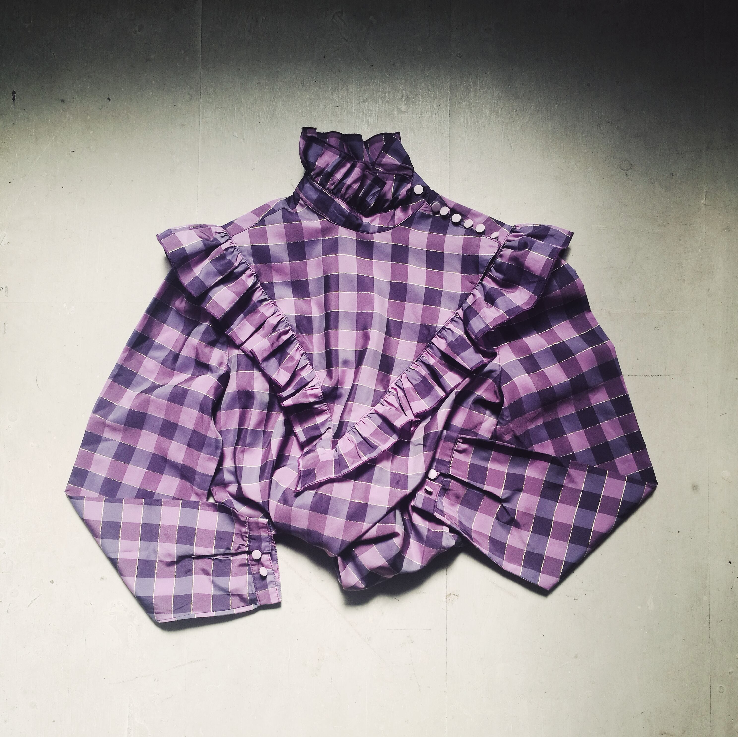 濃淡なパープルのチェックにゴールドのラメが差しています。首とフロントとバックに大胆なフリルがモード。ヨーロッパモノでも大きすぎないサイズ感が嬉しいです。