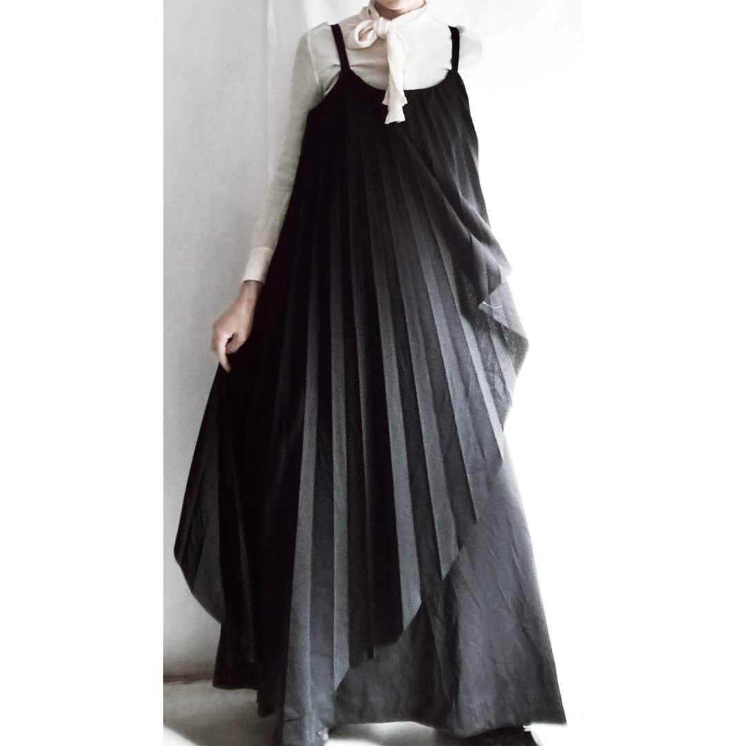 鋭く斜めに切り込んだプリーツがモードなブラックワンピース。