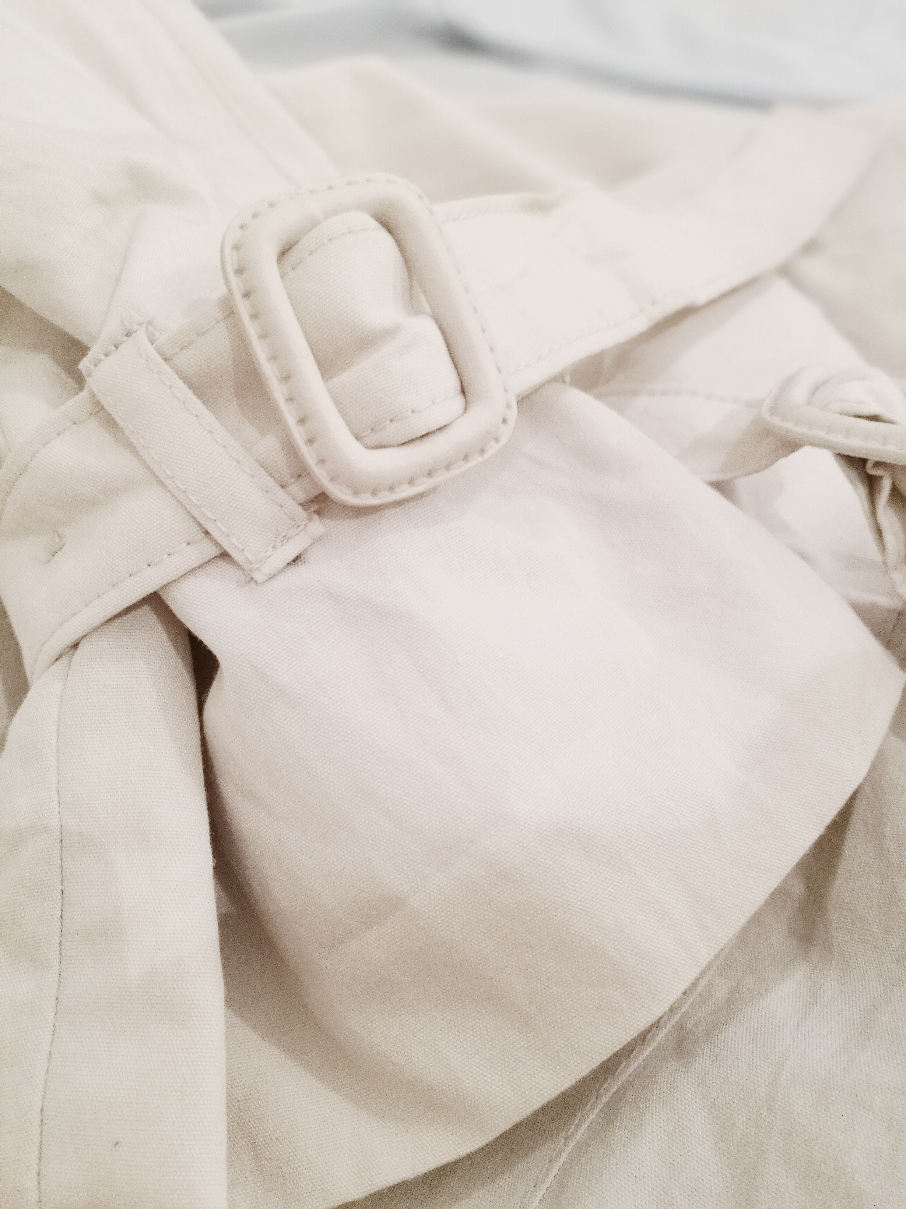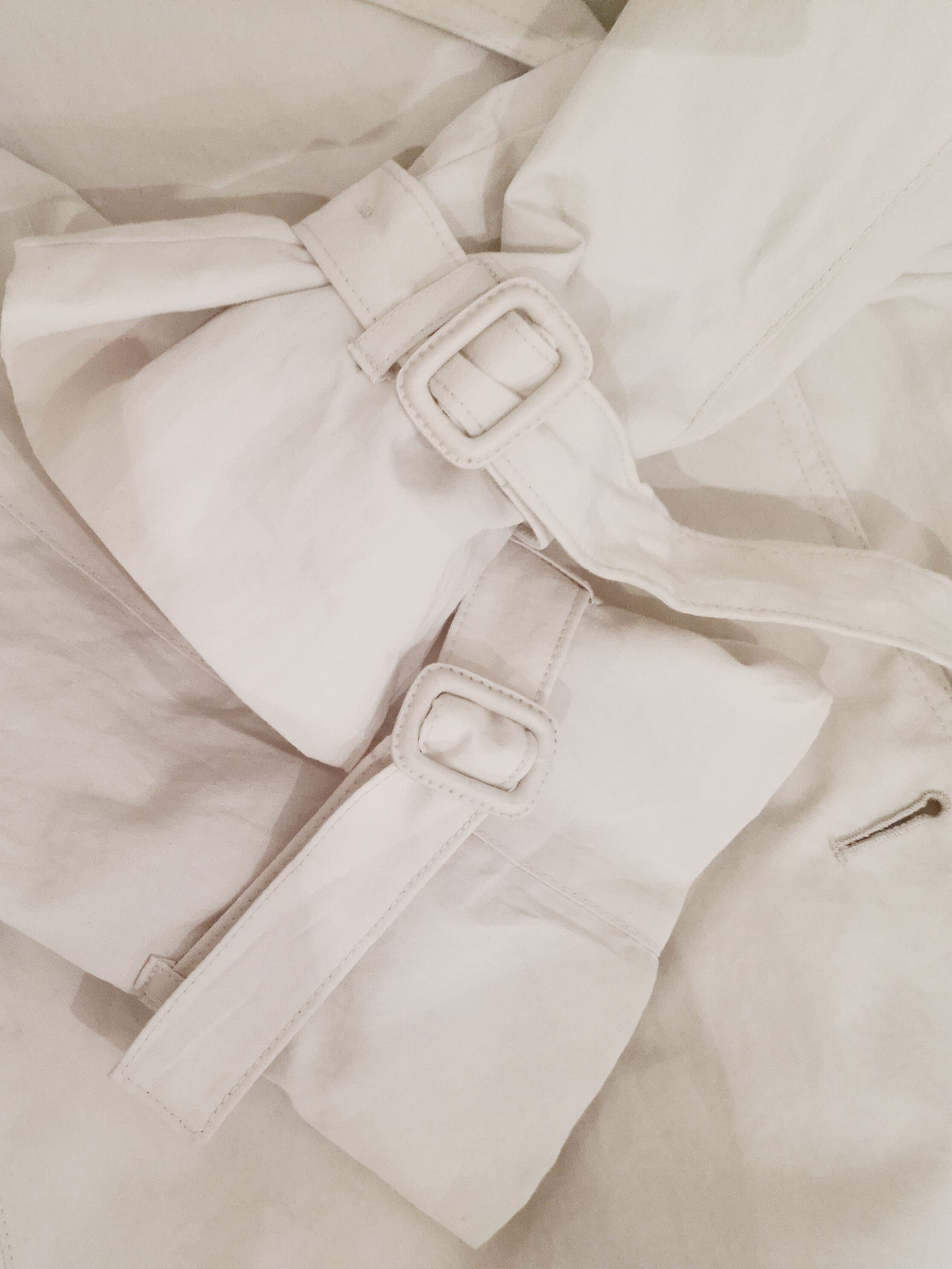 丈長めのダブルトレンチコート。ヴィンテージなので使用感はありますが白トレンチにしてはきれいです。袖のベルトバックルも白レザーなのが個人的に熱いです。メンズアイテムですが156cmでもこの長さなので小柄~身長ある方まで着られるノンジェンダーなアイテムです。