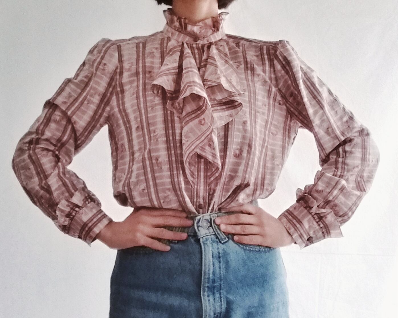 チェックに花柄のレトロなブラウス。東京ブラウスの古着です。