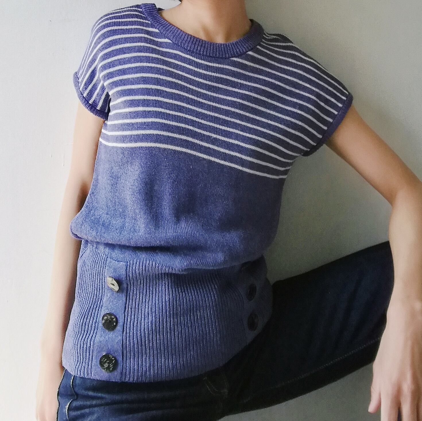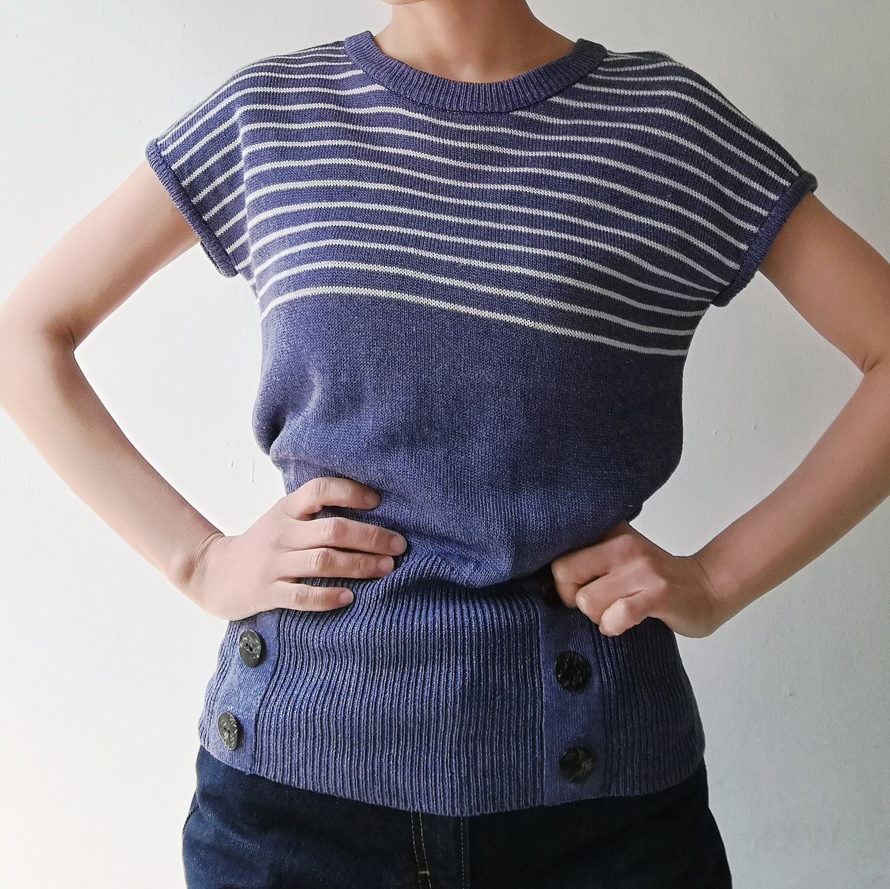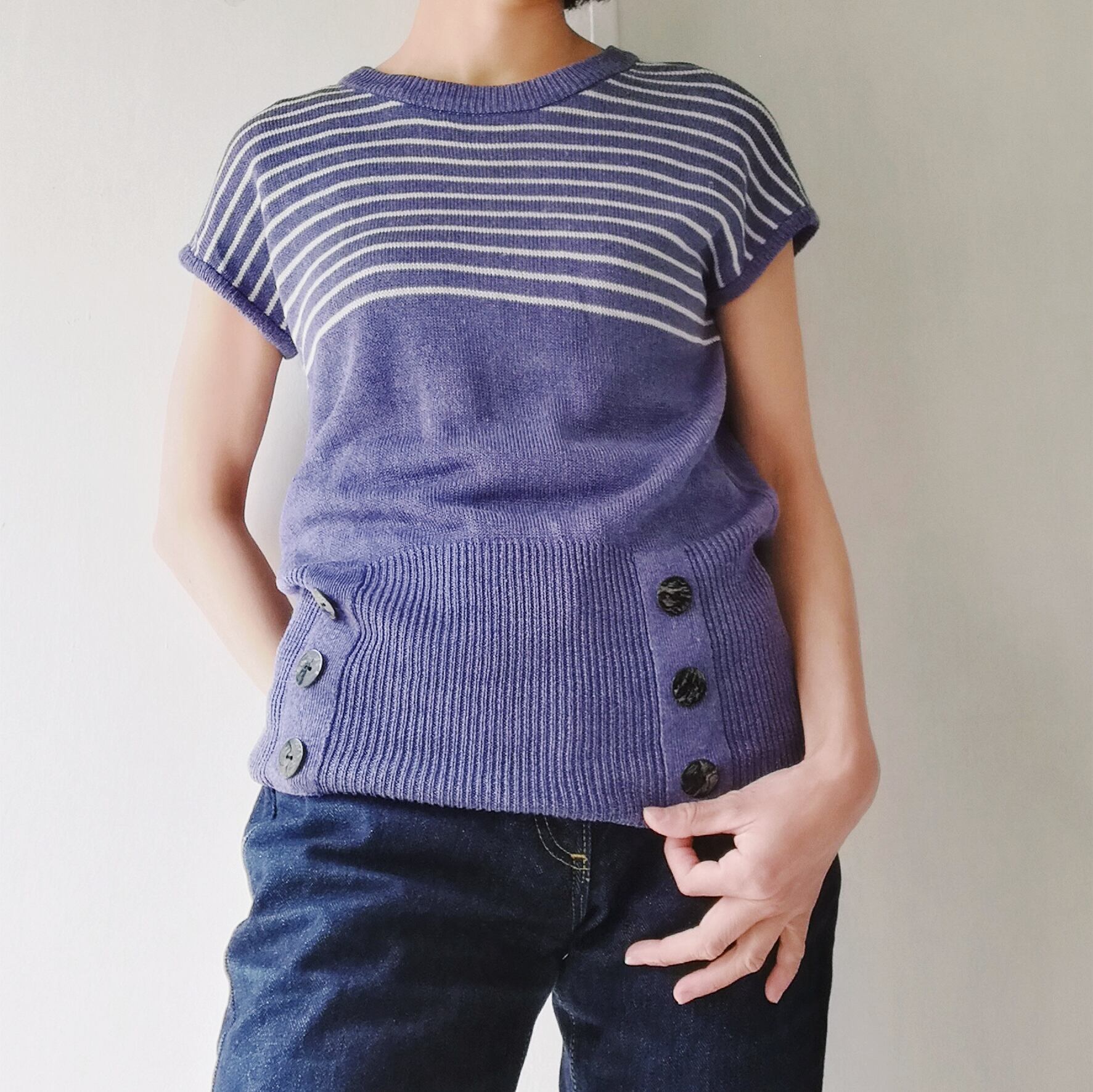 ウエストのボタンが特徴的なマリンボーダーサマーセーター。