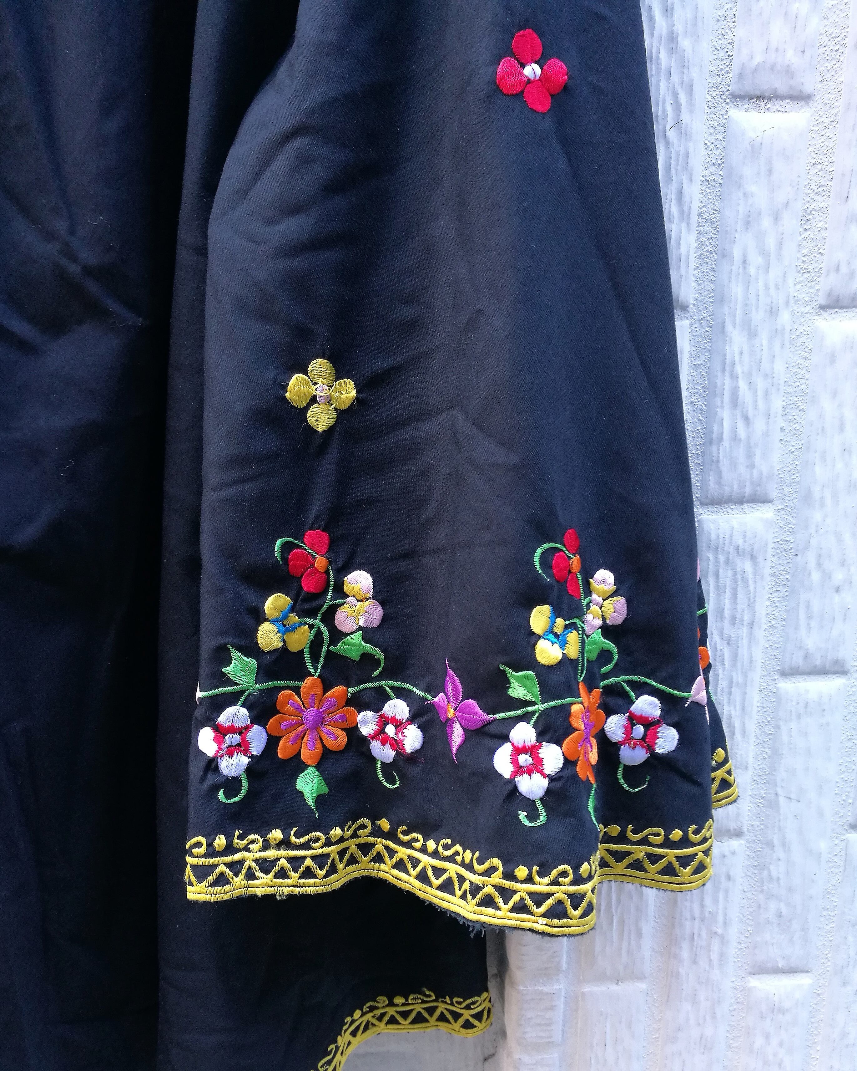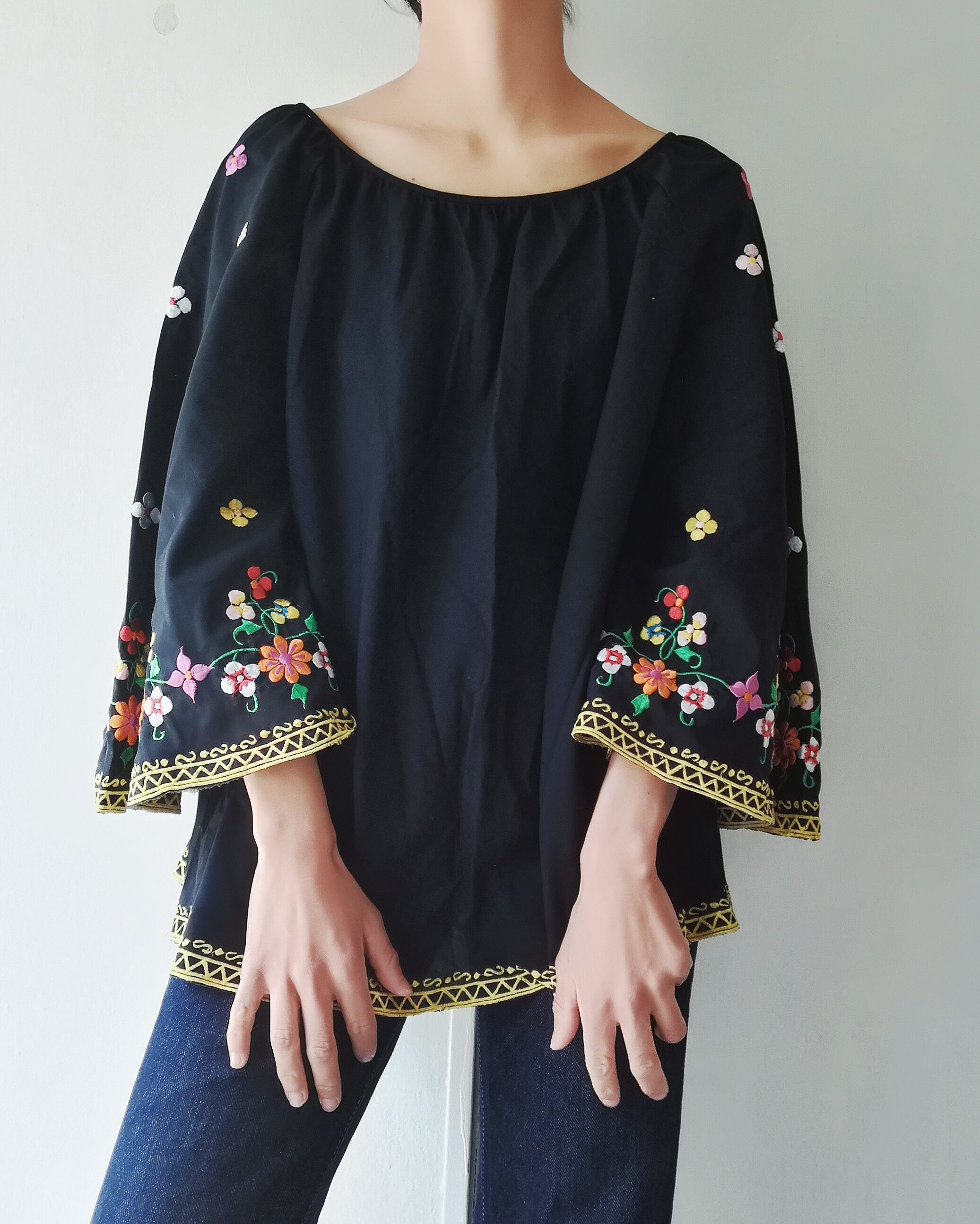 黒地に光沢のある刺繍糸の花柄が映えるチュニック。