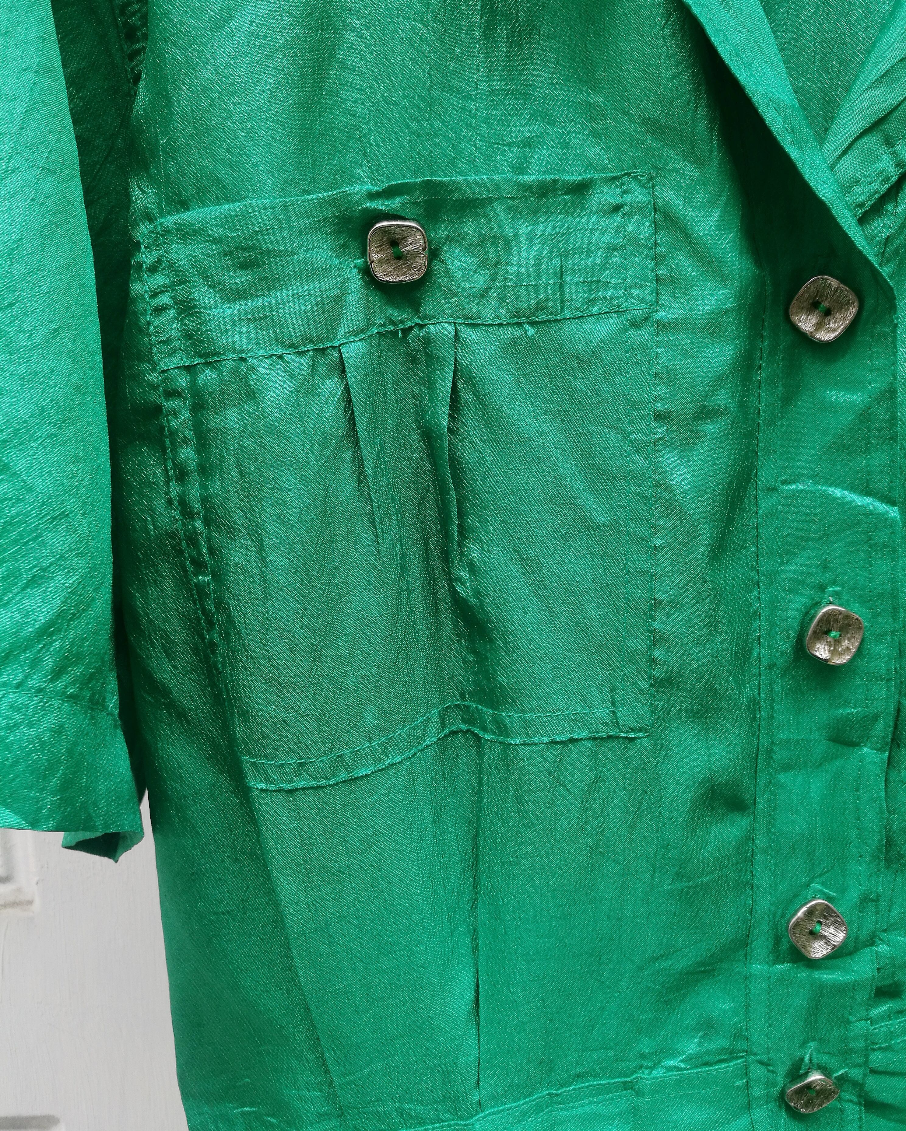 光沢のある薄い緑生地にシルバーの四角いボタンがスペーシーです。