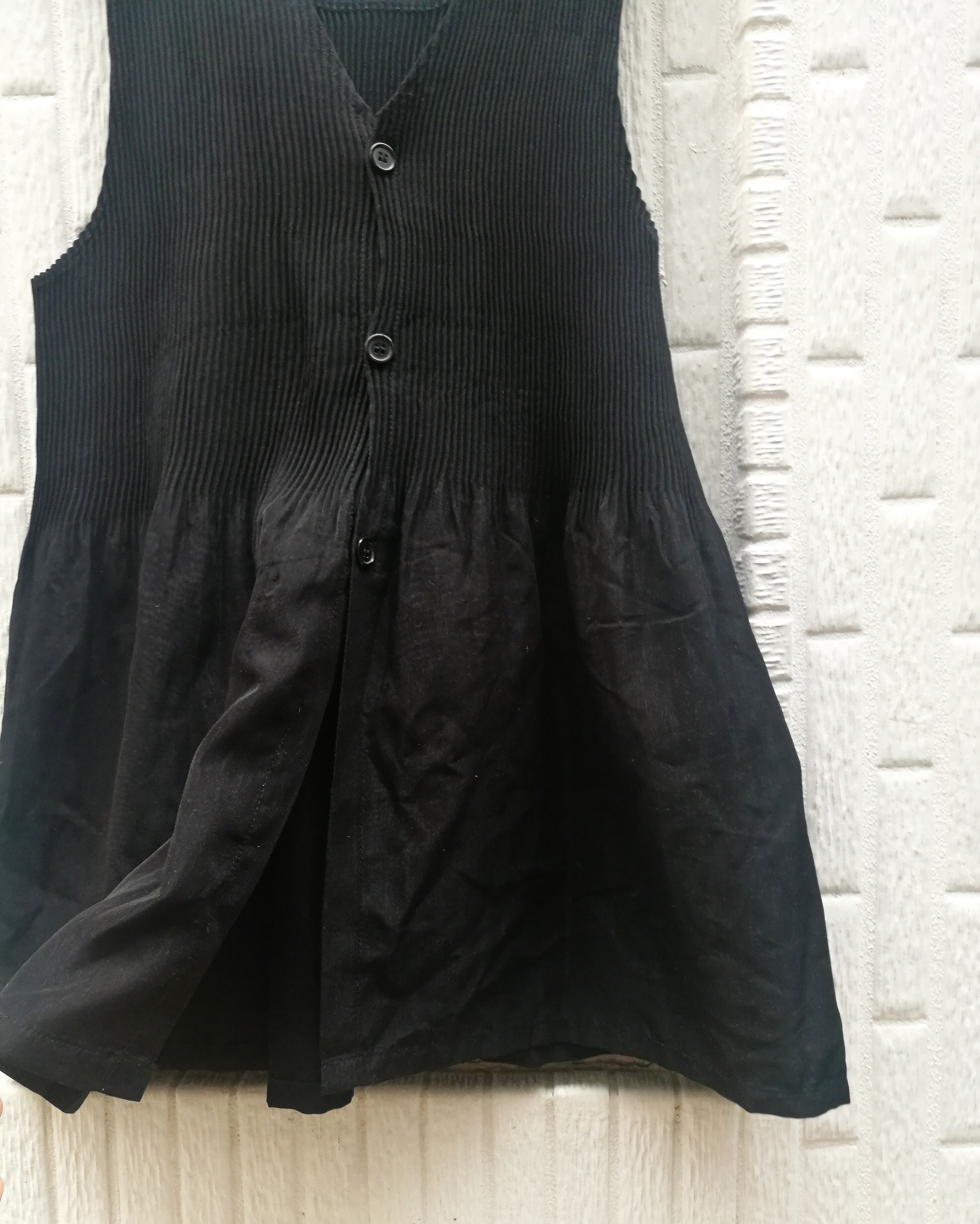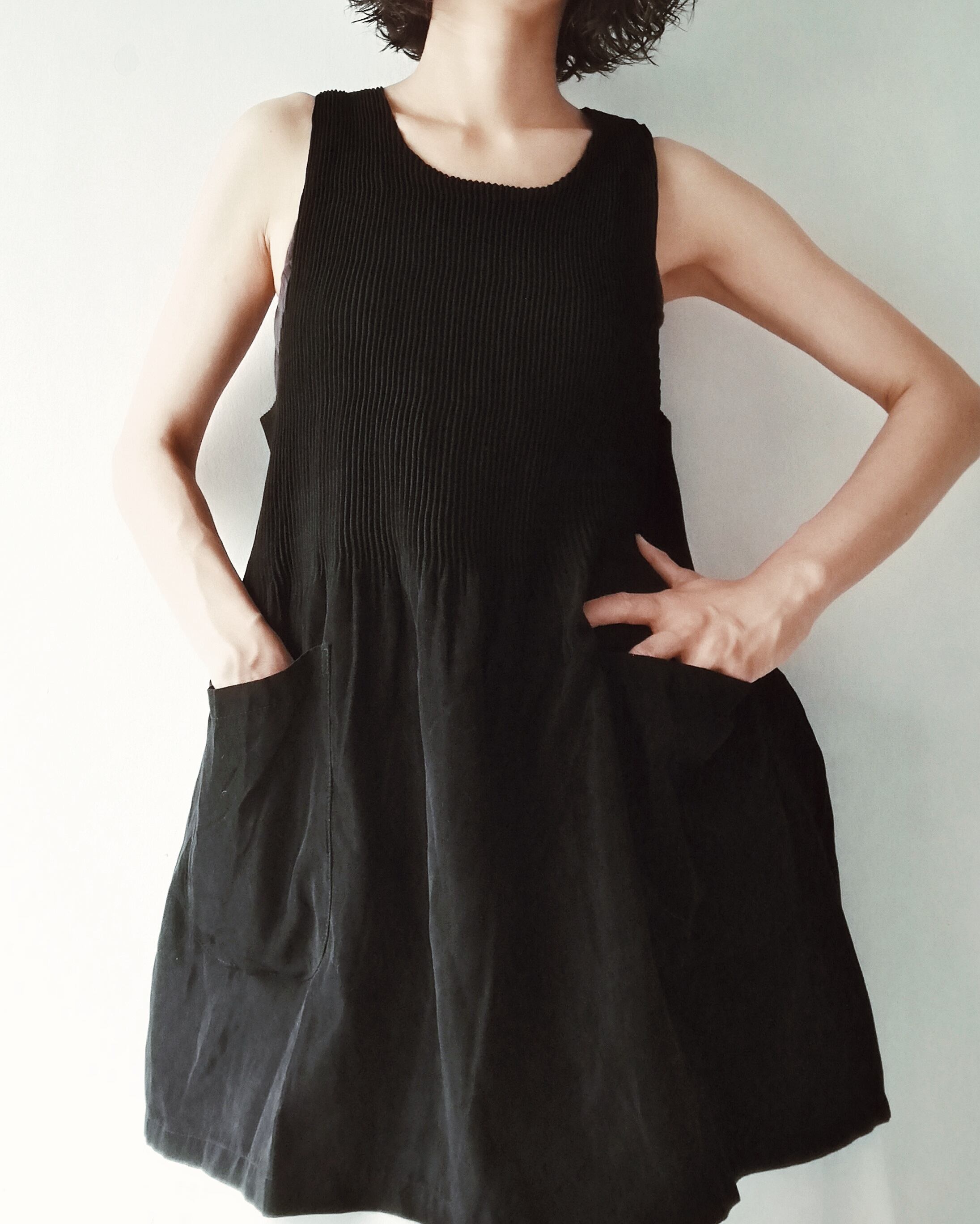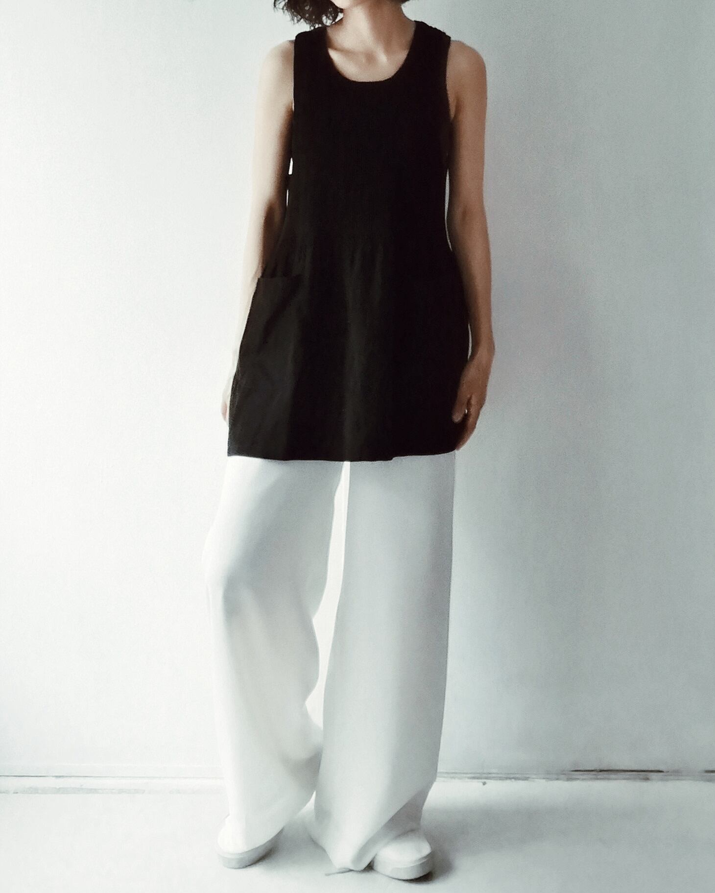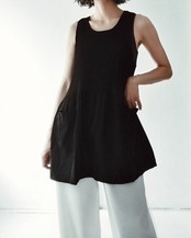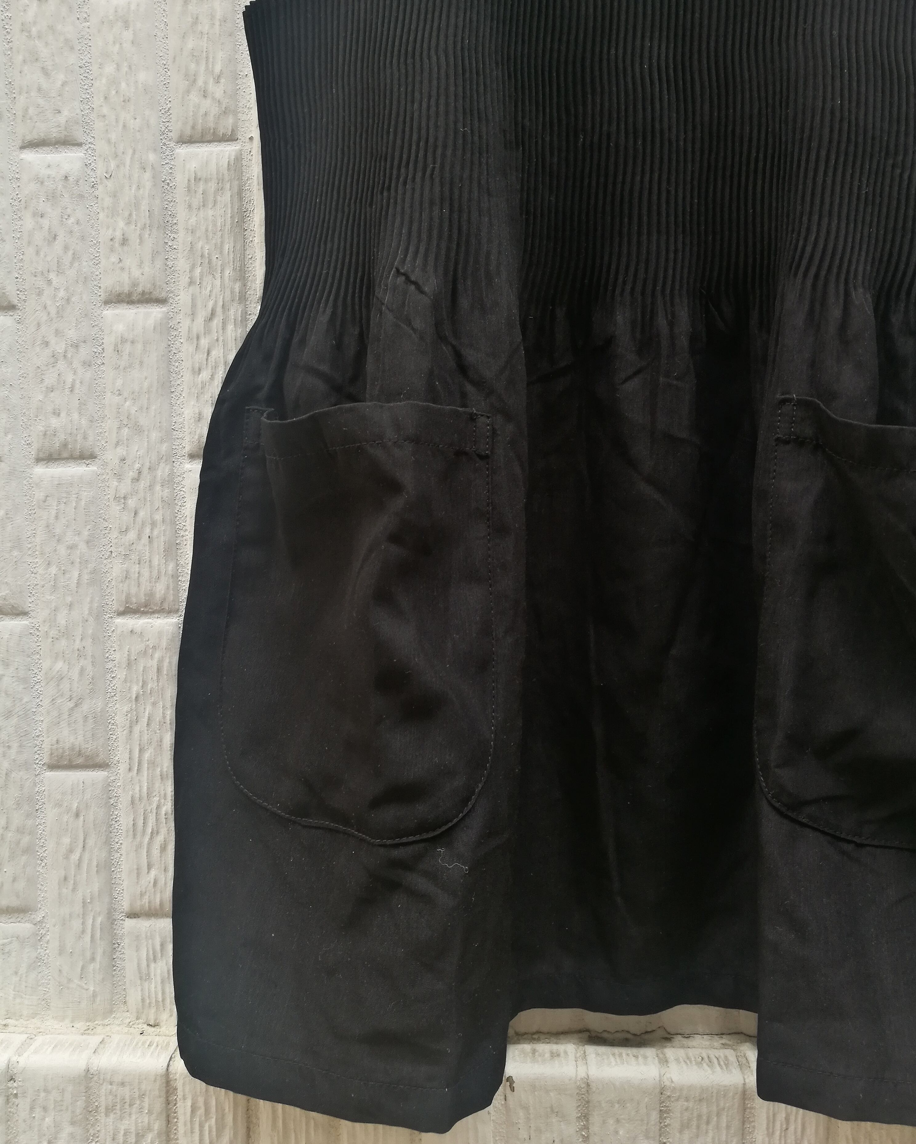 細かいプリーツがかわいいエプロンのようなノースリーブ。