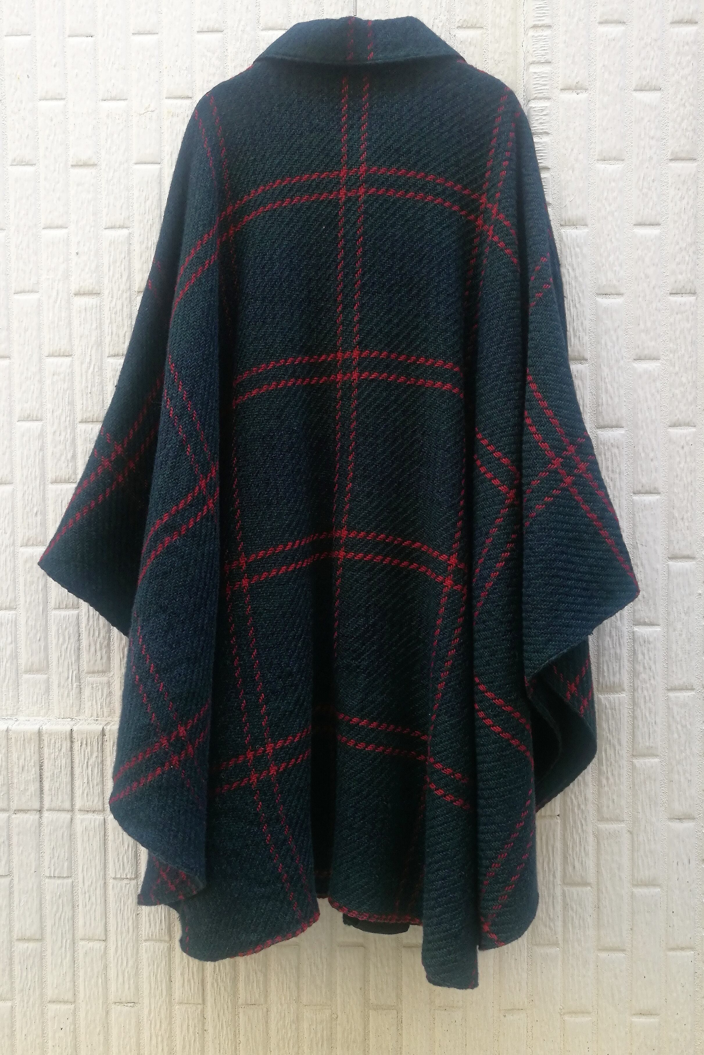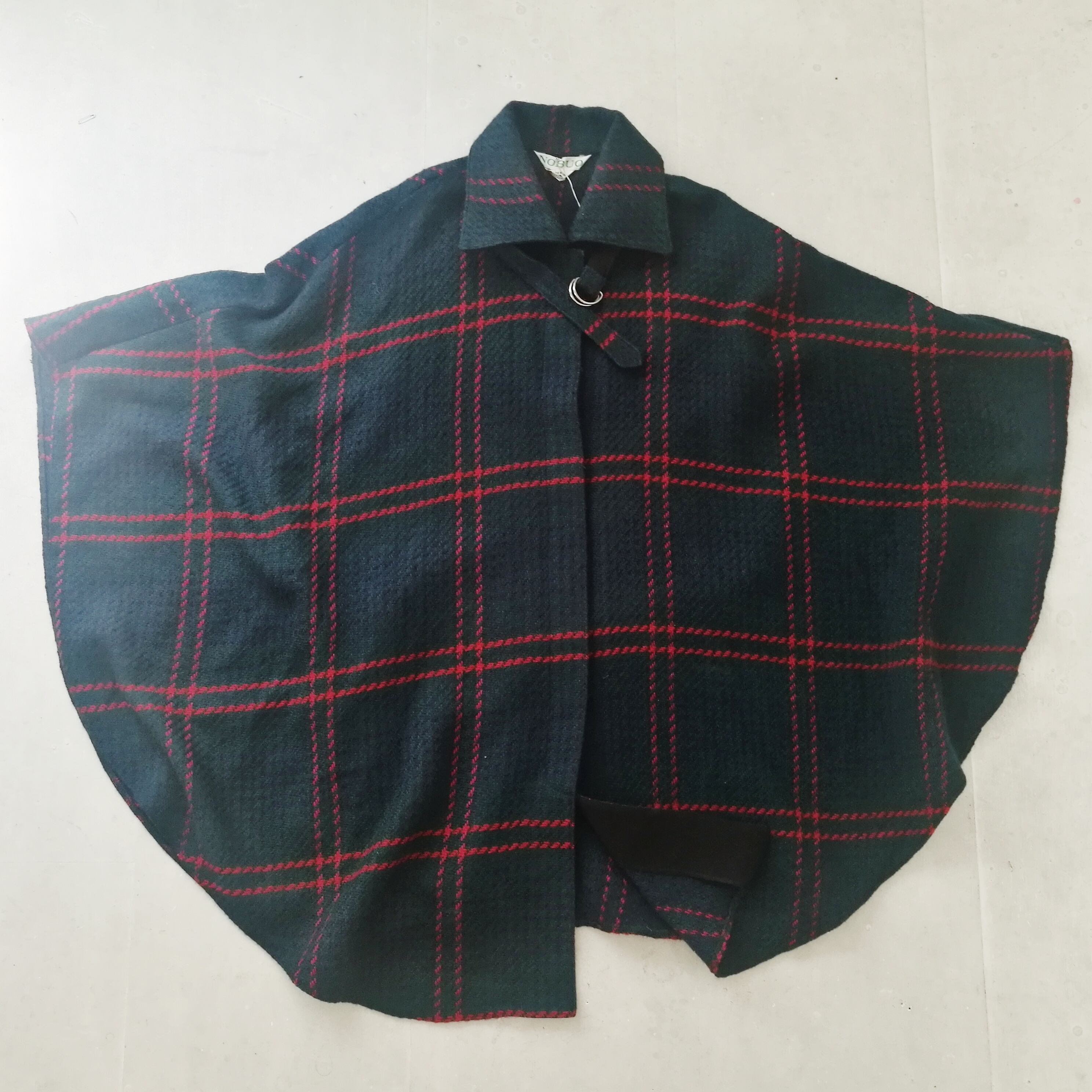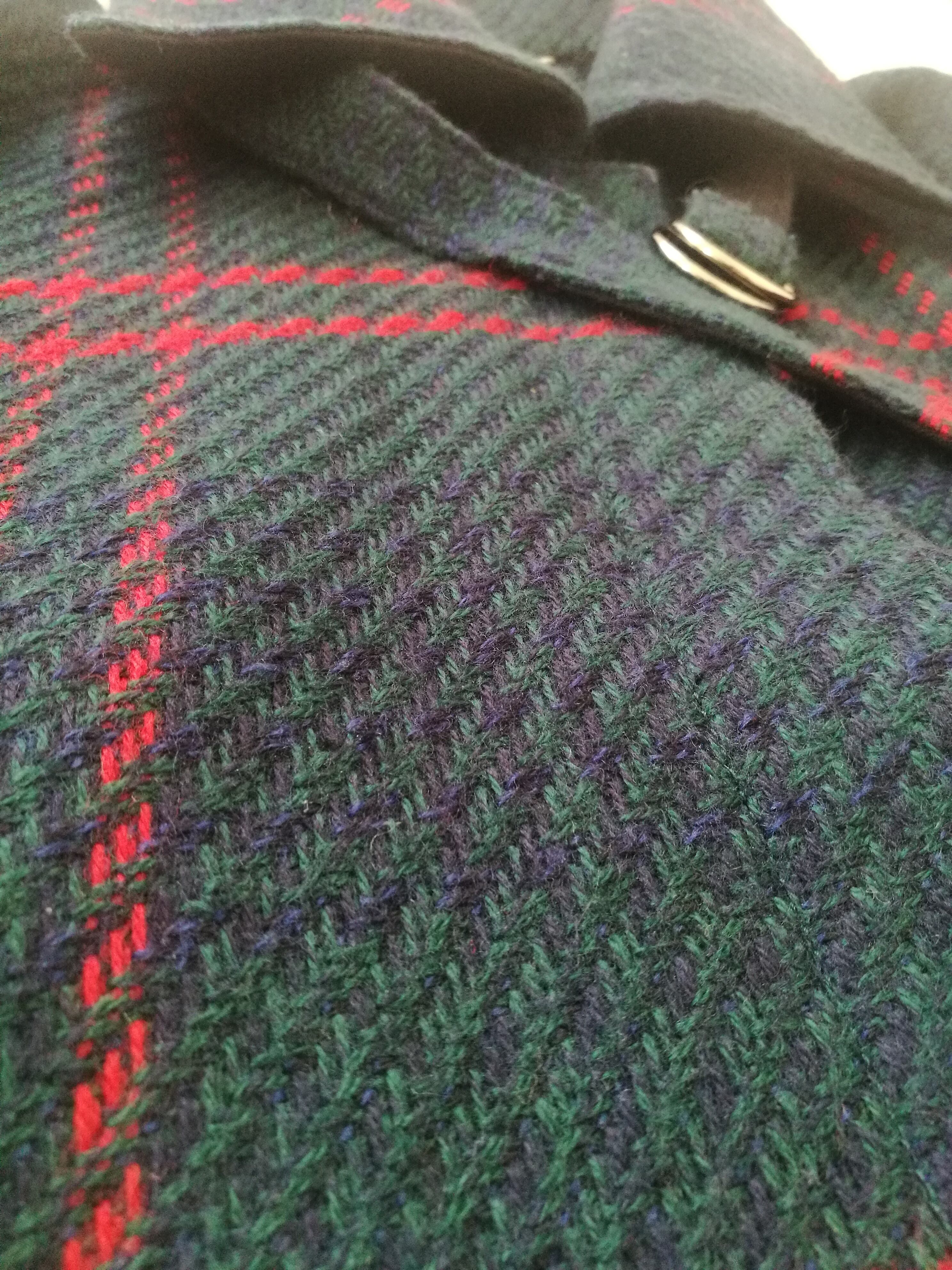 おそらくウール?のしっかりした生地にボタンとバックルが付いています。生地をたくさん使っているので歩くと動きが出てかわいいです。ニットもコートの上にも使えるアイテムです。