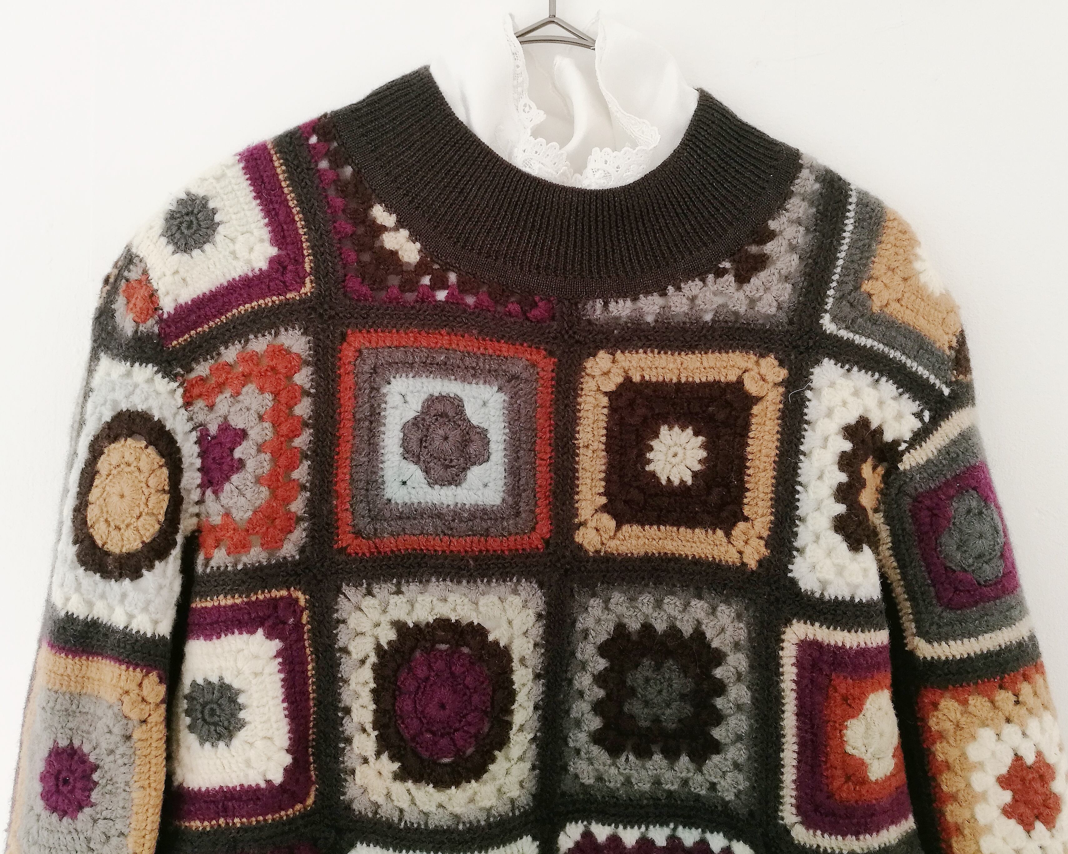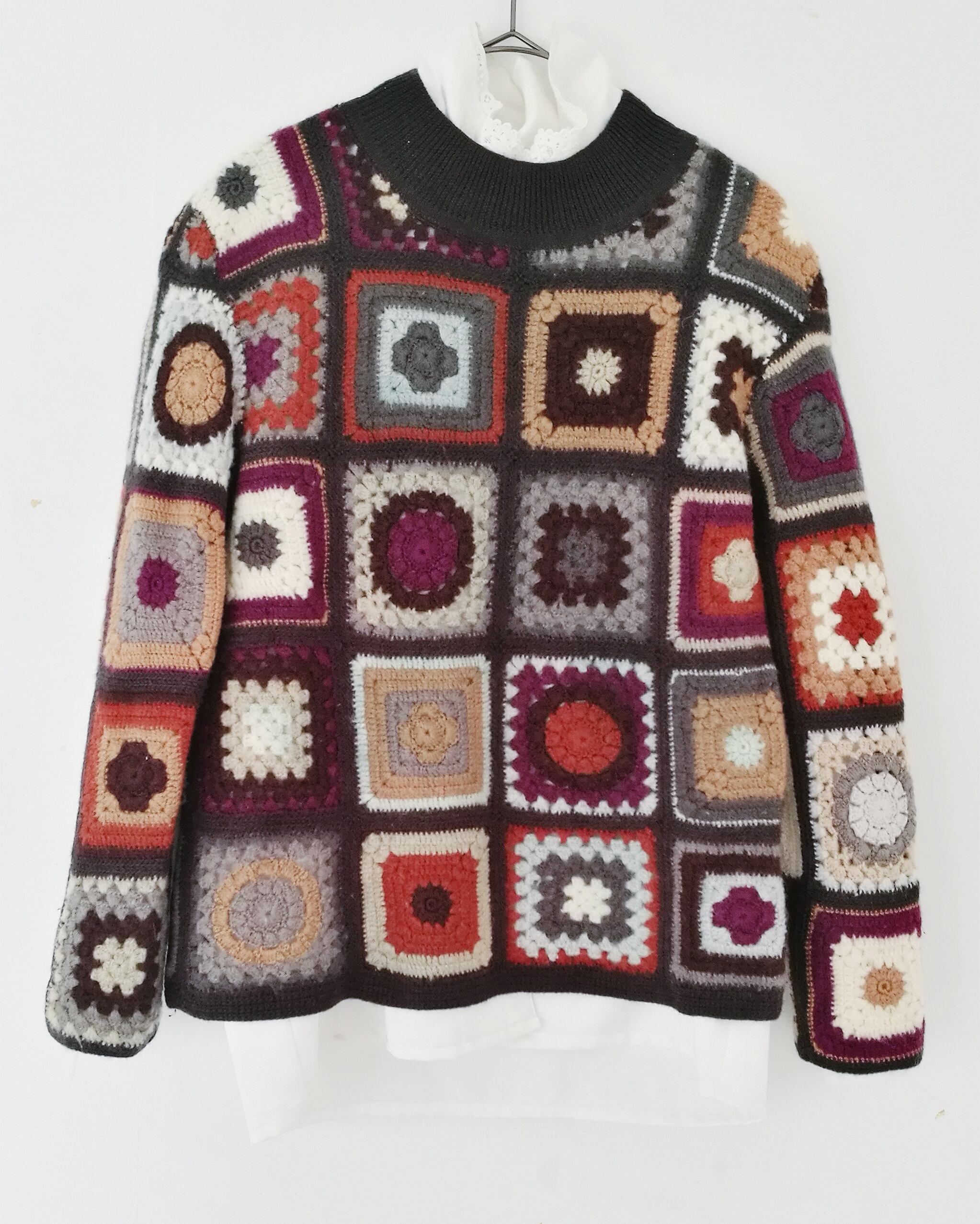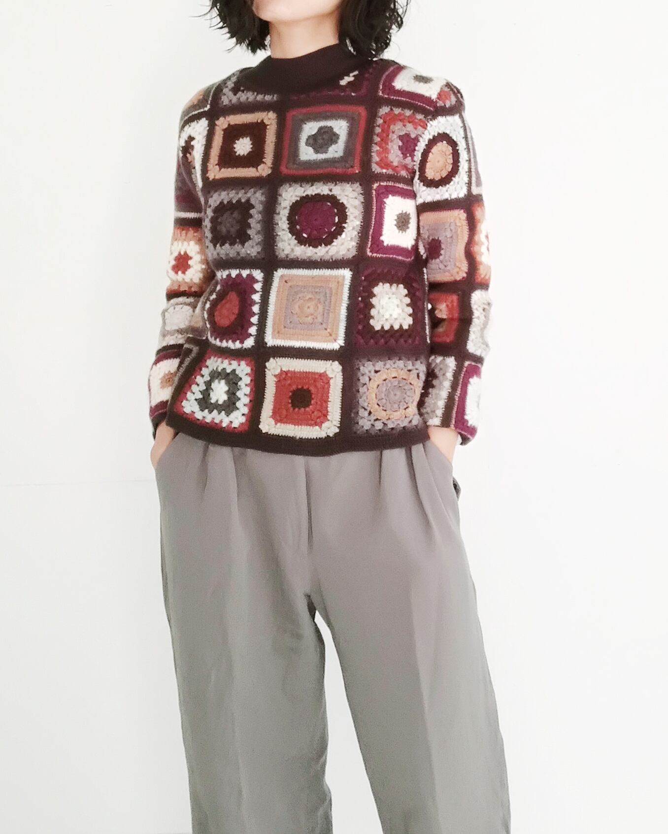 アースカラーのパッチワークニット。