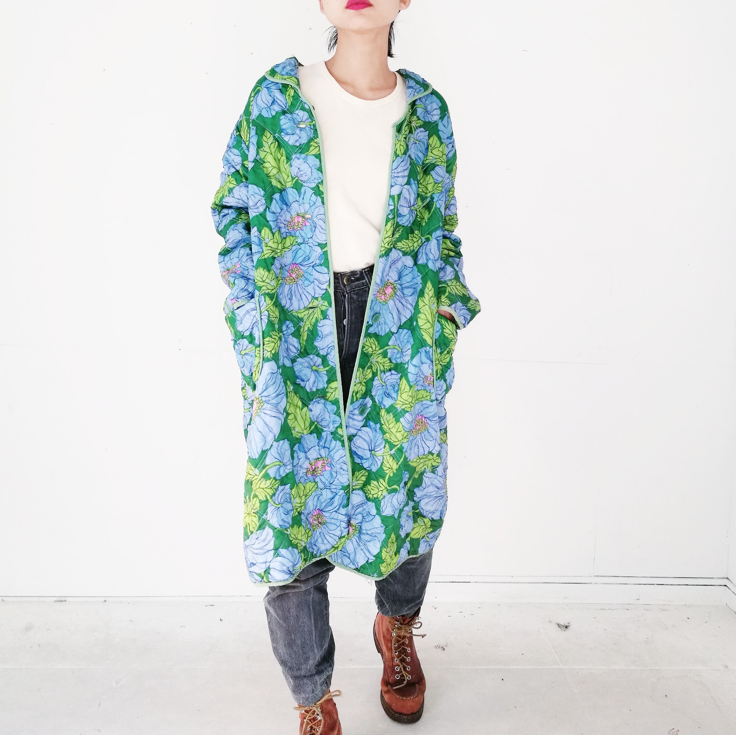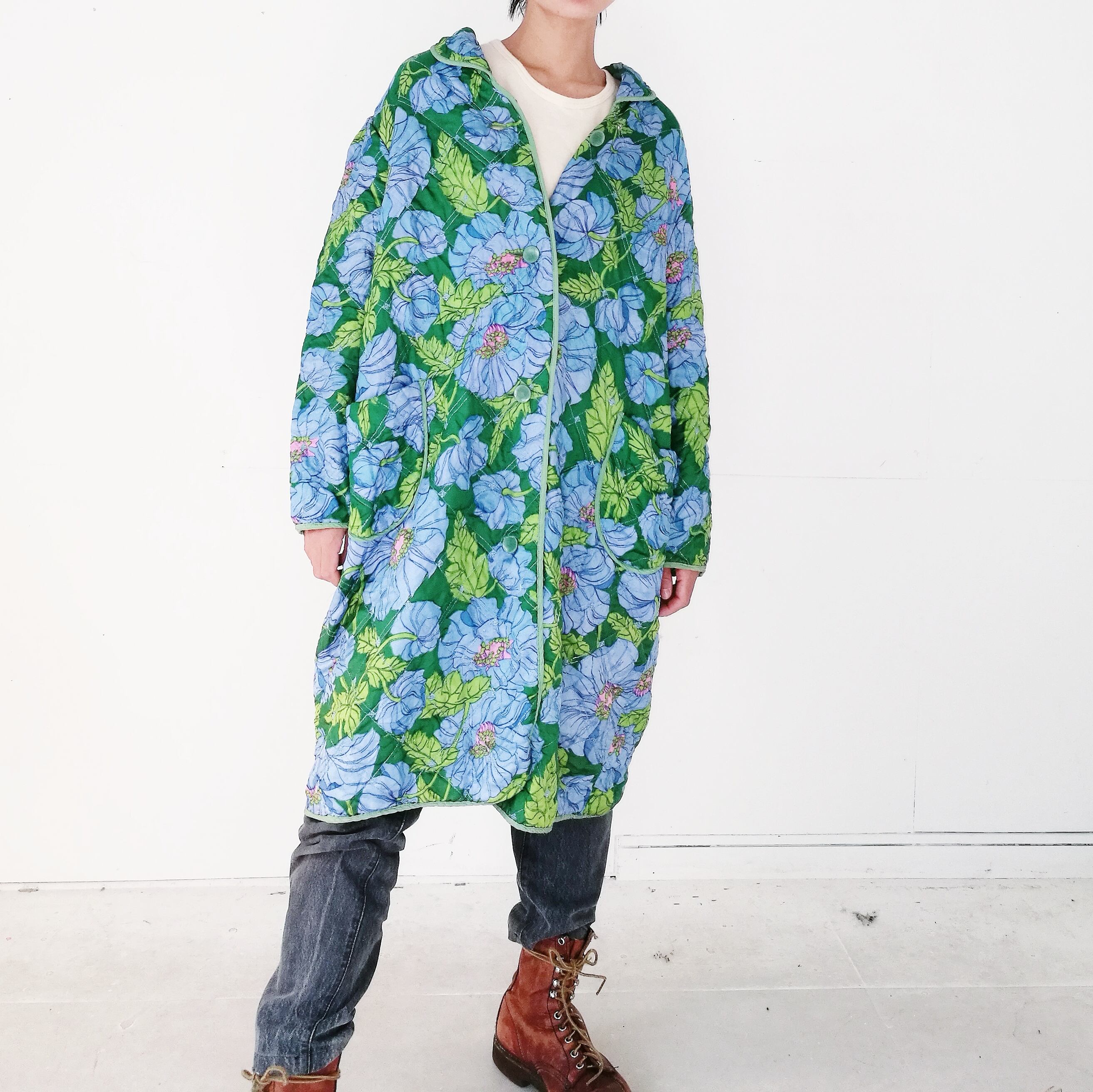 発色の良いレトロな花柄が心躍ります。中綿ですがわりと軽めで秋~春にかけてロングシーズン使えそう。ウエストマークしてワンピースのように着ても◎外に出るのが楽しくなる主役アウターです!