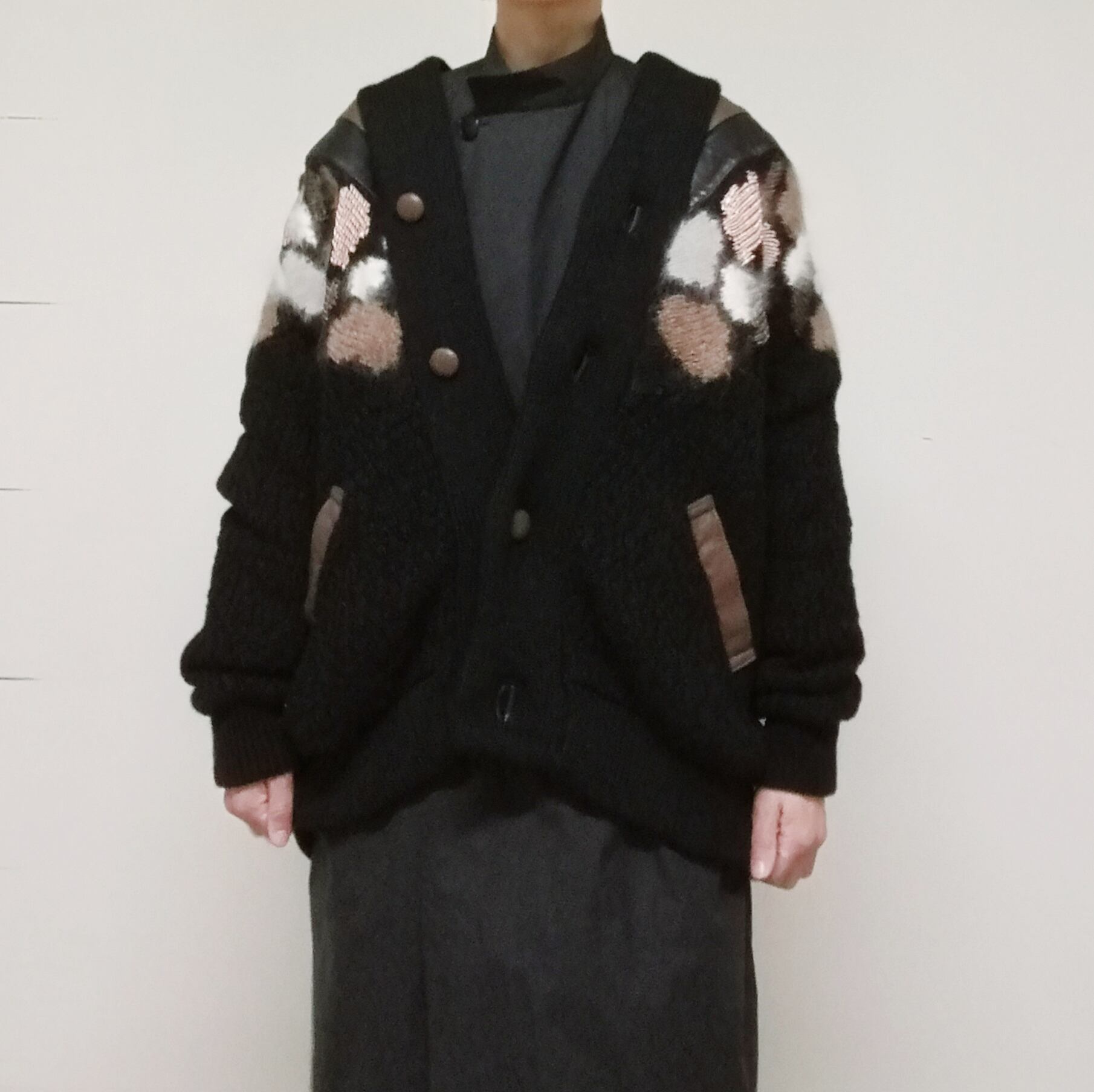 リアルレザーが入ったボリュームニットアウター。