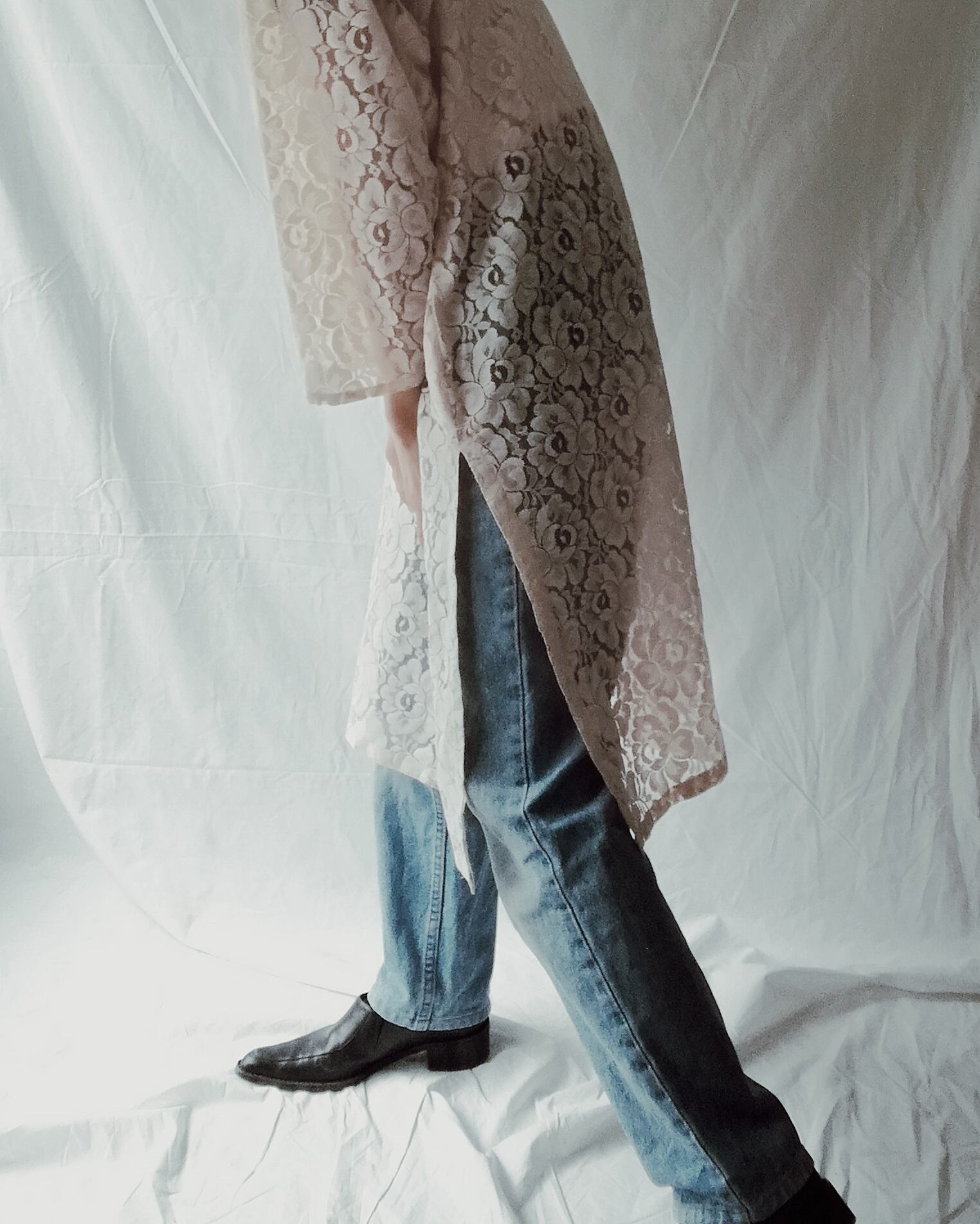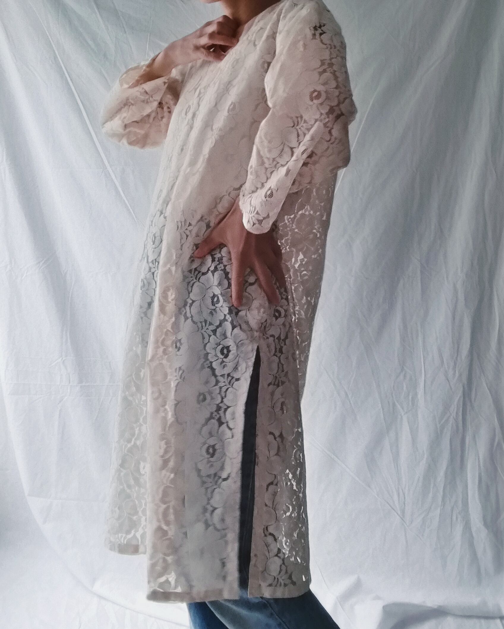 サイドに深くスリットが入った総レースワンピース。首回りの曲線のディテールが素敵。