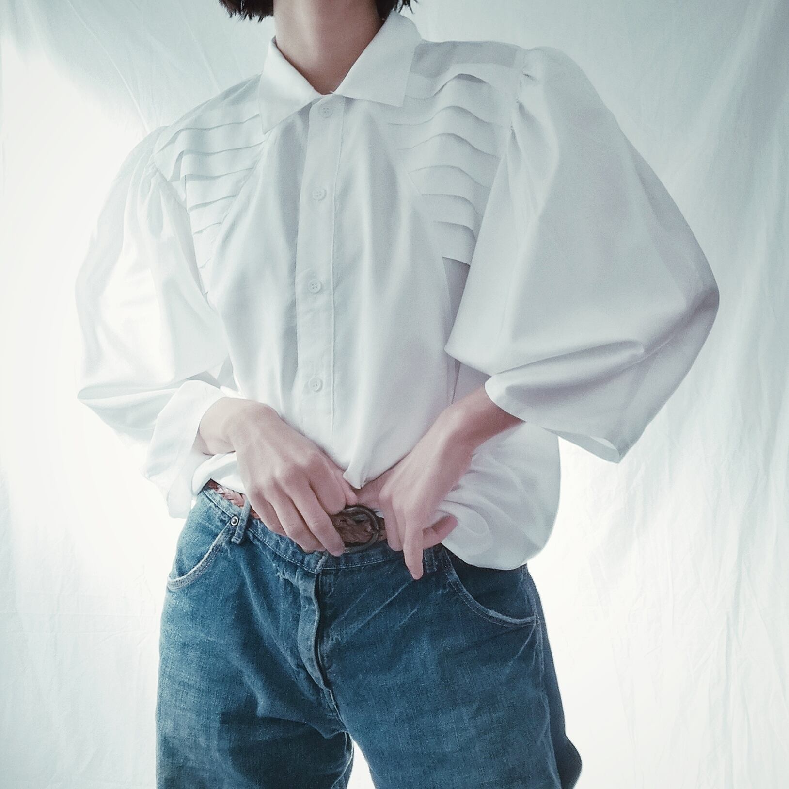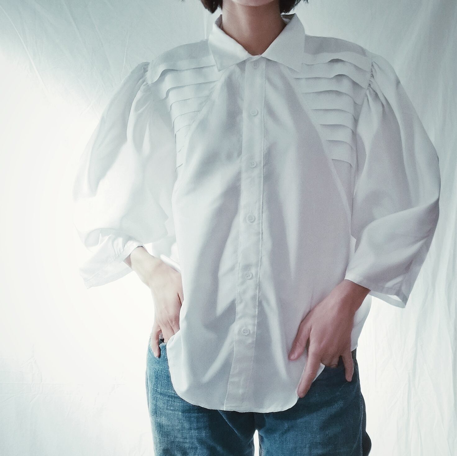 ドルマンスリーブのボリューム満点な白ブラウス。