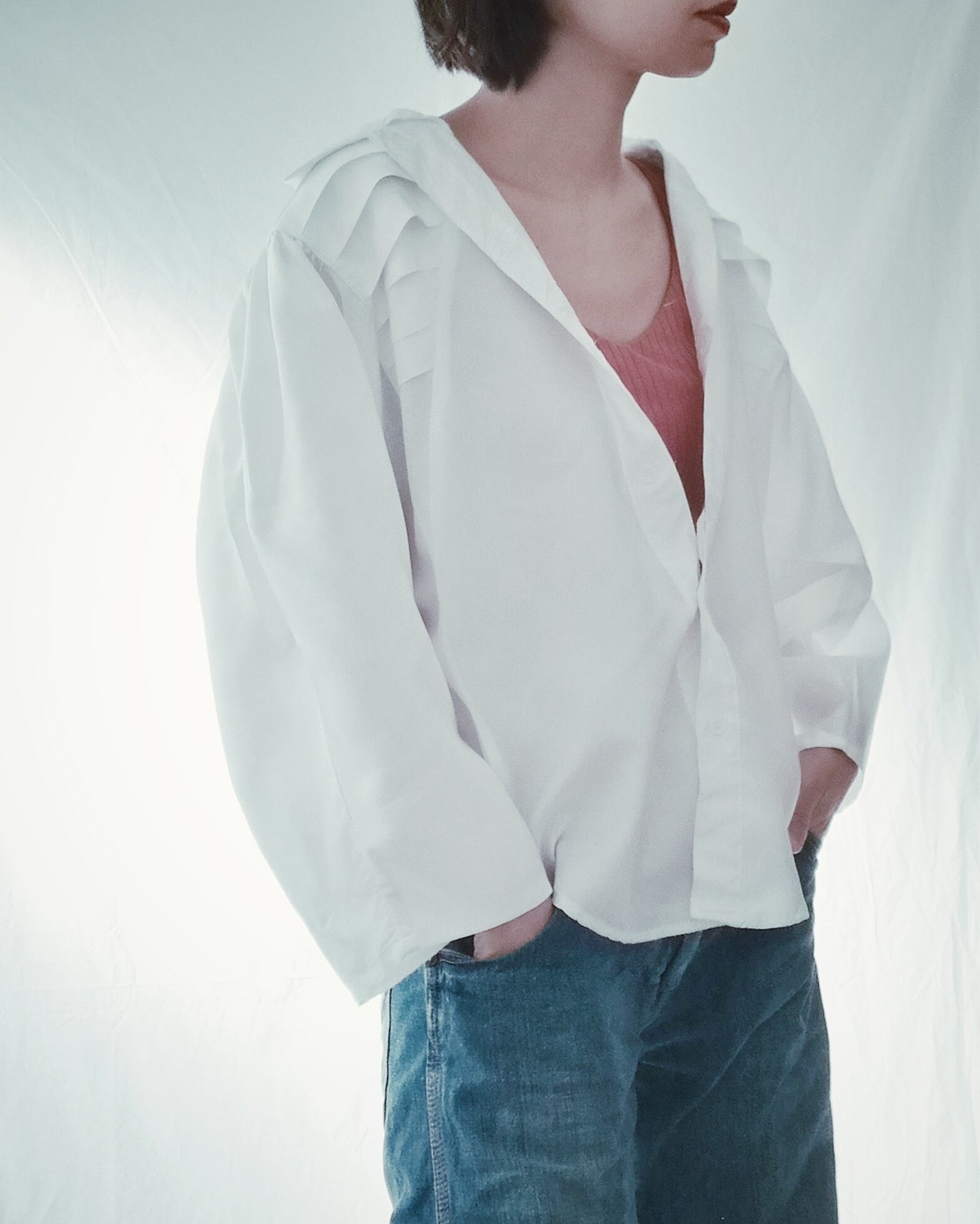 袖は7分丈でロールアップしてもかわいいです。シンプルにデニムと合わせて、白ブラウスのデザイン性を際立たせるのも◎