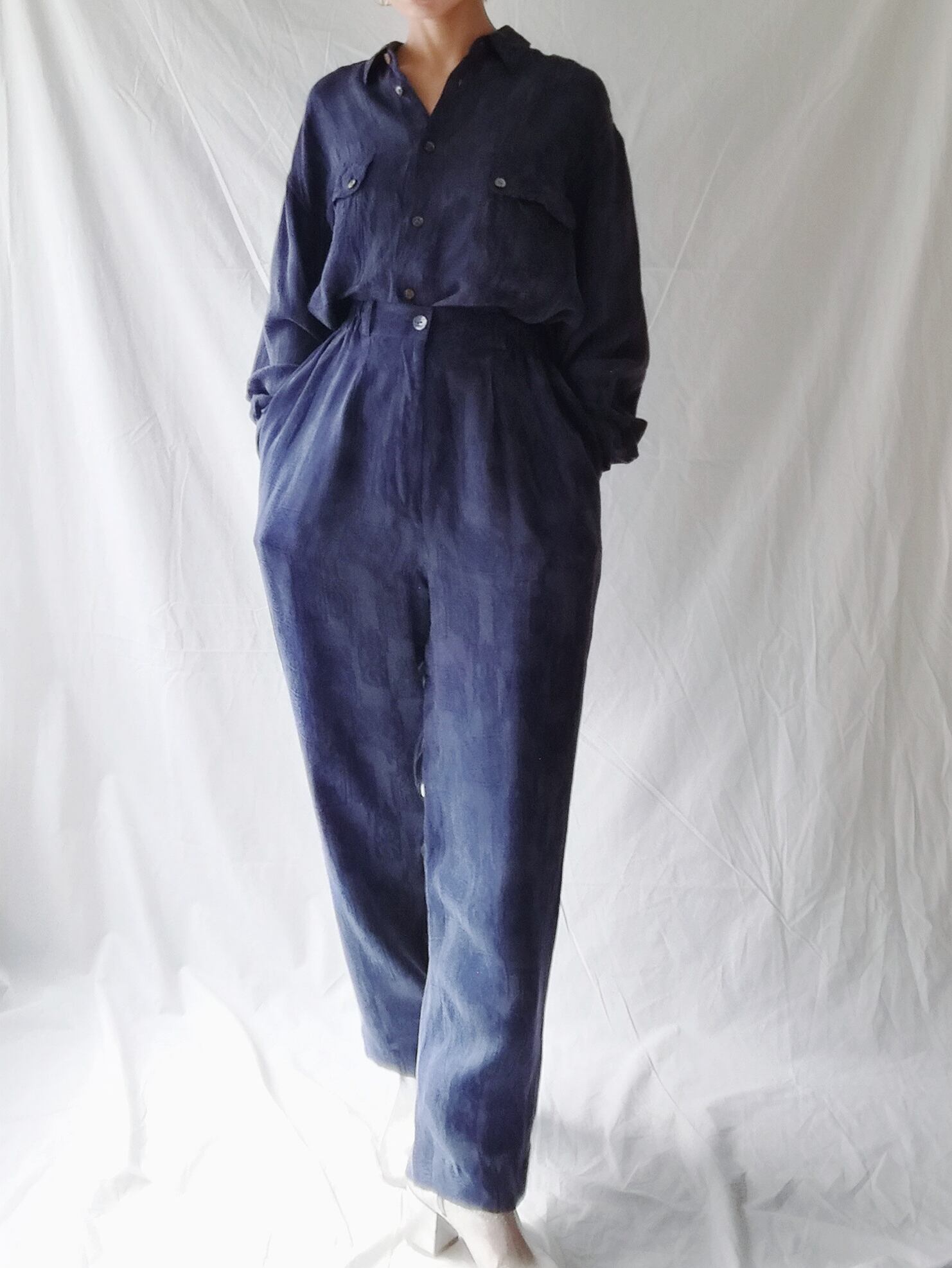 別々でも着まわせますがやっぱりセットアップで着たい。シャツをインするとジャンプスーツのようにも見えて素敵。インナーにブラウスを持ってきてシャツをジャケットっぽくしても◎