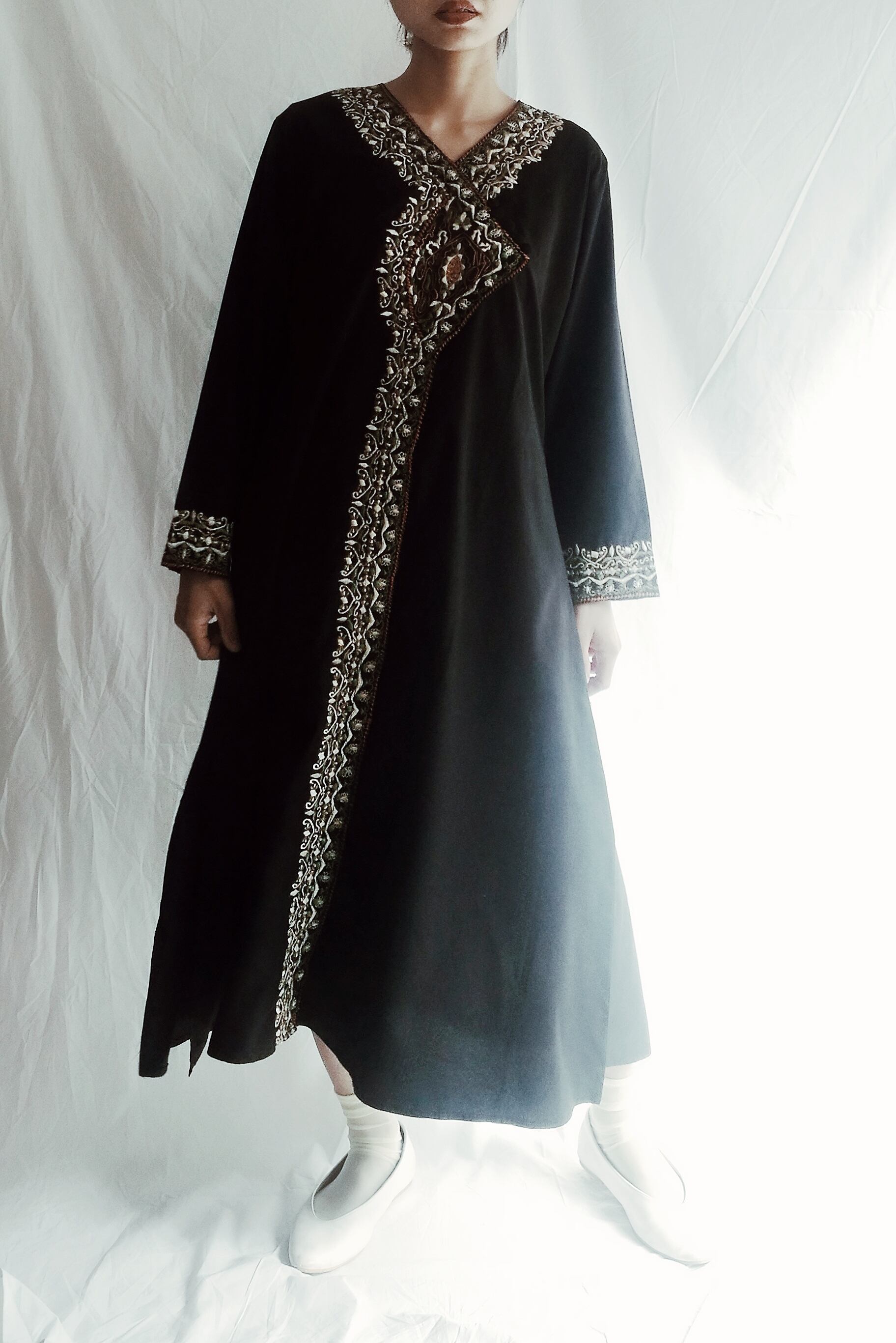 黒地に刺繍がきれいなエスニックワンピース。袖の広がりやサイドに深く入ったスリットが素敵。ボトムスの重ね着でコーディネートが楽しめます。
