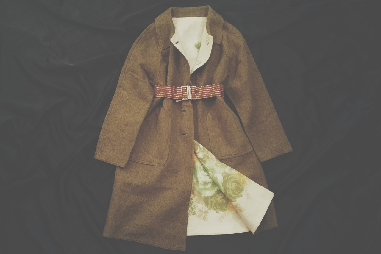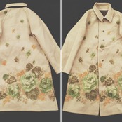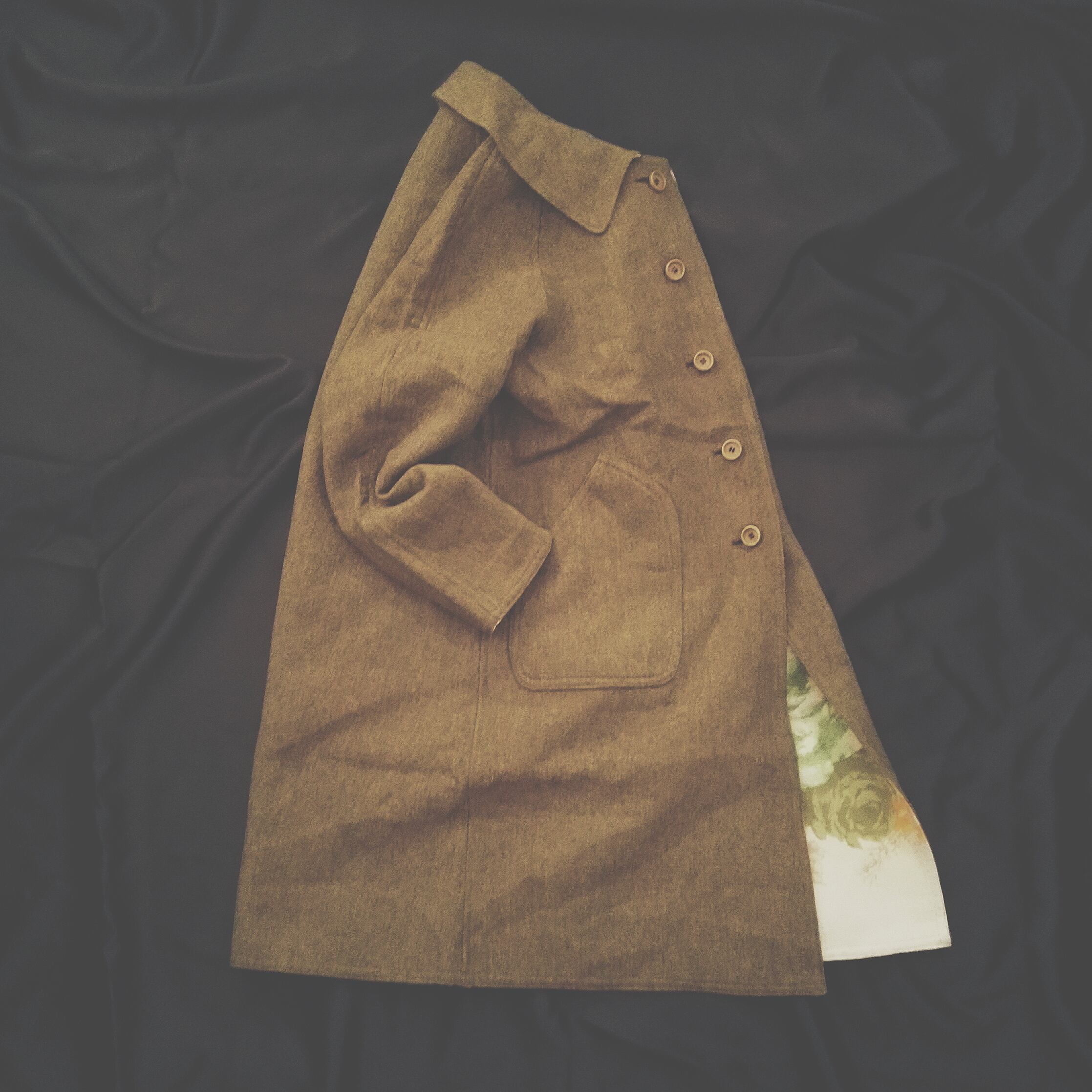 グリーンと花柄のリバーシブルコート。厚さやずっしり感はあまりなく、わりと軽めに着られます。そのままでも形きれいですが、ベルトでアレンジを加えて遊ぶのも素敵です。(画像ベルト別売り) 一着で表と裏と楽しめるコートです。