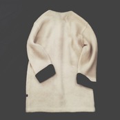 白地に黒の襟と袖口。ポケットのビビットカラーが目を引くコートです。