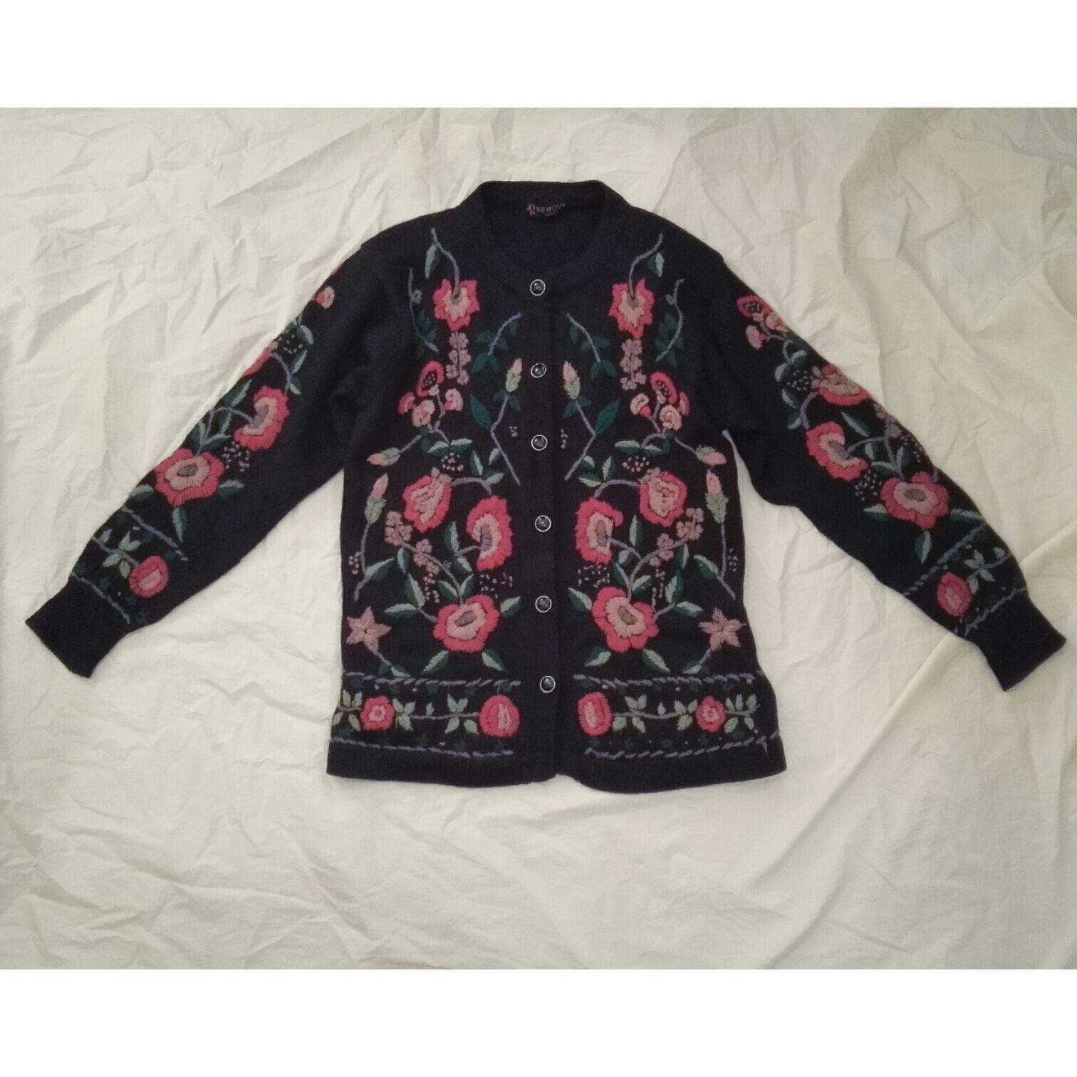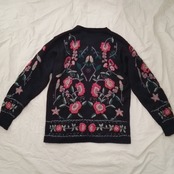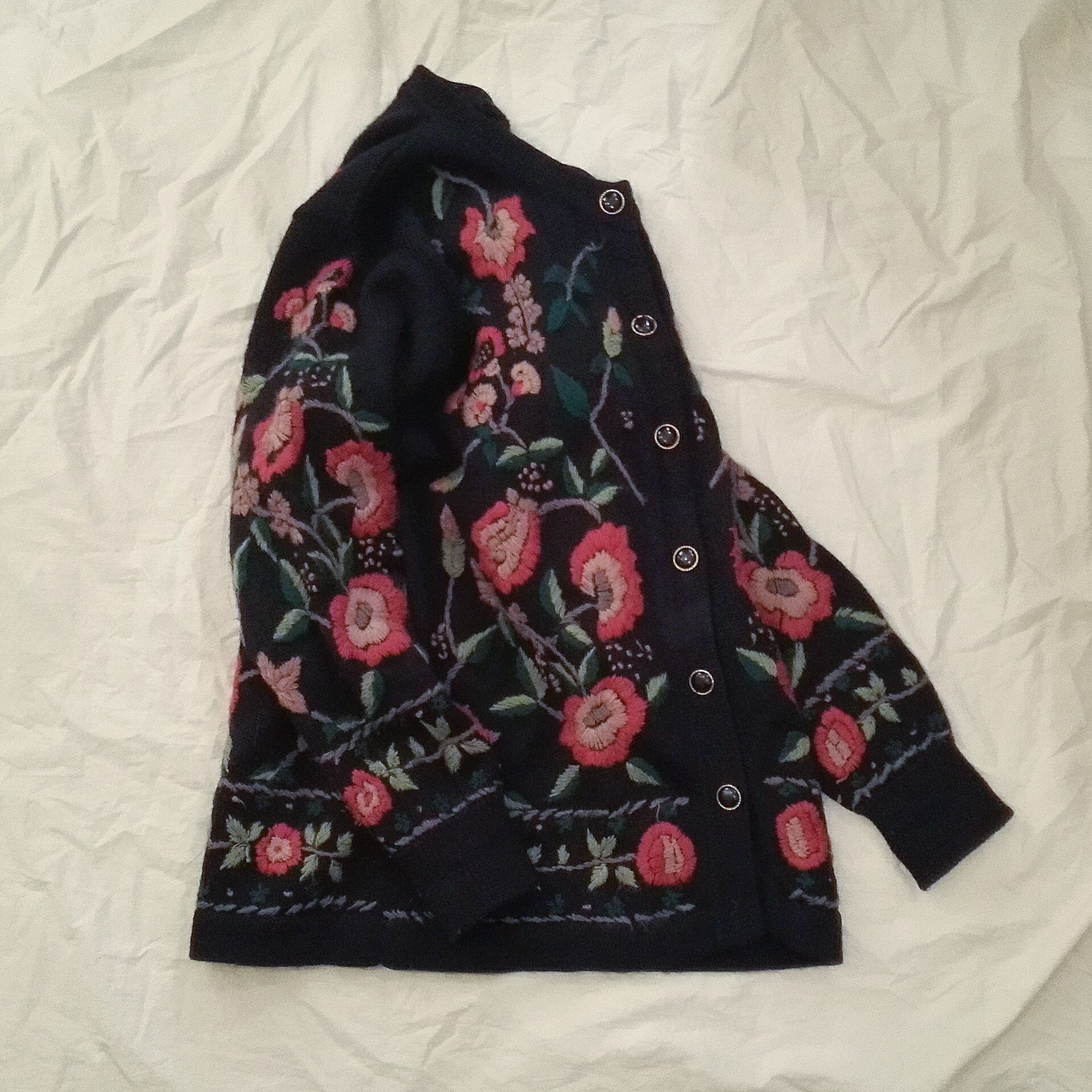 ネイビー地にピンクのお花が映える刺繍ニット。一番下のボタンがないです。裾にリブはなくボリュームもないので着膨れすることなくコートも羽織れます。