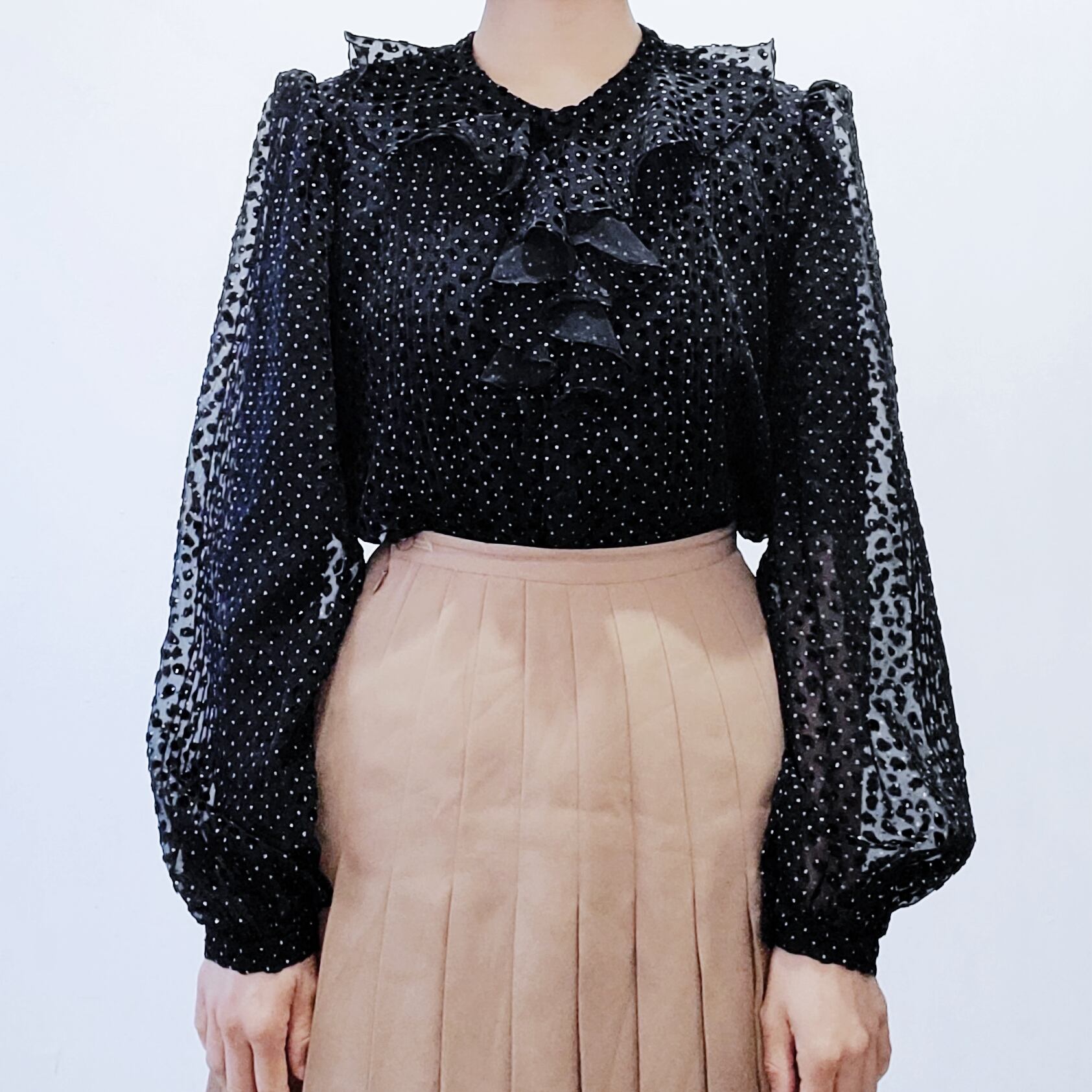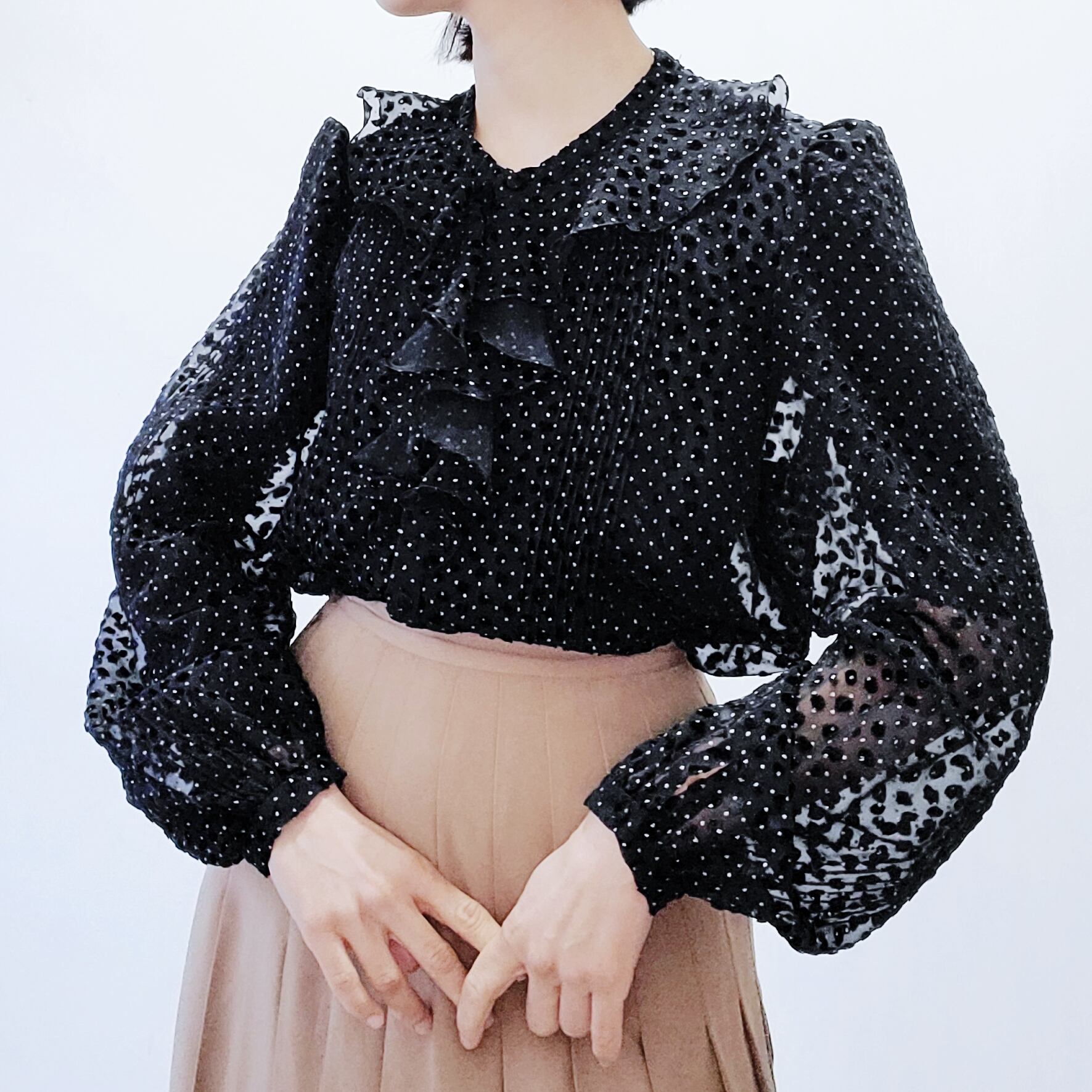 パイルのドットとゴールドのドットプリントが重なった透け感のあるシアーブラウス.