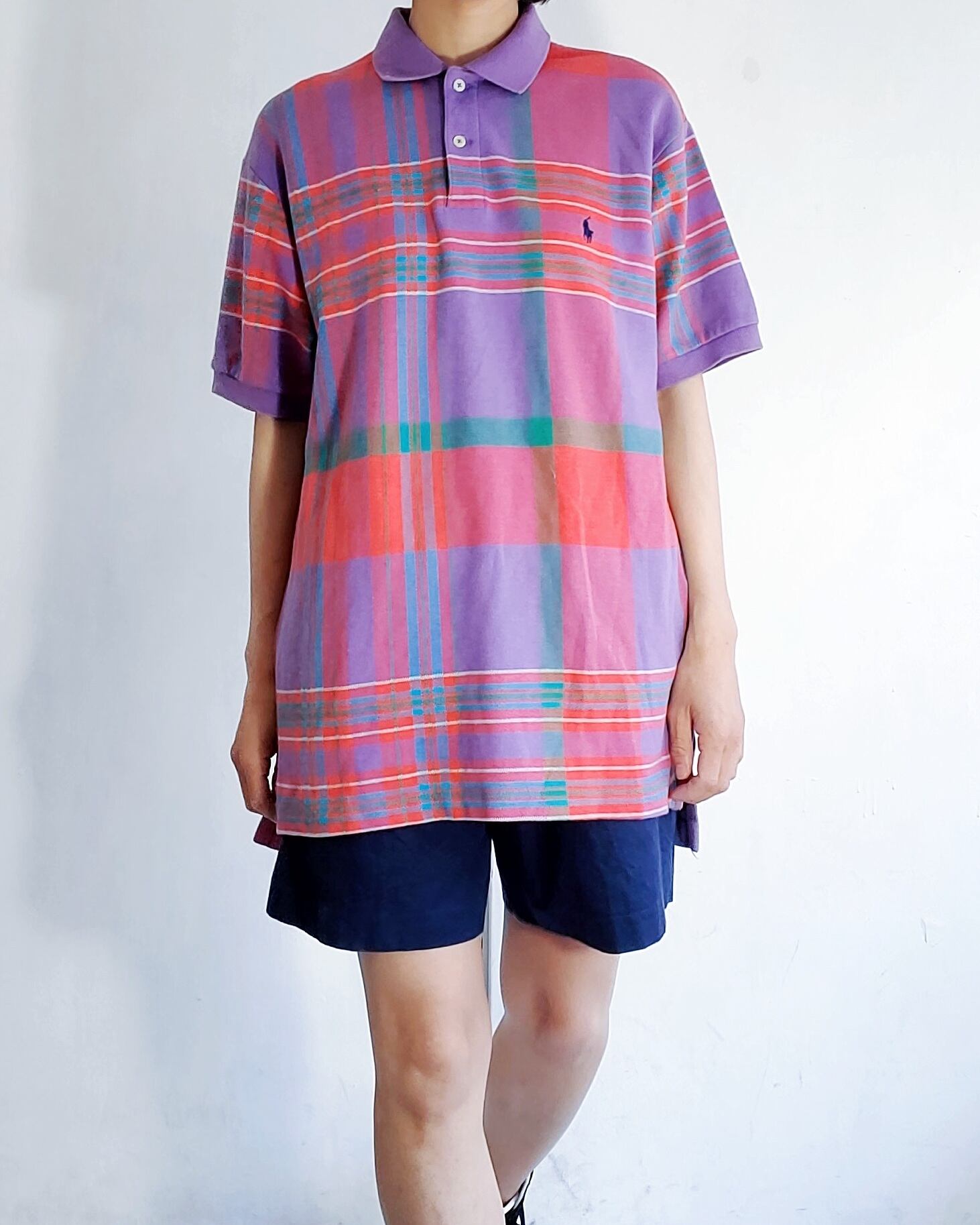 made in USA 90sラルフローレンチェック柄のポロシャツ。サイズはメンズのMですが、ビックシルエットがかわいく小柄な方でも挑戦できます。全体的にすこし色褪せが見られますが古着の味としてお楽しみいただける範囲です。古着に慣れていない方はお控えください。