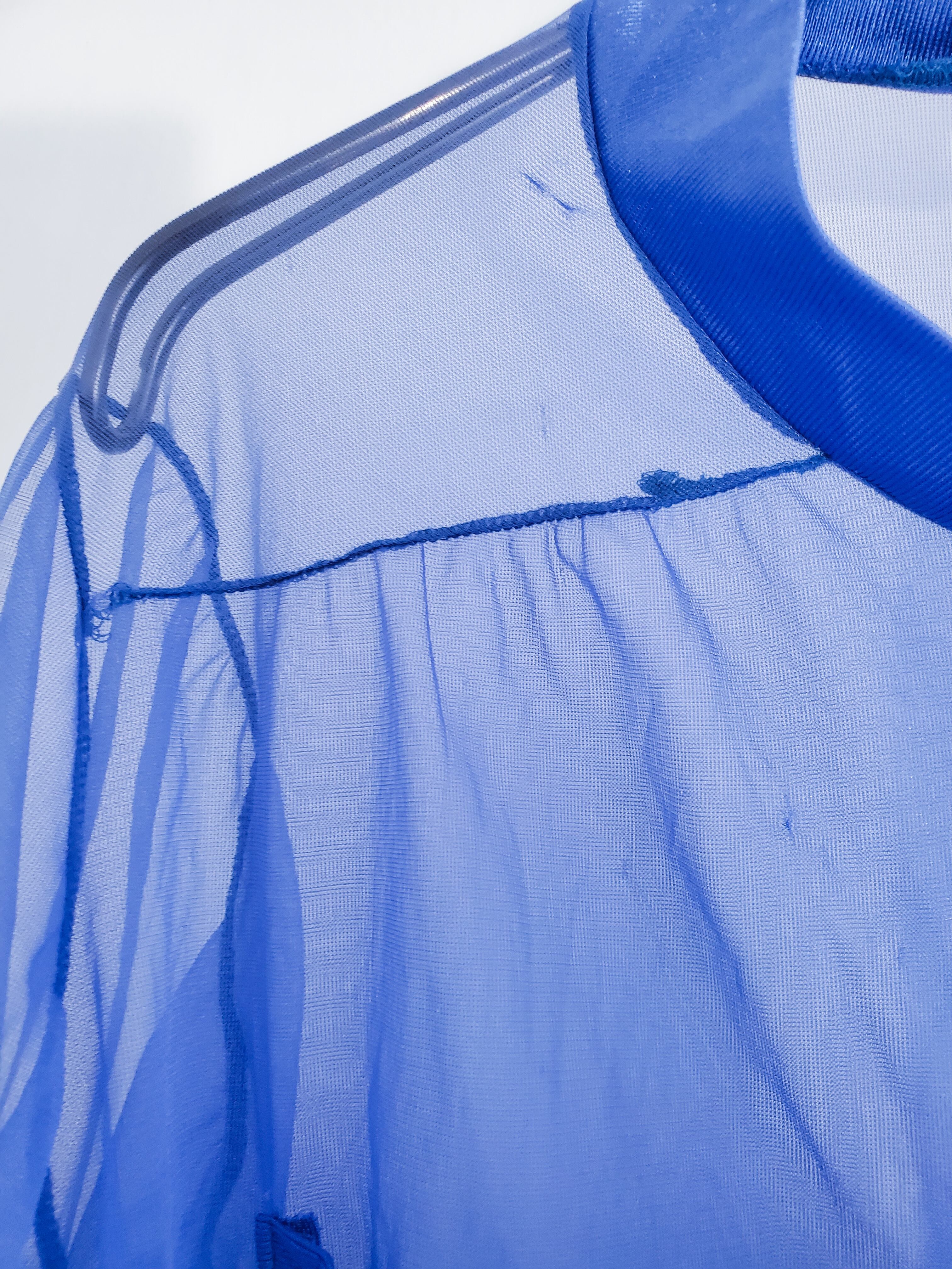 サテンの大きなポケットが特徴のシアーチュールブラウス。Tシャツやタンクトップに合わせて着たい◎チュールの劣化が全体的に見られます。ダメージを古着の味としてお楽しみいただける方や手を加えてお楽しみいただける方にお届けできたらと思います。古着に慣れていない方はお控えください。